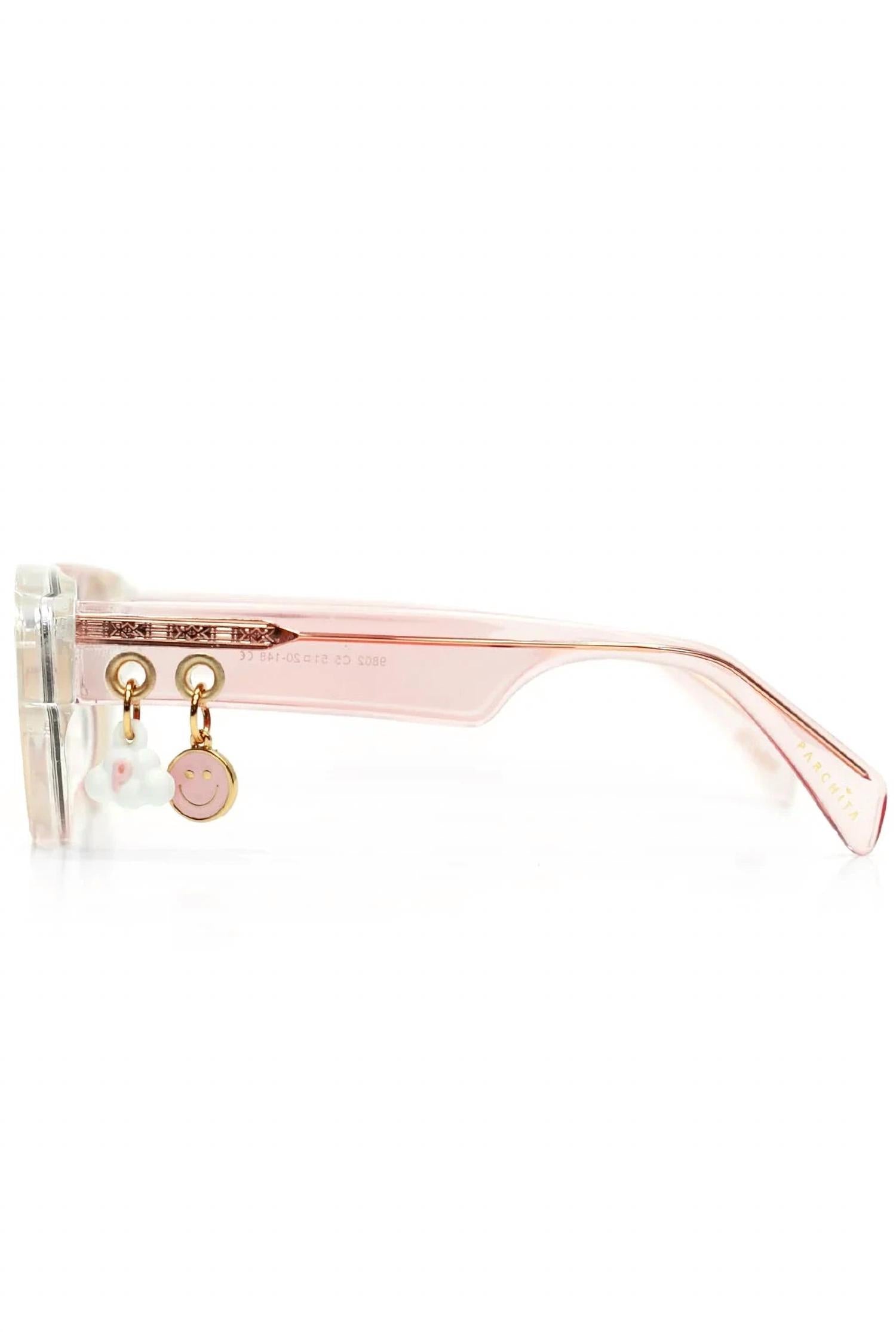 Blending fashion and practicality, these stylish shades are chic and mandatory. Stand out from the crowd and safeguard your vision with these stand-out sunglasses. Discover the Parchita Pink Skies Sunglasses, a stunning accessory inspired by the tranquility of a clear horizon. These rounded glasses feature a TR90 pink and transparent polycarbonate frame with charming gold appliqué, cloud, and smiley face charms. The orange polycarbonate lenses offer UV 400 protection to shield your eyes from the sun's rays. Made in Colombia, these sunglasses come with a custom pouch, box, and microfiber cloth for safekeeping. With lens dimensions of 51 - 20 - 148 and general measurements of 143 x 48 x 148 mm, they promise a perfect fit for everyday sophistication.