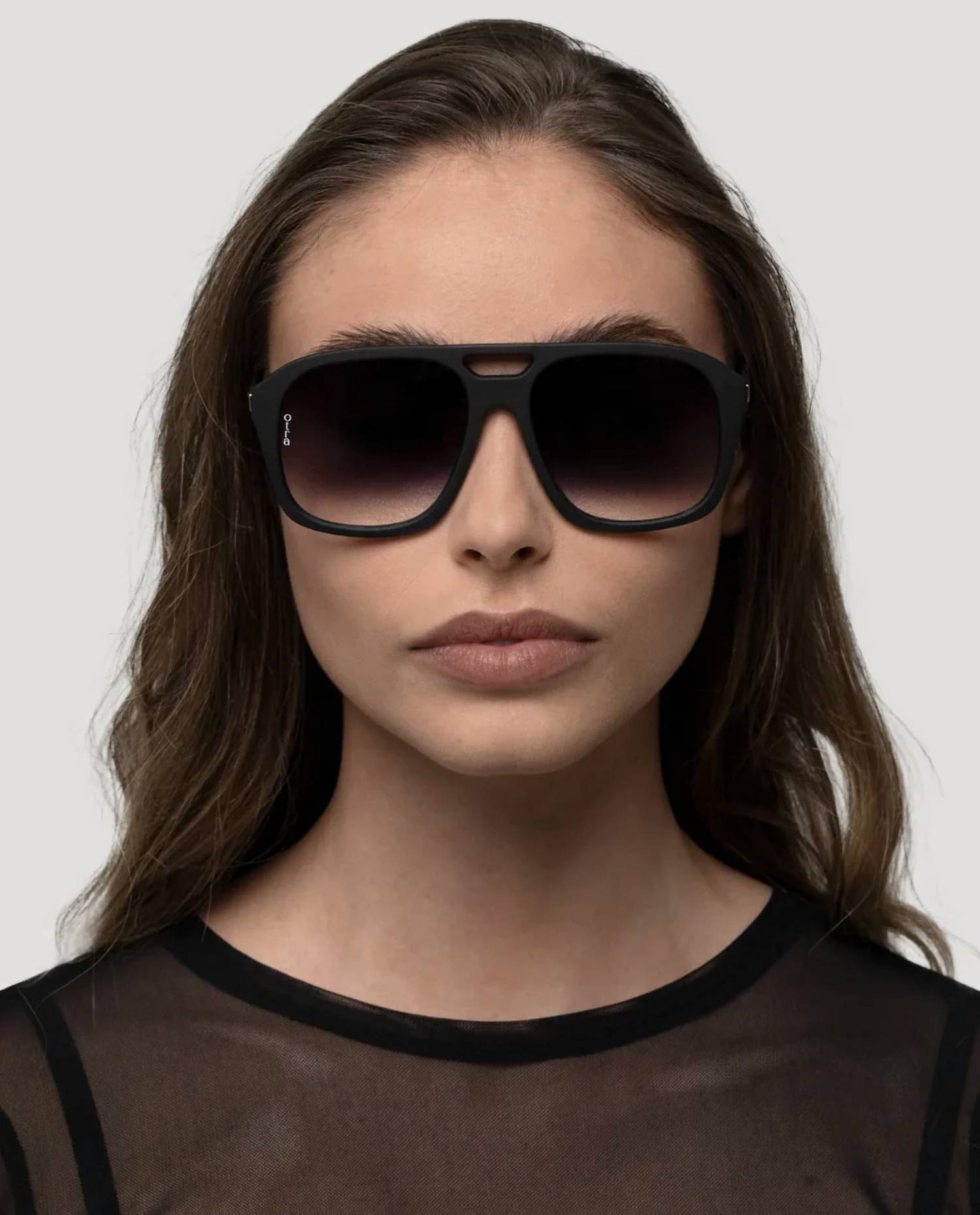 Blending fashion and practicality, these stylish shades are chic and mandatory. Stand out from the crowd and safeguard your vision with these stand-out sunglasses. Experience the Reina Sunglasses by Otra, a chic accessory embodying modern pilot style with a matte black frame and smoke fade lenses. These sunglasses offer 100% UV protection and come with a soft cream vegan case, perfect for safe storage. The frame measures 14.8 cm in width, 5.76 cm in height, and features a 1.7 cm nose bridge for a comfortable fit.