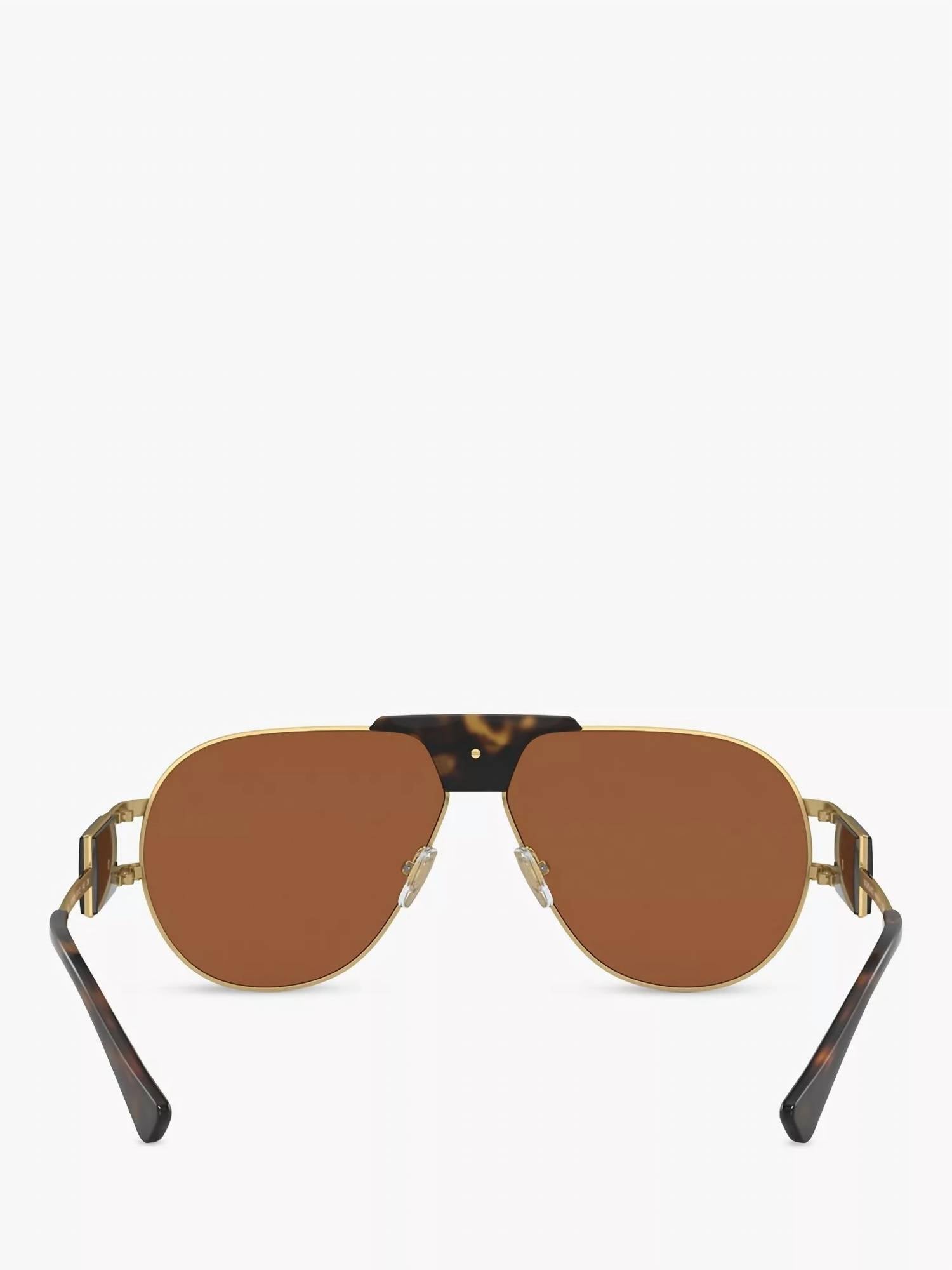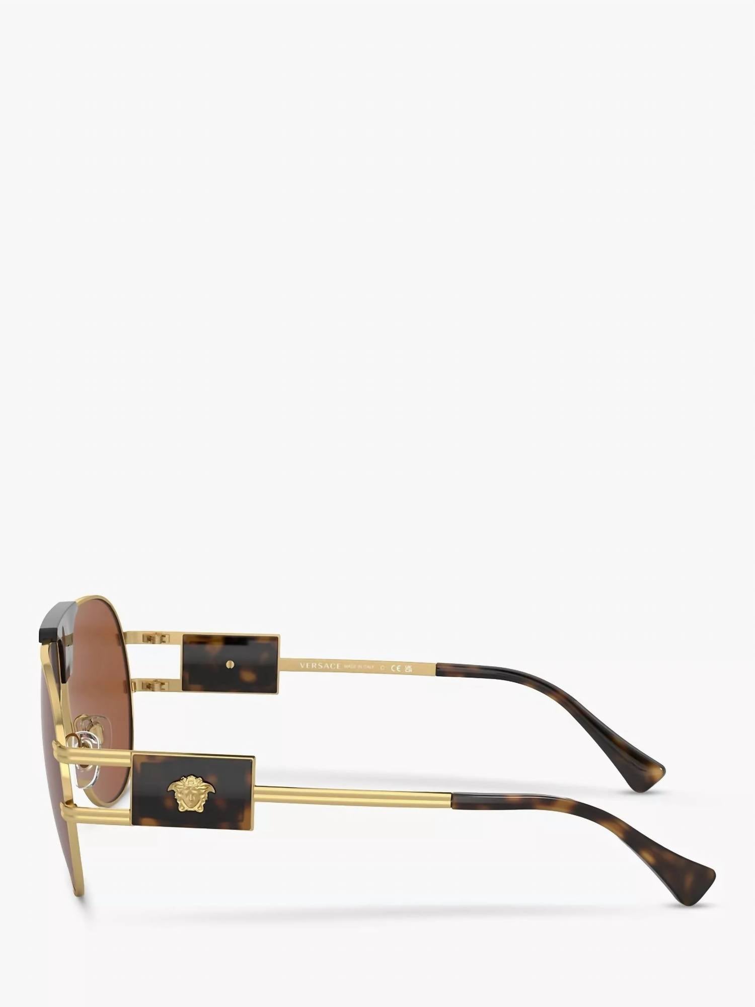 Make a statement and shield your eyes in these fashionable, yet practical sunglasses. Grab these adorable shades for your next vacation and elevate your accessory game. Experience timeless elegance with the Unisex Ve2252 Aviator Sunglasses by VERSACE, featuring a sophisticated gold and brown color palette. Crafted from durable metal, these aviator-style sunglasses offer both style and substance. Perfect for elevating any look, they capture the classic Versace allure. Embrace the iconic design and make a statement with every wear. Bridge Measurement 12mm, Lens width 63mm, Temple Measurement 145mm