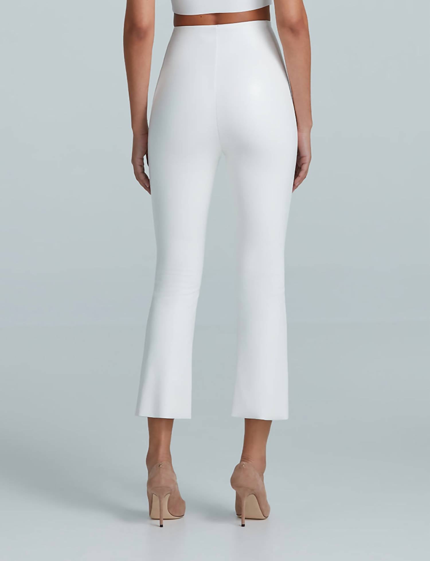 Stay on trend with these stylish boot cut pants that are fit to perfection. The perfect combination of comfort and fashion, you'll be grabbing for these all season long! Commando's Faux Leather Crop Flare Leggings in white are a standout choice for enhancing your style. Engineered from a blend of 55% polyurethane, 44% viscose, and 1% elastane, these high-rise leggings feature a cropped flared style with a real leather look and feel, complete with four-way stretch and recovery for exceptional comfort. They include pockets, belt loops, and a functional fly, offering both convenience and functionality. Practical for everyday wear, these leggings are machine washable and suitable for spring, making them a smart addition to any wardrobe.