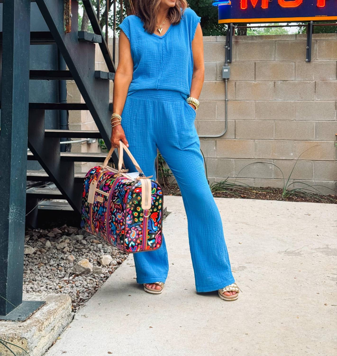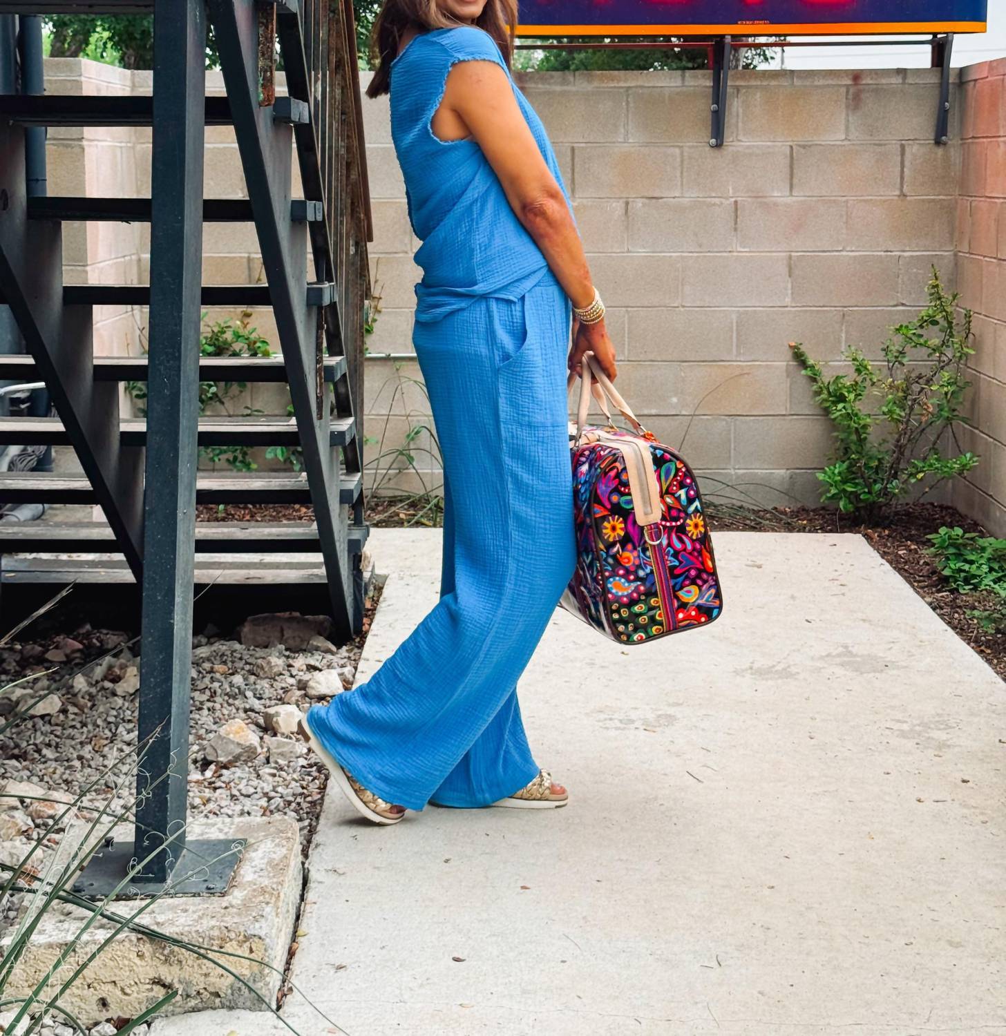 Stay on trend with these stylish boot cut pants that are fit to perfection. The perfect combination of comfort and fashion, you'll be grabbing for these all season long! Step into comfort and style with the Calista Elastic Waist Band Pant by Another Love, an essential piece in a striking blue hue. These pants showcase a solid pattern, high-rise relaxed fit, and are crafted from 100% cotton for ultimate comfort. Designed with a pull-on closure and convenient pockets, the pants feature a fashionable flared leg style. Ideal for vacation and workwear, care is simple with machine wash cold, tumble dry low, and warm iron when needed.