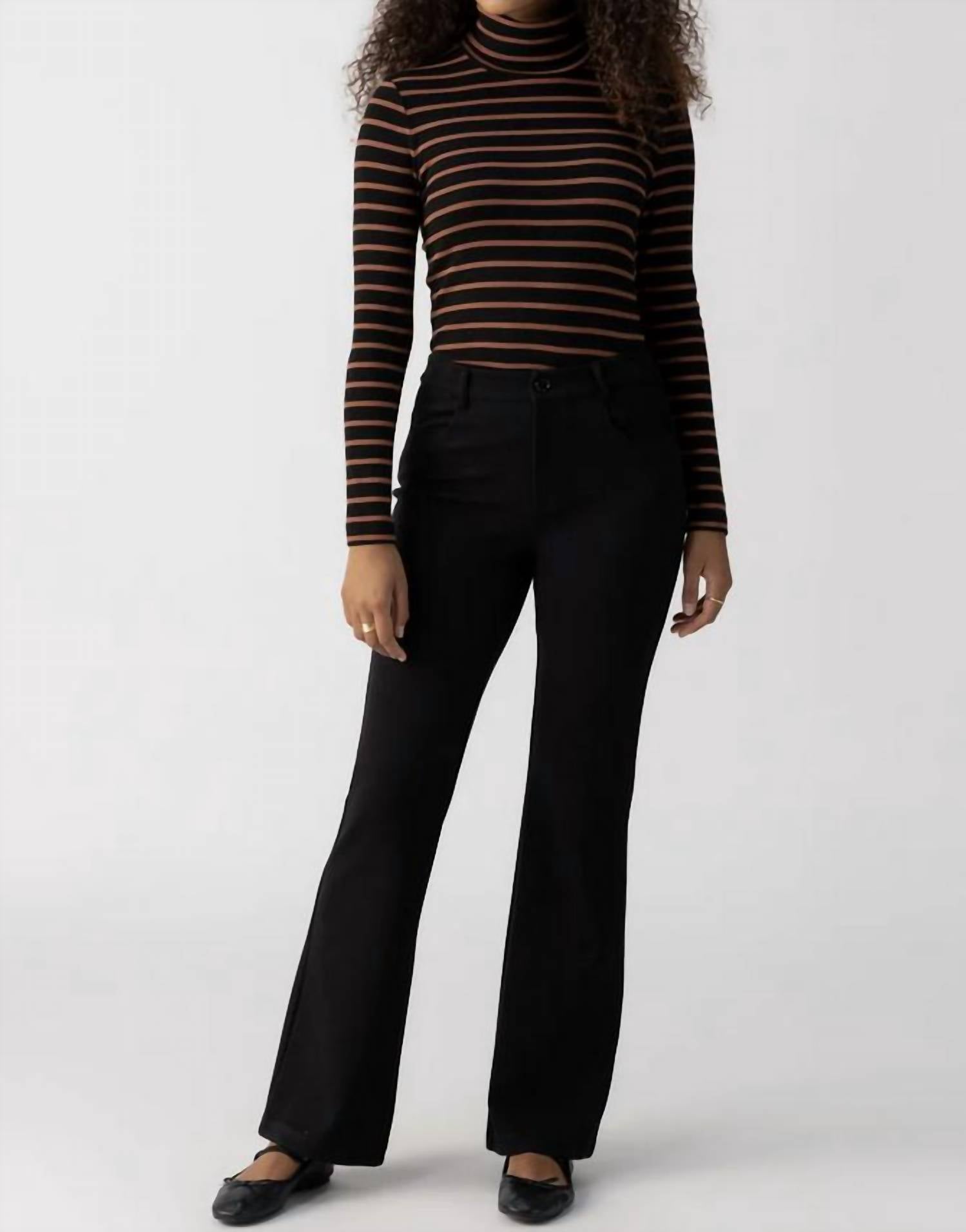 The trend report says boot-cut is in and that's exactly why we love this style. They are fit to perfection, flattering on any body type, and comfortable. They will be your go-to all season long. Introducing the Maya Flare Pant by Sanctuary, a must-have for any wardrobe with its solid black color and flared leg style. These women's pants are crafted from quality Rayon, offering both comfort and style. Designed with a mid-rise waist and equipped with pockets, they feature a convenient button closure. Easy to care for, simply machine wash to keep them looking their best.
