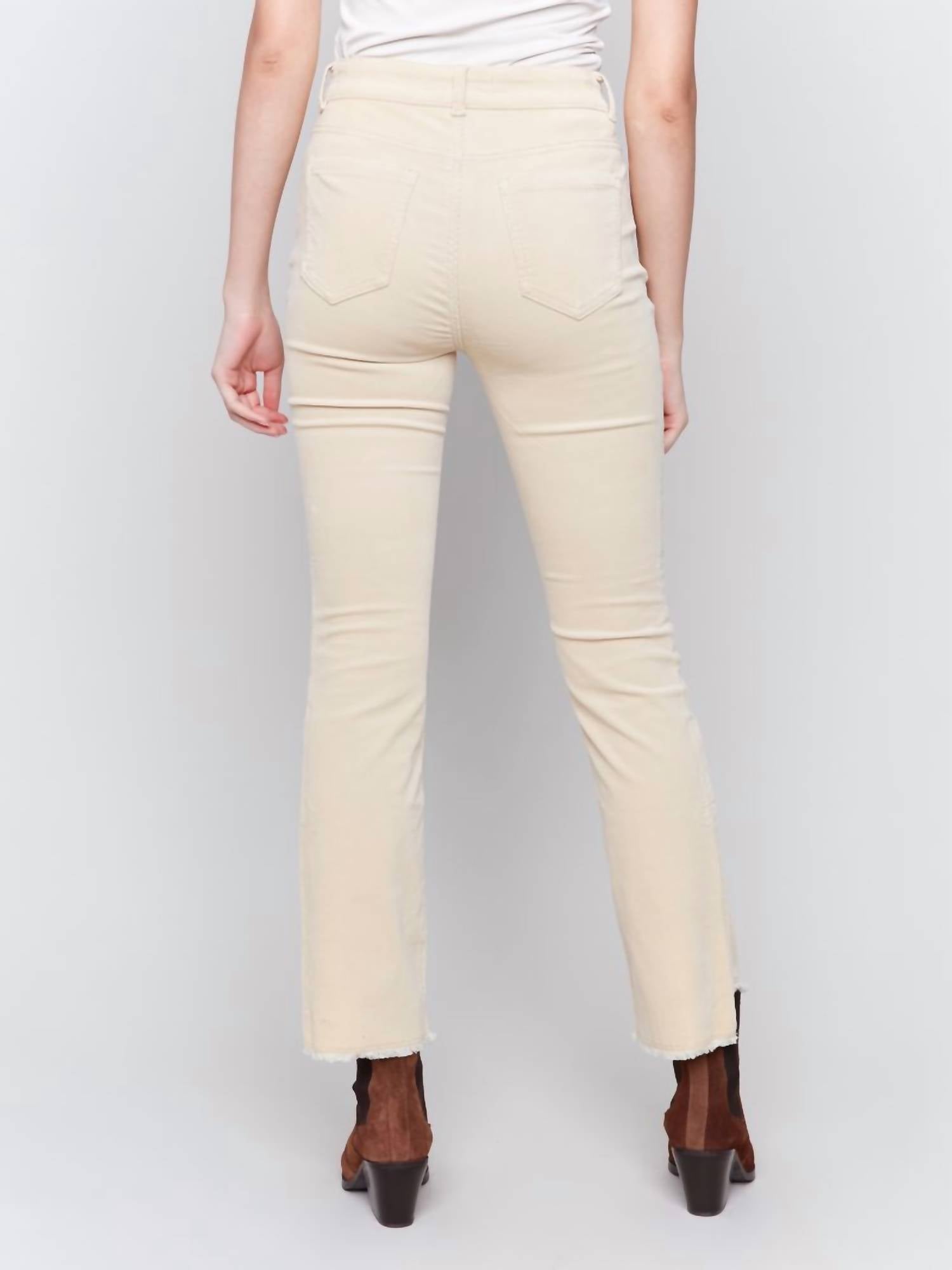 Stay on trend with these stylish boot cut pants that are fit to perfection. The perfect combination of comfort and fashion, you'll be grabbing for these all season long! Introducing the Sugar Hill Corduroy Pants by CHARLIE B, crafted for those who love to make a statement. These natural-toned, high-rise pants feature a unique asymmetrical fringe hem and a flattering bootcut leg, perfect for evening events. Made with a comfortable cotton blend composition of 98% Cotton and 2% Spandex, they ensure ultimate comfort and style. Closure: Button closure. Care instructions: Machine wash in cold water, do not bleach, hang to dry, iron at low setting, and dry clean if needed. Ideal for spring workwear and celebrating New Year's Eve.