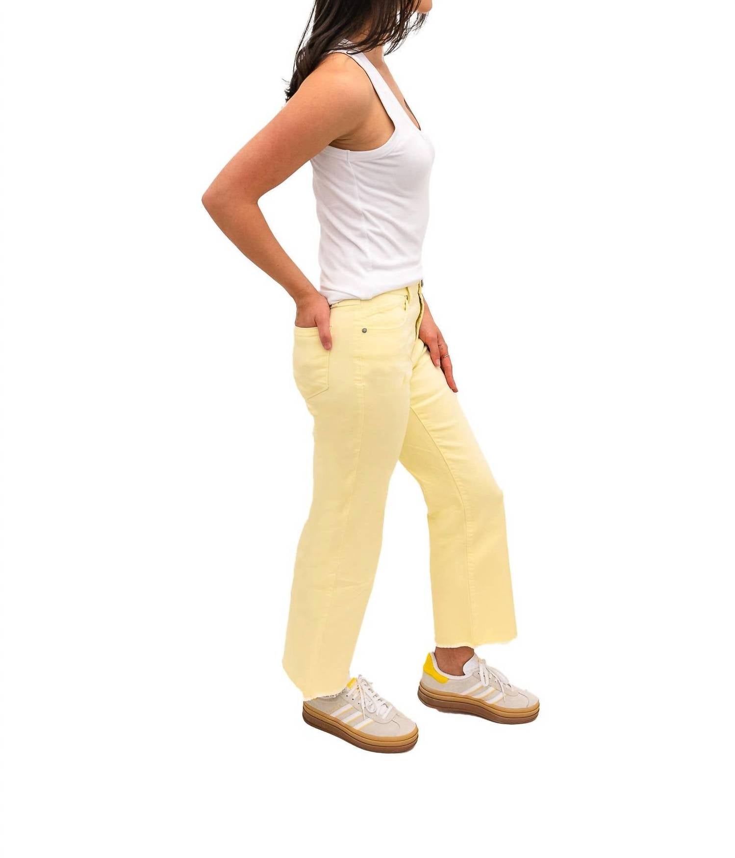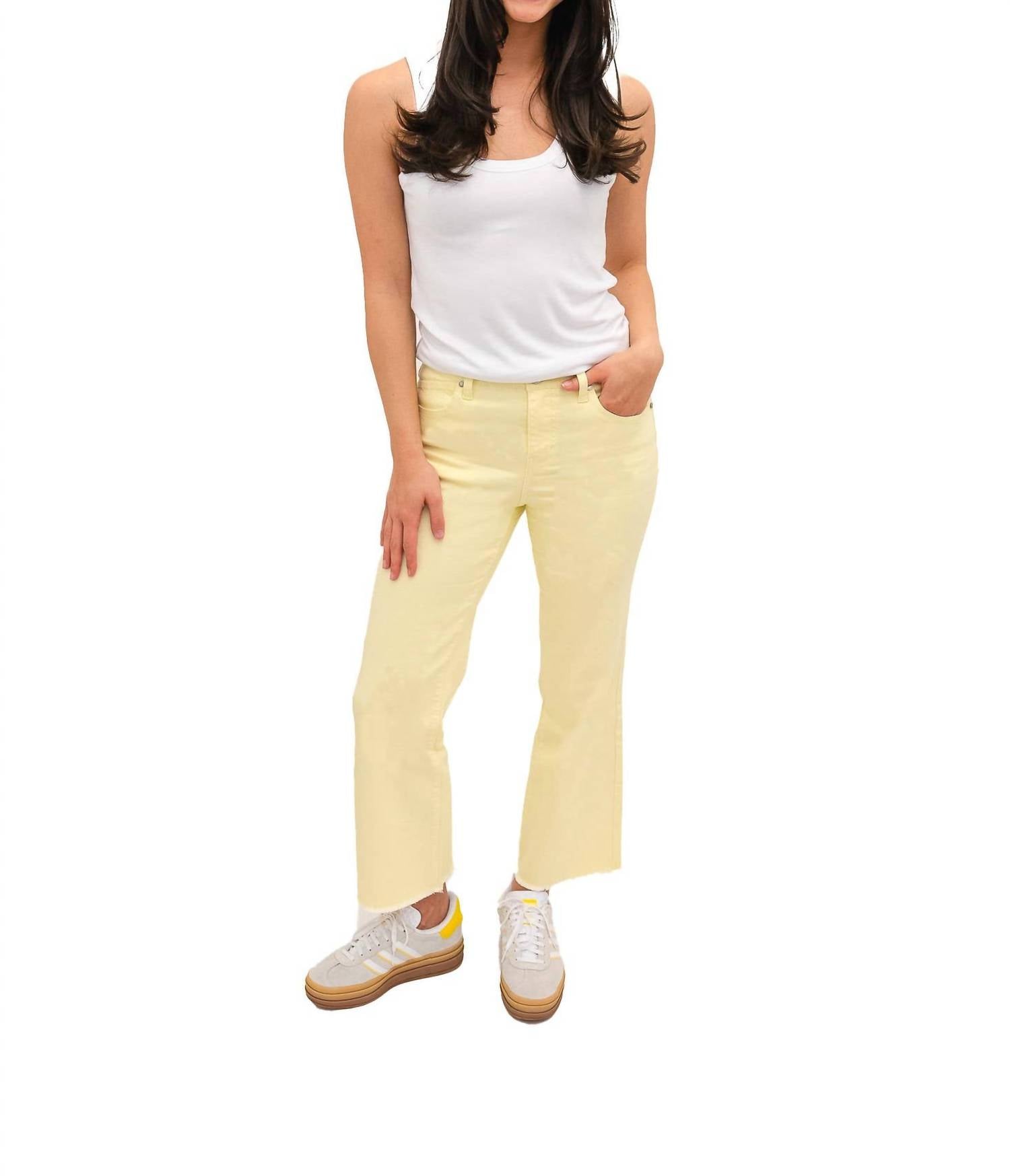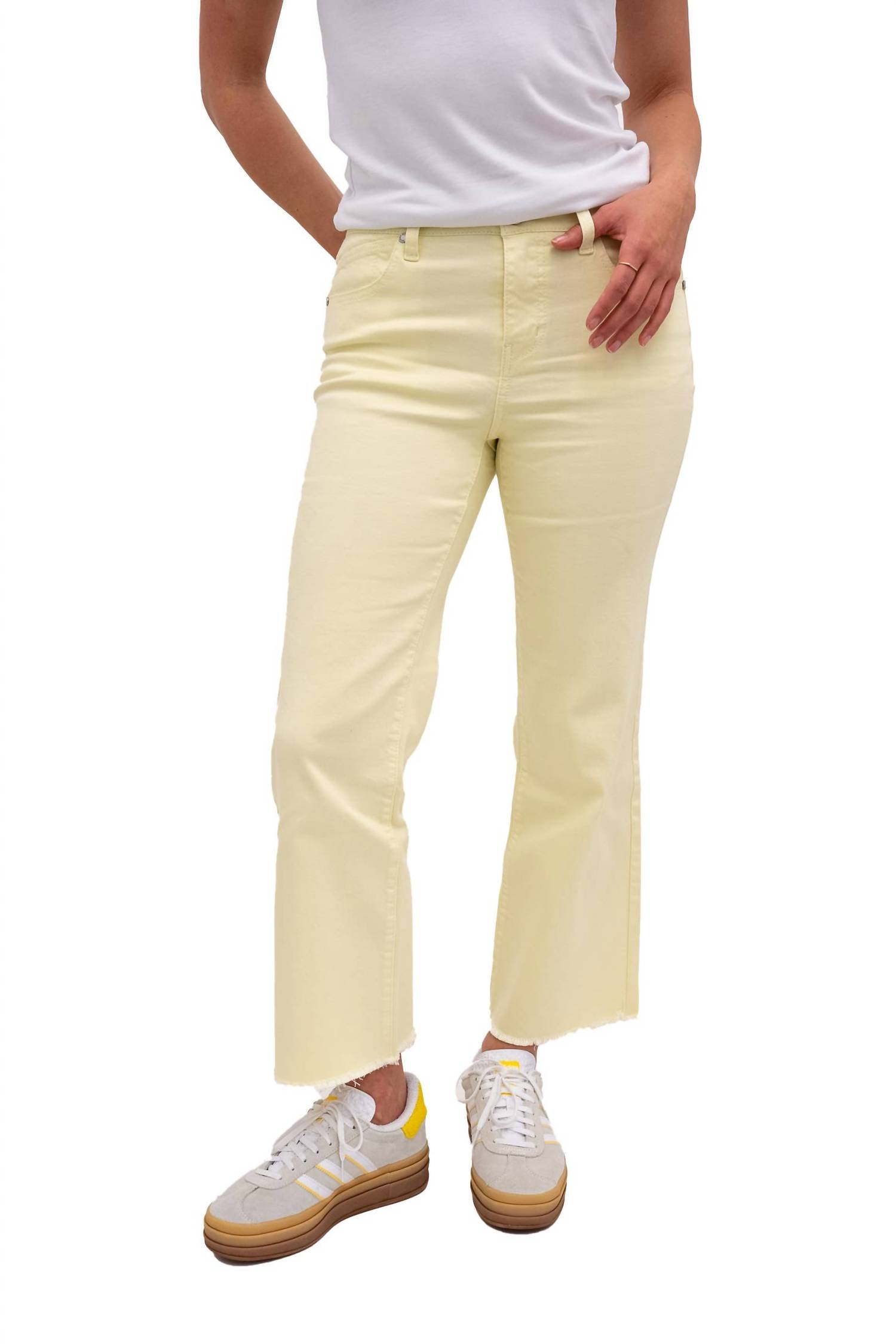 Slightly flared pants are all the rage right now and these are no exception. Pair these with your favorite tee for a more casual look, or with your favorite button-up blouse for an evening out. Introducing the Demi Luxe Bootcut Jeans by 1822 Denim, an exquisite piece for your spring wardrobe in a stunning yellow solid color. These jeans offer a slim fit through the thighs, a slight flare at the knee, and a mini bootcut leg style. Crafted from a cotton blend of 56% cotton, 24% rayon, 19% polyester, and 1% spandex, they feature a 10.5-inch rise, a 28-inch inseam, and a comfortable 23-inch leg opening. Closure is secured with a button, and care involves machine washing inside out with like colors, hanging to dry, and using a cool iron as needed.