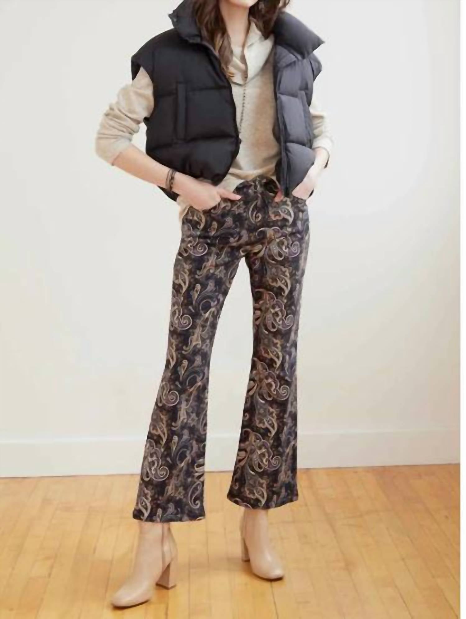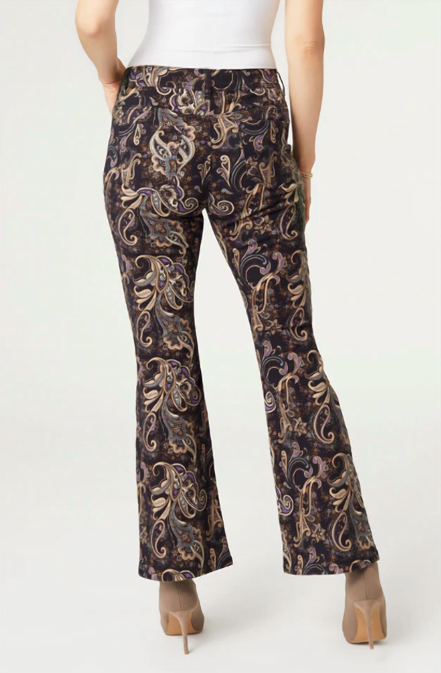Stay on trend with these stylish boot cut pants that are fit to perfection. The perfect combination of comfort and fashion, you'll be grabbing for these all season long! Elevate your style with COCO + CARMEN's Draco Printed Flare Pants in a striking black paisley pattern. Crafted from a comfortable cotton blend, these flared-leg trousers feature a relaxed fit that exudes confidence and flair. The high-rise design is complemented by practical pockets and a secure button closure. Perfect for adding an element of sophistication to your wardrobe.