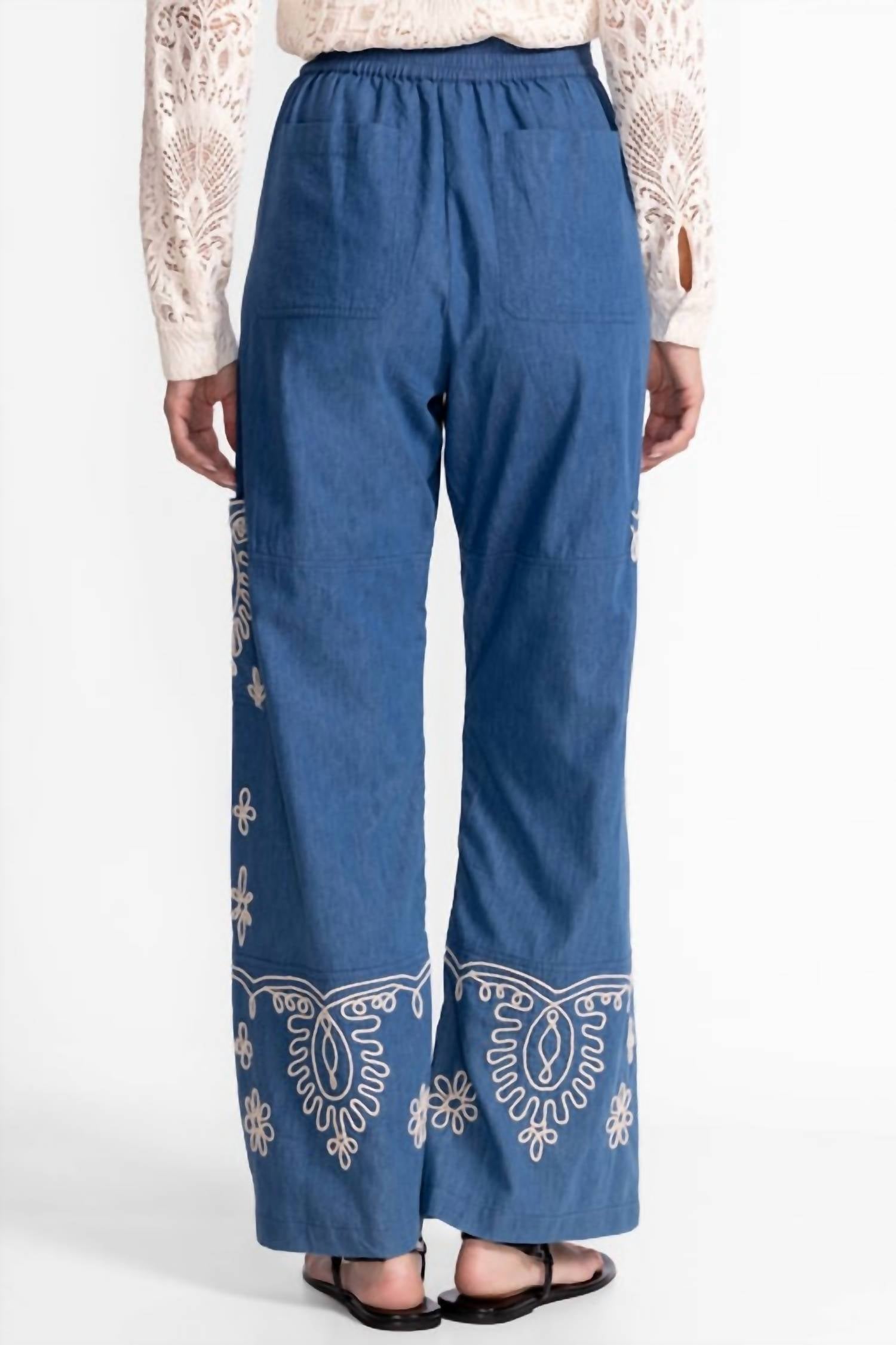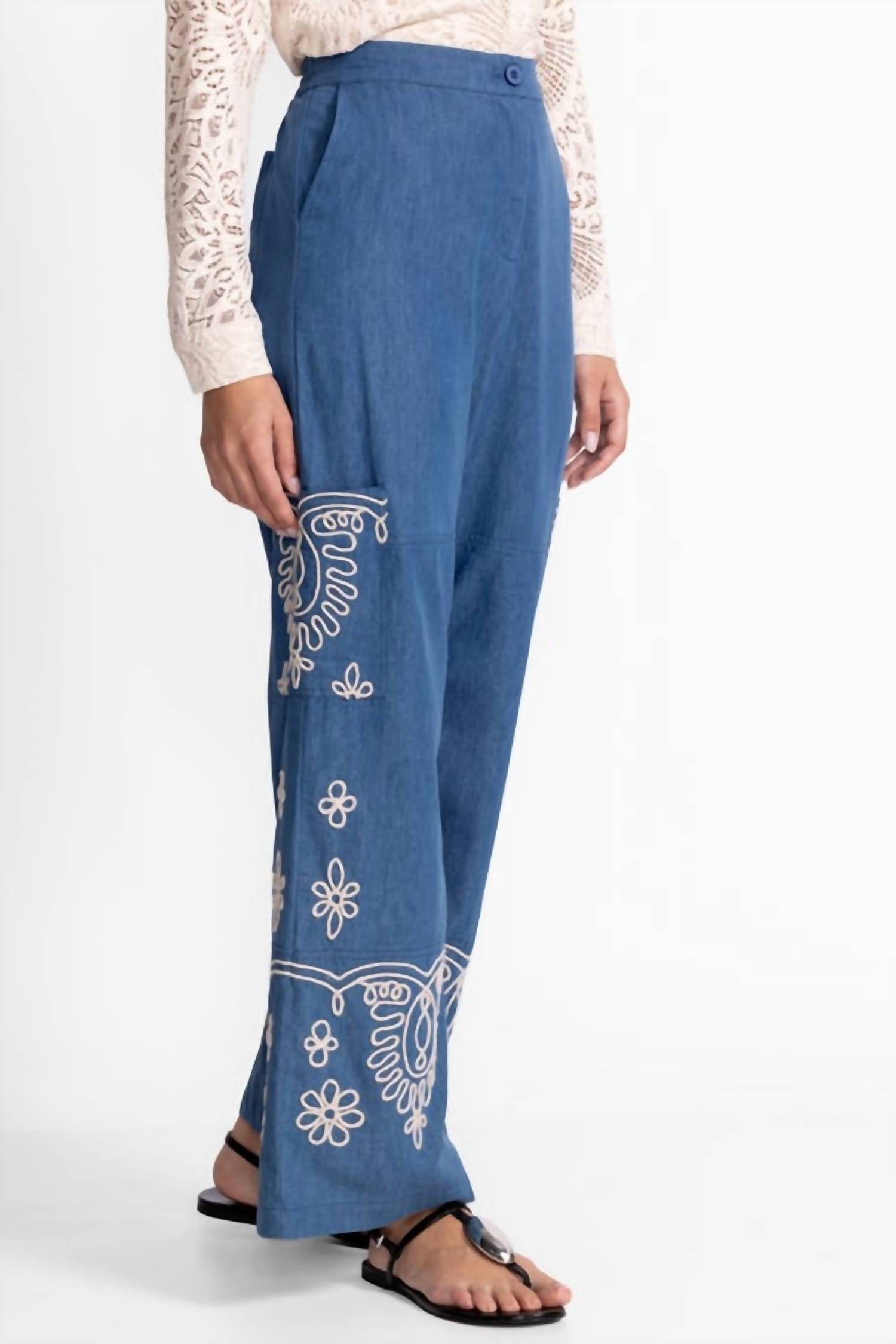 Slightly flared pants are all the rage right now and these are no exception. Pair these with your favorite tee for a more casual look, or with your favorite button-up blouse for an evening out. Crafted from breathable 100% cotton, the Soutache Cargo Pants feature intricate embroidered detailing in the traditional soutache style. Designed with an elastic back waist and bold cargo pockets throughout, these pants are finished with unique seaming details. Model is 5'9" and wearing a size XS. Machine Wash
