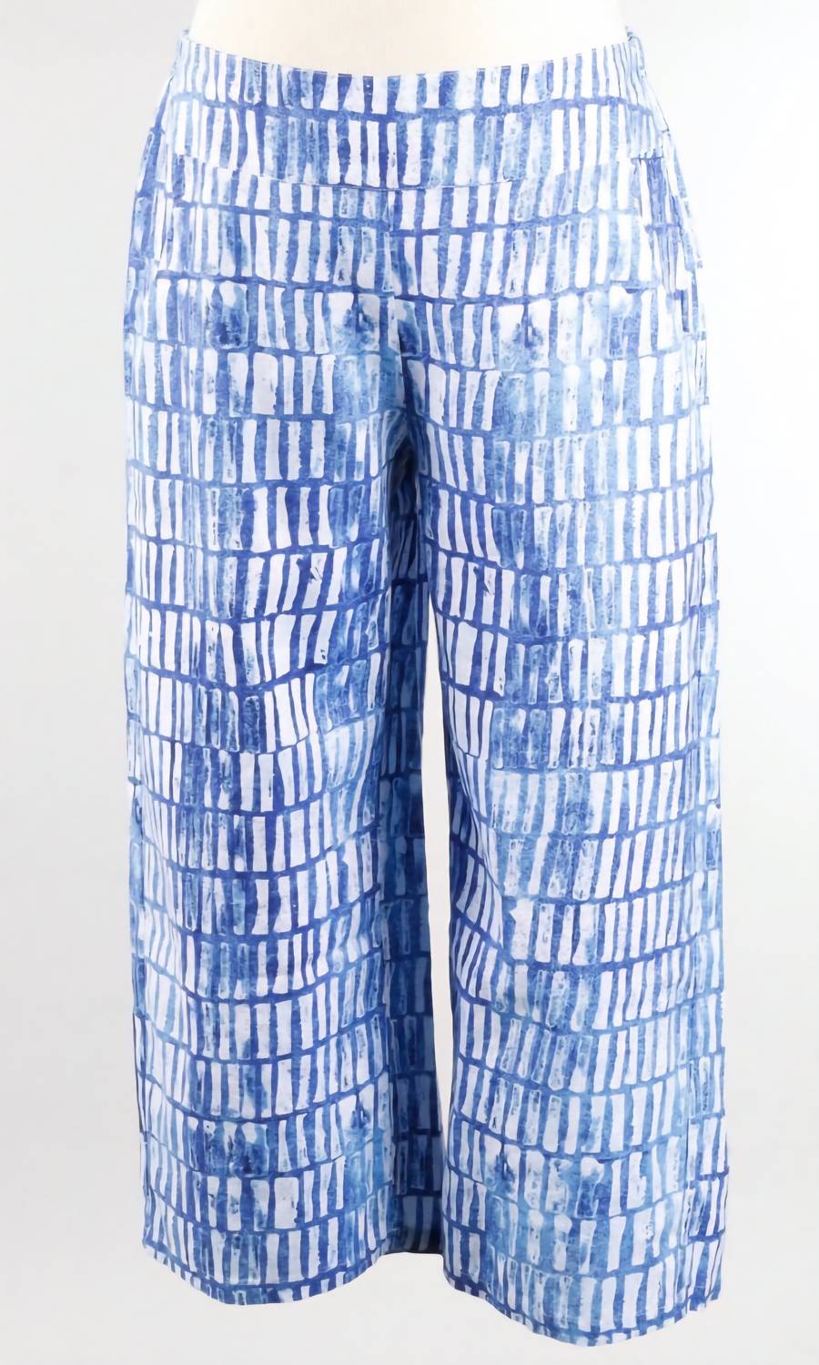 The trend report says boot-cut is in and that's exactly why we love this style. They are fit to perfection, flattering on any body type, and comfortable. They will be your go-to all season long. The hand blocked Batik print in a breathable linen/cotton blend makes a for perfect summer essential. The Crop Pant slips on with a flat front and an elastic waistband in back. This pant has a full wide leg dropping to a flowy ankle length, and it finishes with a pair of handy curved side pockets. Machine wash cold, tumble dry low small measures 30-34" waist, 25" inseam, 36" length medium measures 34-36" waist, 25" inseam, 37" length large measures 36-40" waist, 25" inseam, 37" length XL measures 38-42" waist, 25" inseam, 38" length