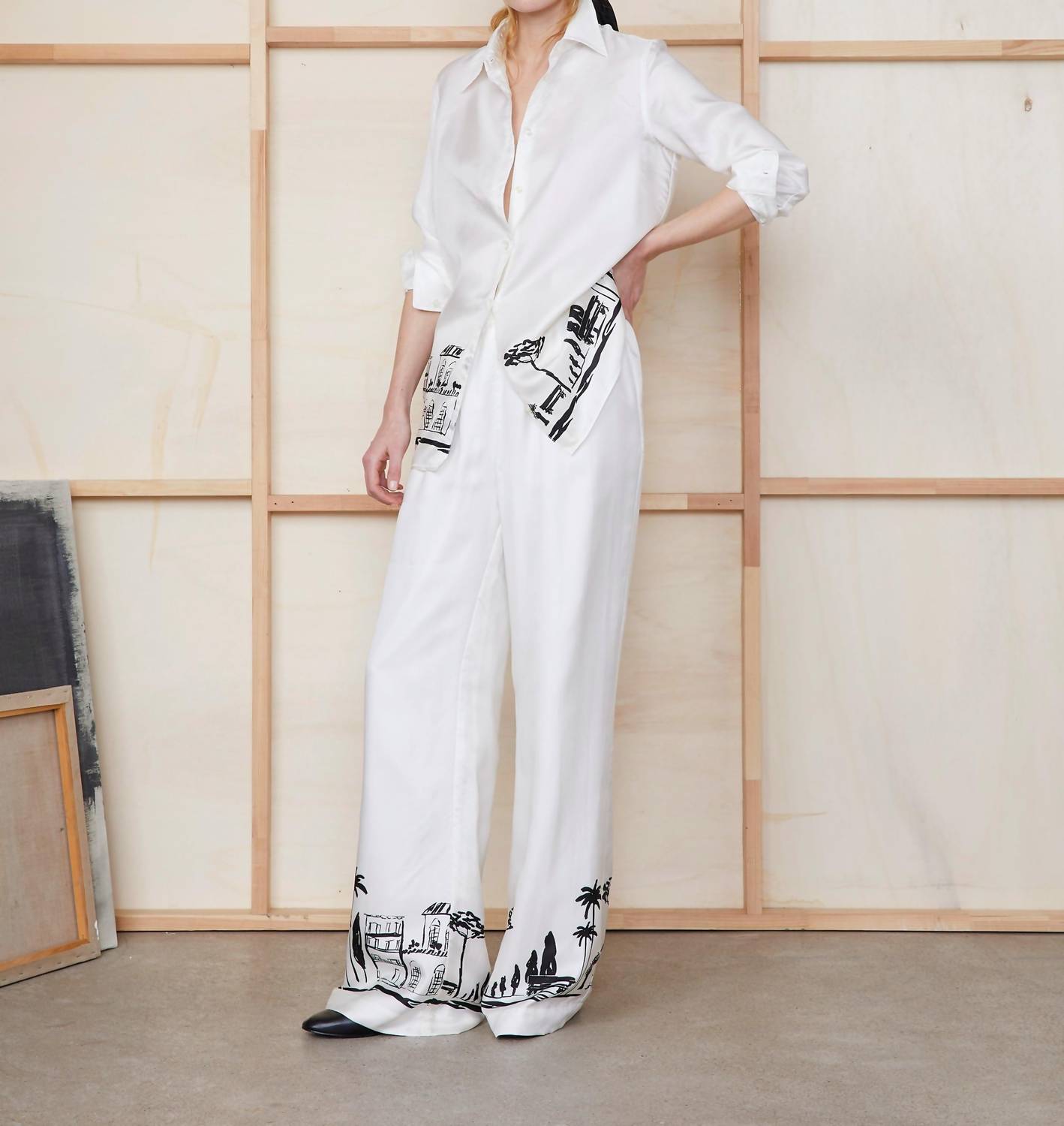 The trend report says boot-cut is in and that's exactly why we love this style. They are fit to perfection, flattering on any body type, and comfortable. They will be your go-to all season long. Introducing the Gracella Pants by Officine Générale, a sophisticated high-waisted flare leg design perfect for making a statement in ecru and black. Crafted from luxurious 100% twill silk, these pants feature an exclusive print developed by Officine Générale. The practical elasticated waistband and side seam pockets add comfort and functionality, while its elegant silhouette and matching shirt option offer a coordinated look. Proudly made in Portugal and recommended for dry cleaning only, these pants stand out with their distinctive style and quality.