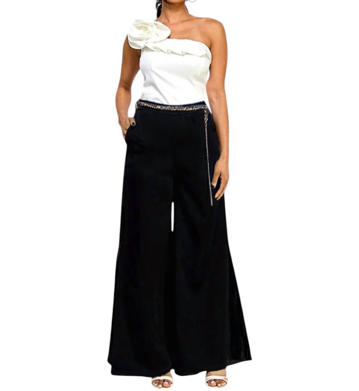 The trend report says boot-cut is in and that's exactly why we love this style. They are fit to perfection, flattering on any body type, and comfortable. They will be your go-to all season long. Discover the elegance of the Charlie Side Slit Palazzo Pants by milk & honey, designed in a timeless black hue. These women's high-rise pants are made from 100% polyester and feature a relaxed fit with a flared leg style, perfect for achieving a sophisticated silhouette. Unlined and imported, they offer a solid pattern with the practicality of pockets. Care for your garment by hand washing in cold water, line drying, and using low heat for ironing.