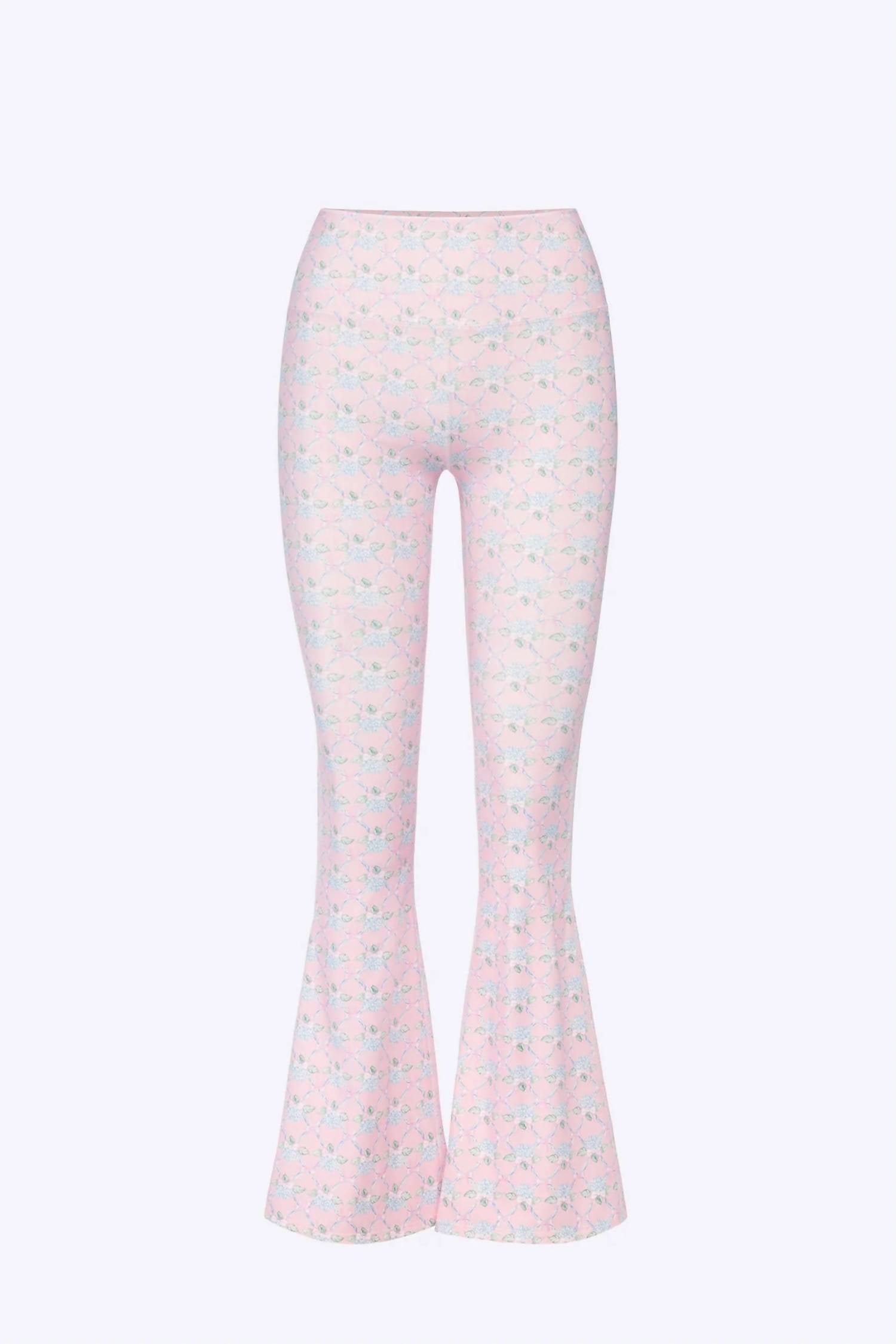 Stay on trend with these stylish boot cut pants that are fit to perfection. The perfect combination of comfort and fashion, you'll be grabbing for these all season long! Introducing the Women's Ribbon Dream Flare Legging by The Happy Camp3r, a blend of comfort and retro charm in a vibrant pink hue. These flared leg leggings feature a high-rise waistband and relaxed fit for a flattering and playful style. Made from a 75% Nylon and 25% Spandex blend with a graphic pattern, they promise softness for all-day wear. Closure: Pull on. Perfect for spring vacations, whether lounging or stepping out in minimalist style.