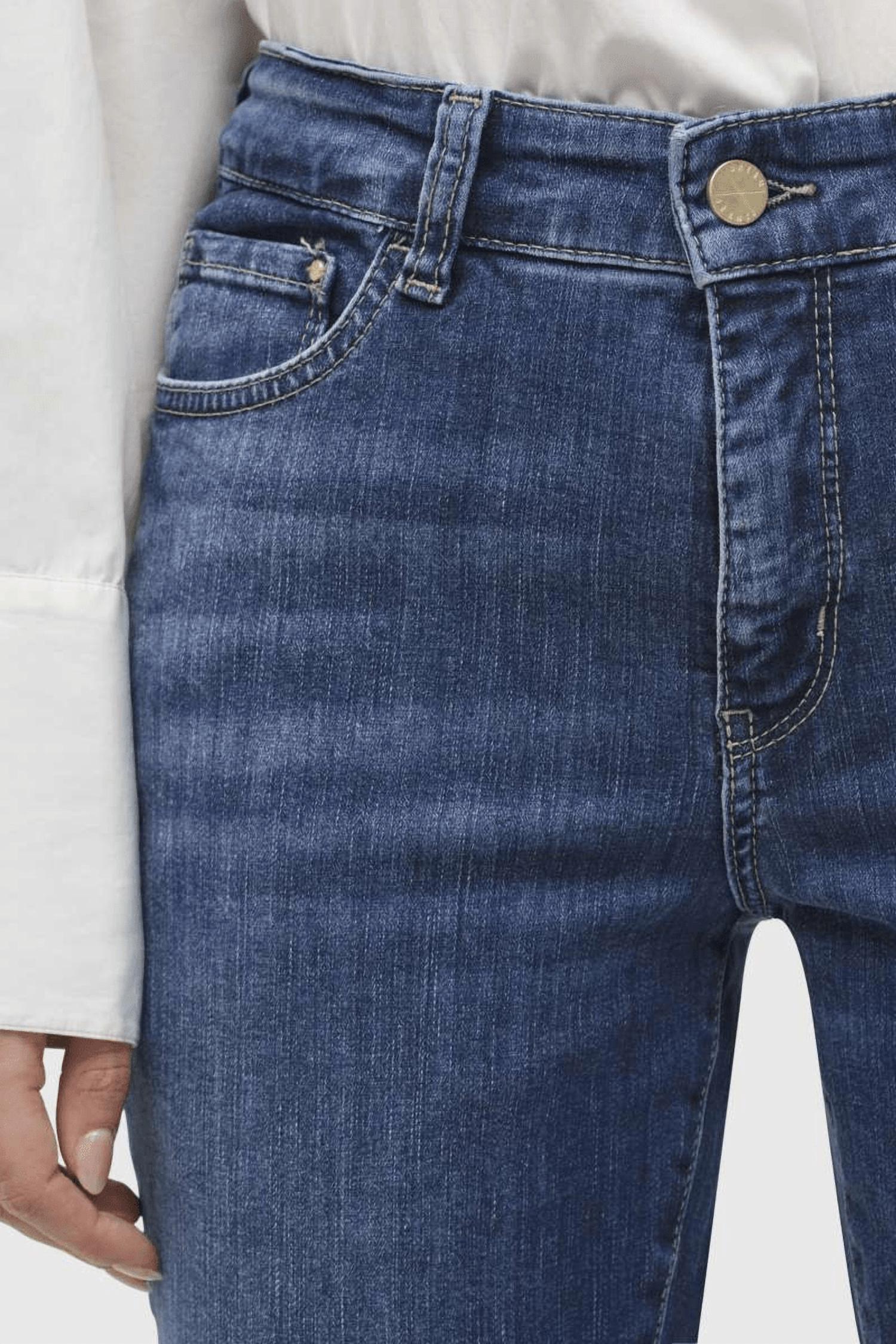 The trend report says boot-cut is in and that's exactly why we love this style. They are fit to perfection, flattering on any body type, and comfortable. They will be your go-to all season long. Discover effortless style with the Dream Kick Authentic Flare Kick Jeans from MAC Jeans in the captivating Outworn Blue Basic hue. These jeans boast a relaxed fit with a straight leg and flared hem, designed with a comfortable mid-rise waist and innovative hyper stretch denim for a figure-shaping effect. Crafted from 93% Cotton, 5% Elastomultiester, and 2% Spandex, these jeans feature a convenient side zipper and five-pocket design, offering an authentic vintage look with a soft feel. The 27" inseam complements the flare, while care is a breeze with machine wash and tumble dry instructions. Model is 1.75 m tall, wearing size 34; choose one size smaller for optimal fit.