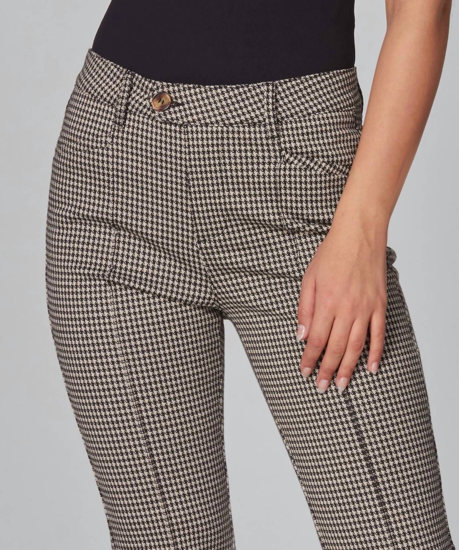 The trend report says boot-cut is in and that's exactly why we love this style. They are fit to perfection, flattering on any body type, and comfortable. They will be your go-to all season long. Introducing the Jersey Houndstooth High-rise Flare Jacquard Pants by LOLA JEANS, a chic addition to any wardrobe with its retro-inspired flair. These pants feature a flared leg style in a timeless houndstooth pattern and are crafted from a soft nylon blend (67% rayon, 29% nylon, 4% spandex), providing both comfort and style. With a high-rise fit and a flattering regular cut, these pants are equipped with functional front pockets and a button closure. Care is made easy with machine wash and tumble dry options, and they come with a 32-inch inseam.