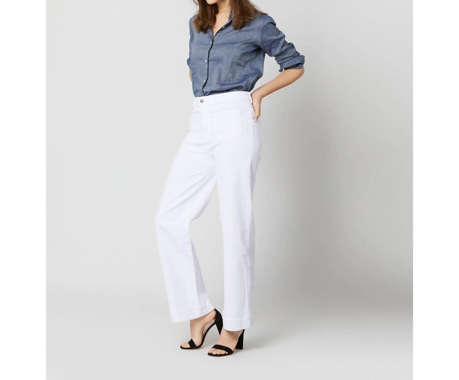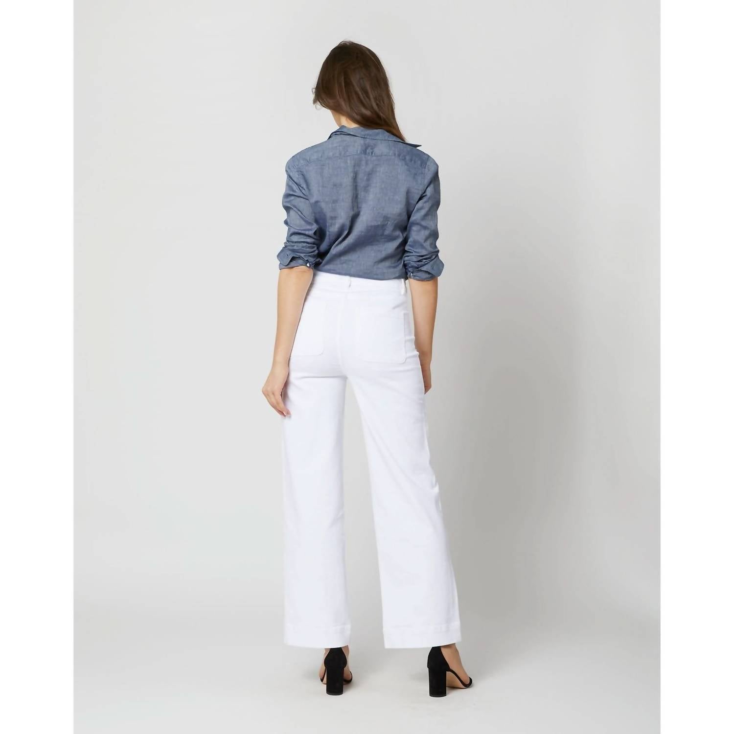 Classic straight-leg jeans with a 10" rise and 30" inseam. Made from soft stretch Cone Mills denim (89% cotton, 8% polyester, 3% spandex) in a faded blue. Features front patch pockets and a zip fly, with a 20" leg opening. Made in Los Angeles, machine washable. Measurements based on size 27.