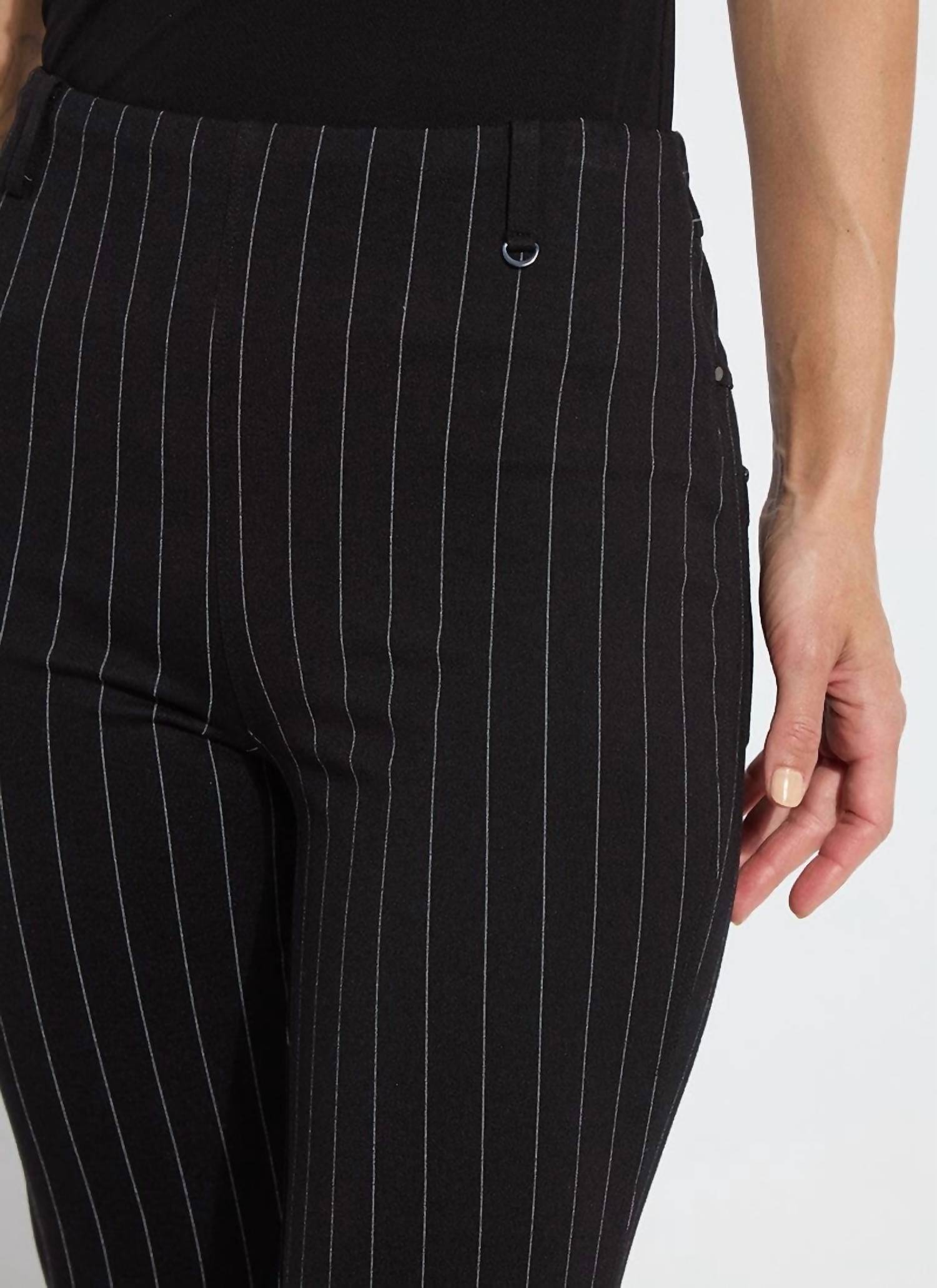 Stay on trend with these stylish boot cut pants that are fit to perfection. The perfect combination of comfort and fashion, you'll be grabbing for these all season long! Experience the Lysse Baby Boot Ankle Pant in a Soft Soothing Stripe, perfect for both work and leisure occasions. These ankle-length pants crafted from a lightweight viscose blend (60% Viscose, 34% Polyester, 6% Elastane) offer a modern bootcut fit with a slightly flared leg and an easy pull-on closure. The pants feature a concealed patented 360° smoothing waistband, 4x stretch, and studded back pockets, measuring a 27" inseam. Care for your garment with machine wash and line dry instructions. Model is 5’10” and wearing size S.