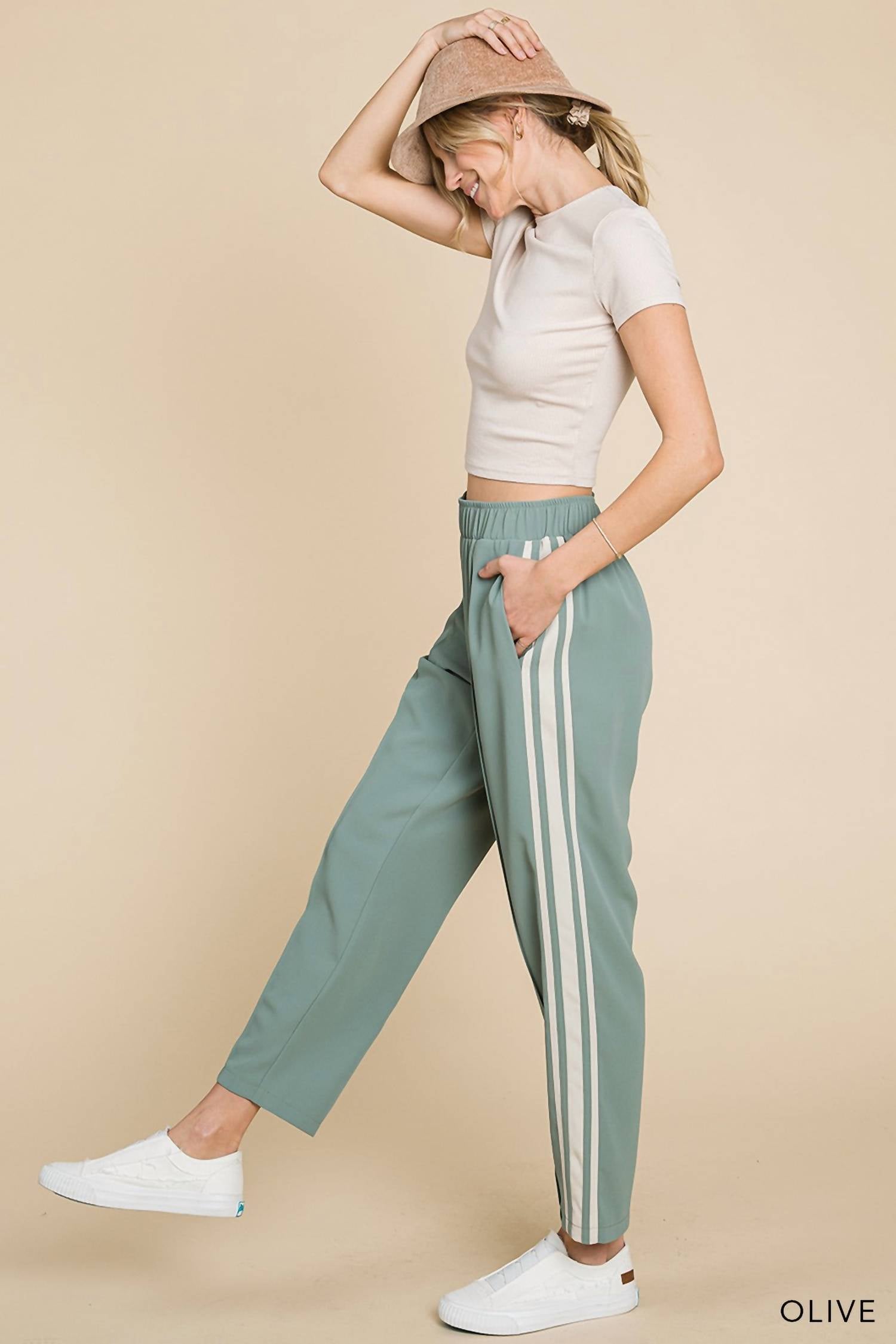 Slightly flared pants are all the rage right now and these are no exception. Pair these with your favorite tee for a more casual look, or with your favorite button-up blouse for an evening out. Cotton Bleu presents Women's Capri Pants in a chic olive green, perfect for a minimalist spring wardrobe. These capri pants feature a straight leg style with a pull-on closure for easy wear. The stripe pattern adds a touch of contrast banding detail, enhancing their back-to-school appeal. Designed without pockets, they embrace a sleek, streamlined look suitable for various occasions.