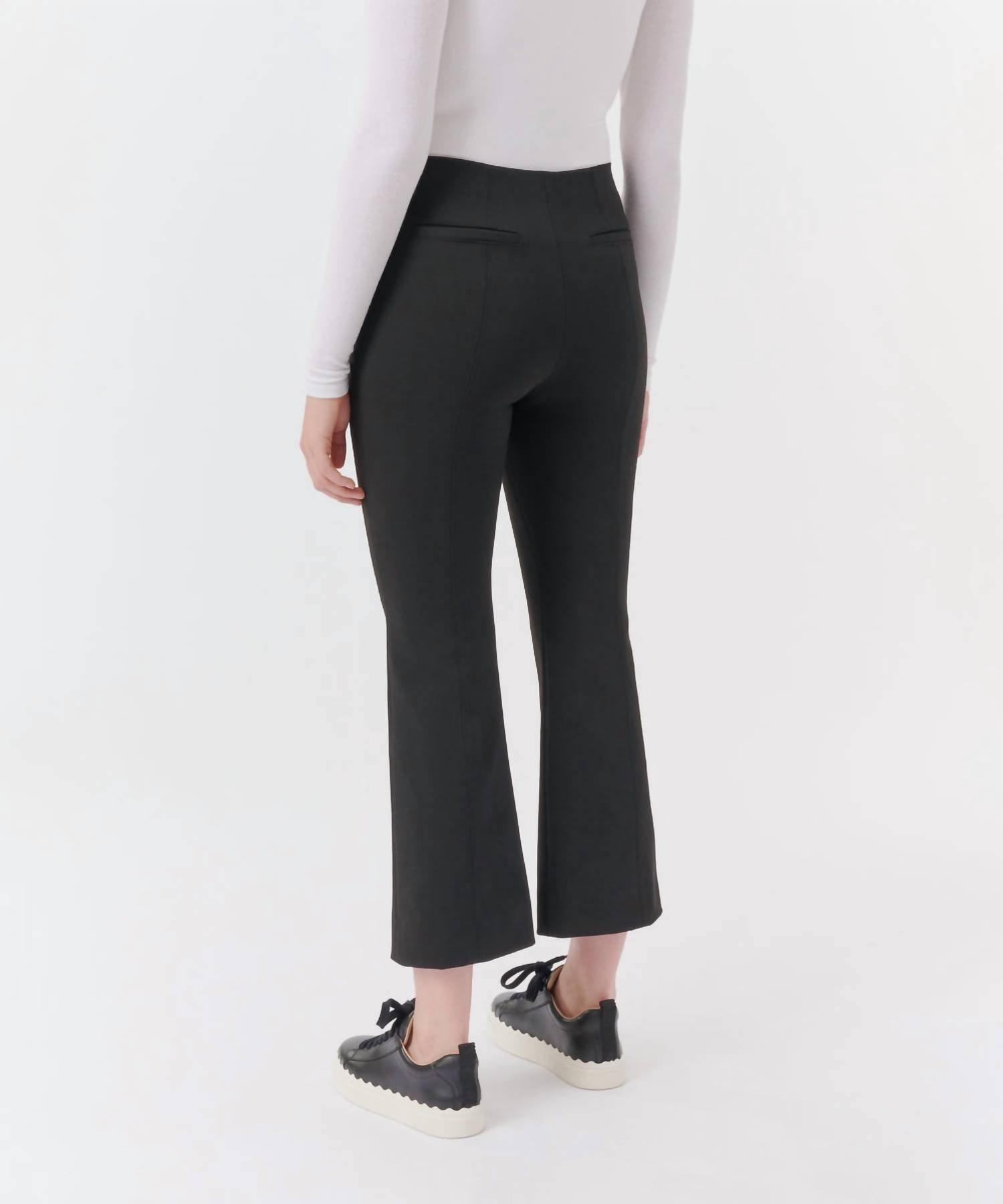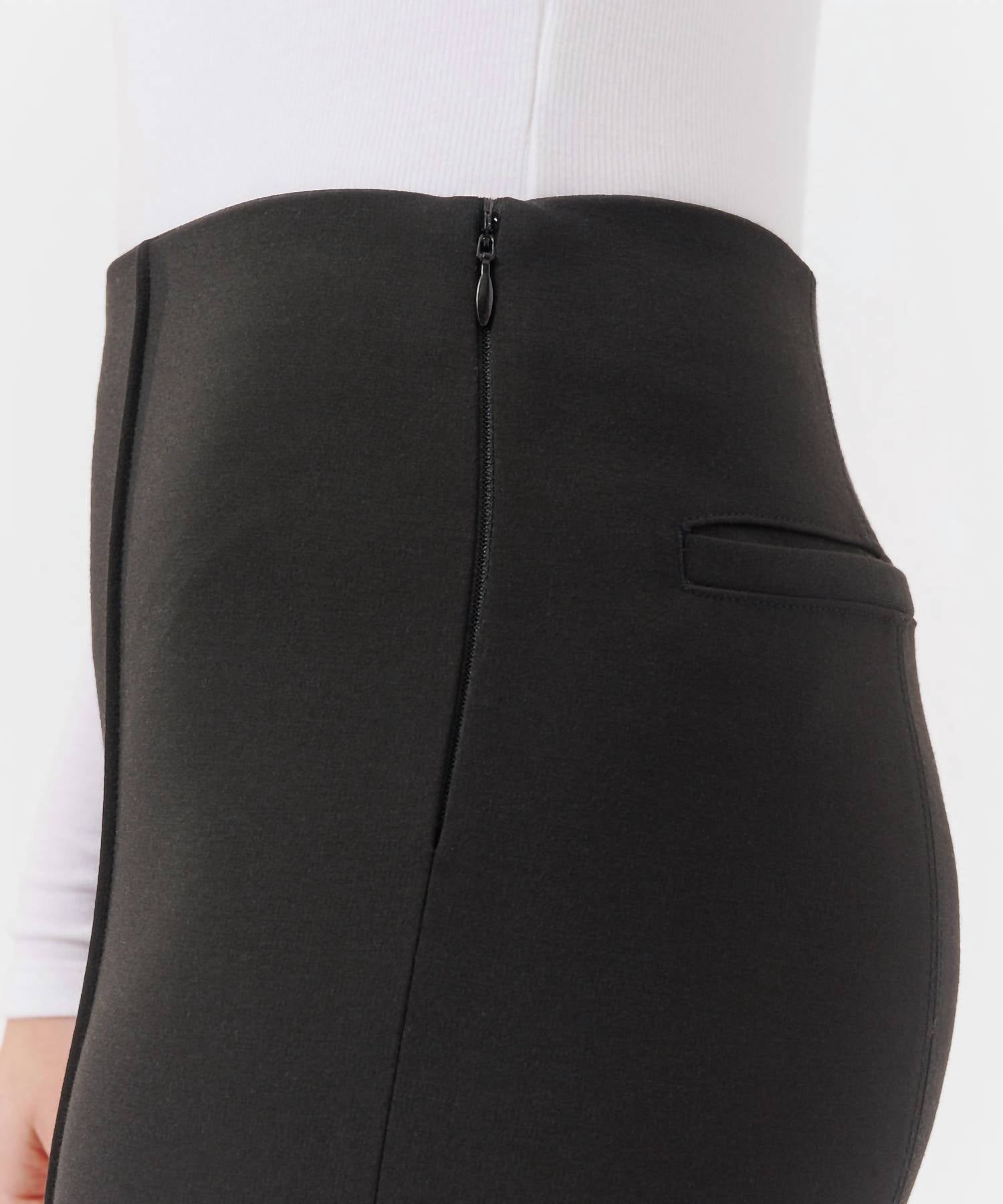 Mid-rise. Flared silhouette. Flat front. Concealed side zip closure. Seam detail. Fabric: 72% Polyester, 24% Rayon, 4% Elastane. Machine wash cold.