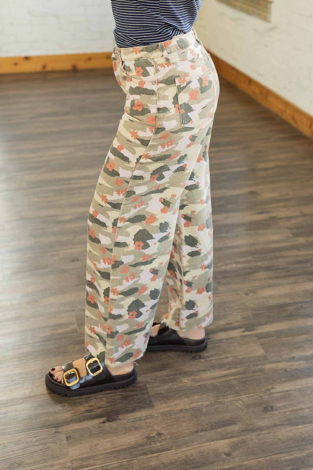 Slightly flared pants are all the rage right now and these are no exception. Pair these with your favorite tee for a more casual look, or with your favorite button-up blouse for an evening out. Elevate your fall wardrobe with the Women's Fancy Camo Print Washed Twill Pants by Easel, crafted from 100% cotton for a soft, lived-in feel. These pants feature a high-rise, wide-leg silhouette with a relaxed fit, complete with side pockets for added convenience. The cropped length is finished with a raw hem, and the pants are secured with a button and zip closure. Designed in a muted palette of sage olive, green, beige, and clay orange, these versatile camo pants add a touch of streetwear flair to any casual or vacation ensemble. Measurements for size Small: Outseam 38.75", Inseam 28", Waist 14.75".
