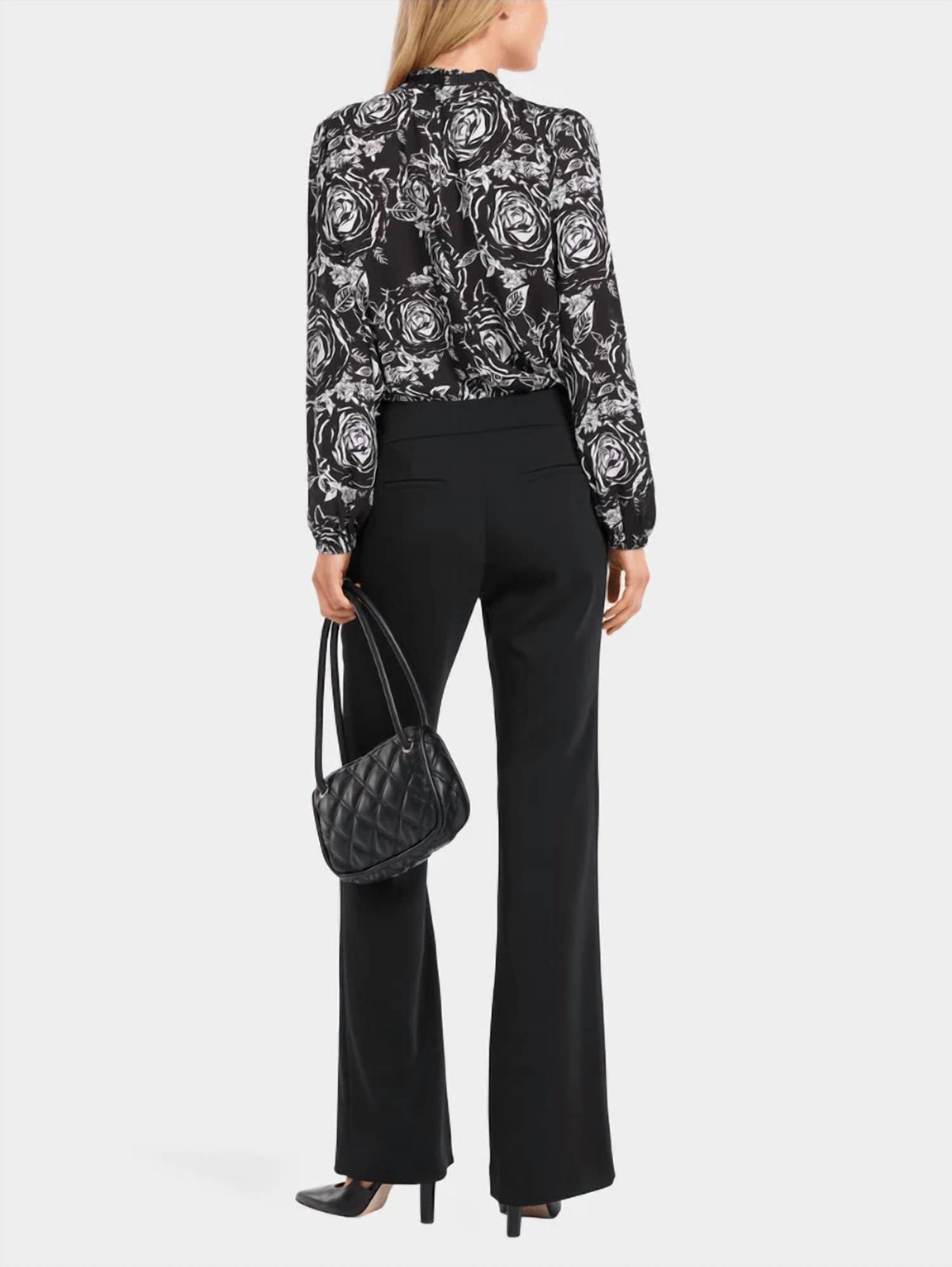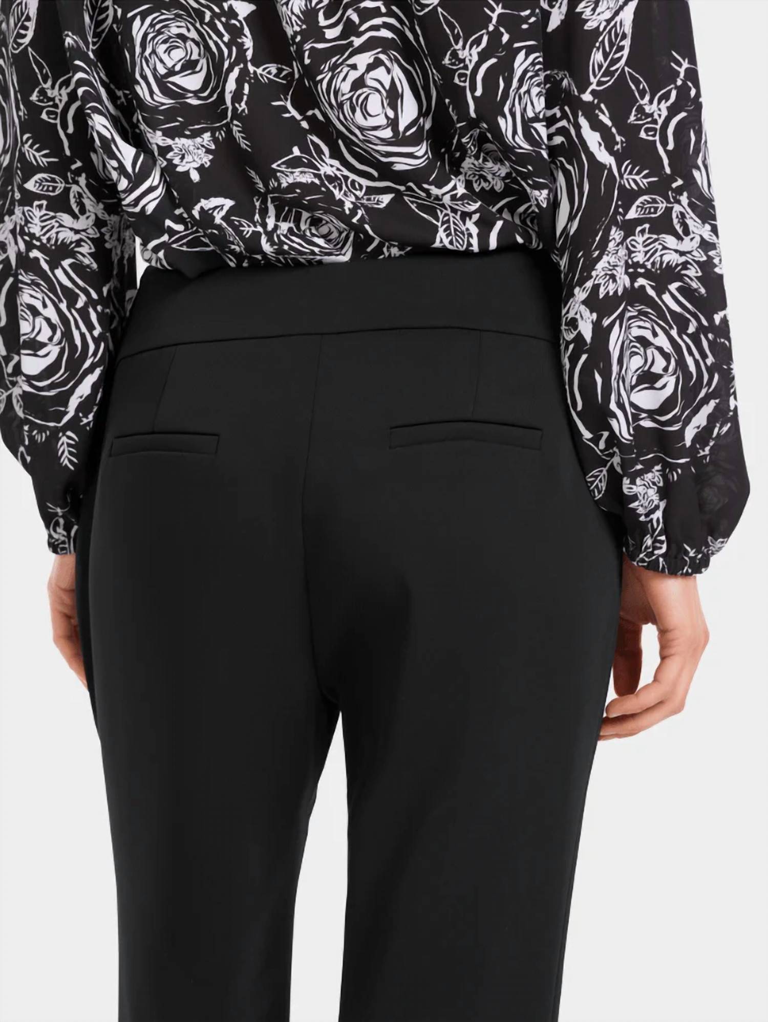 Slightly flared pants are all the rage right now and these are no exception. Pair these with your favorite tee for a more casual look, or with your favorite button-up blouse for an evening out. Introducing the Flared Leg Pants by Marc Cain, a sleek addition to your workwear wardrobe. These high-rise trousers in classic black offer a slim fit through the waist and hips, gracefully flaring towards the ankle for a feminine silhouette. Crafted from a blend of 97% polyester and 3% elastane, they feature a side zipper closure and decorative welt pockets at the back. Care for these pants with a machine wash and lay flat to dry for lasting wear.
