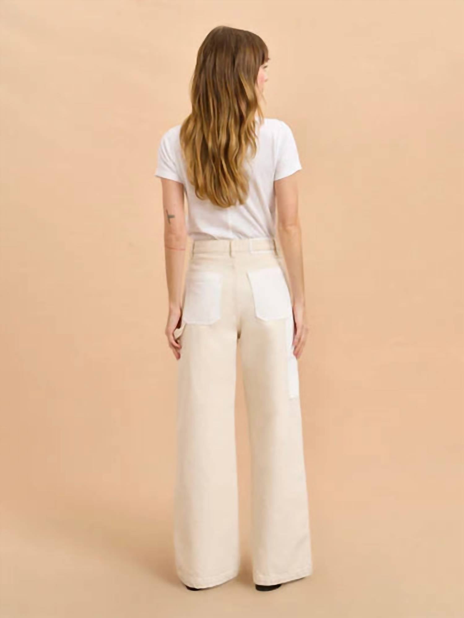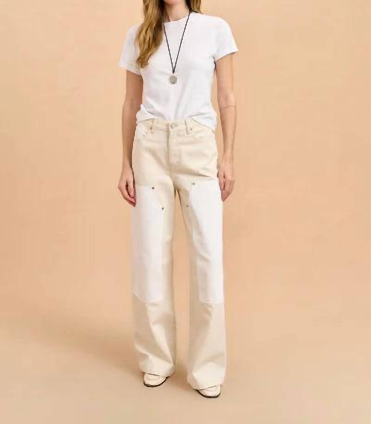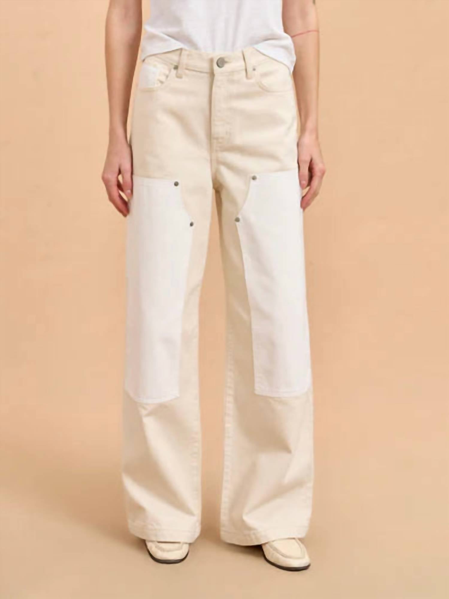 The trend report says boot-cut is in and that's exactly why we love this style. They are fit to perfection, flattering on any body type, and comfortable. They will be your go-to all season long. The Dunton Jean by La Ligne NYC is a must-have addition to your denim collection, offering a relaxed, high-rise fit with a wide-leg style, perfect for casual and holiday party settings. Crafted from 100% cotton in a solid Emerson/Wylder color, these jeans feature utilitarian pockets, a hammer loop, and tonal double knee patches, all accentuated by nickel rivets and studs. Design elements include a tan leather back patch, V-shaped yoke, and classic 5-pocket styling with front slash, coin, and back patch pockets. Closure: Button closure. Care: Machine wash.