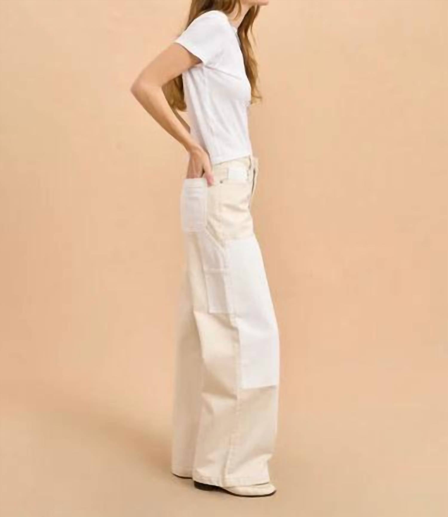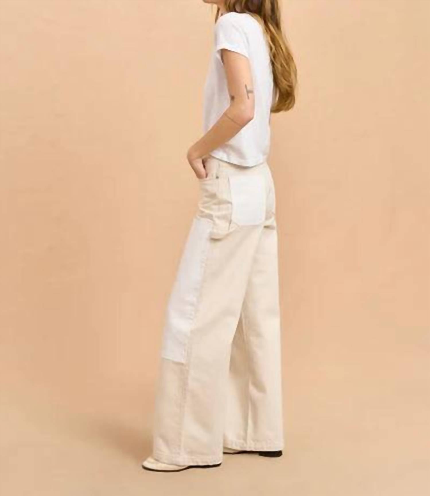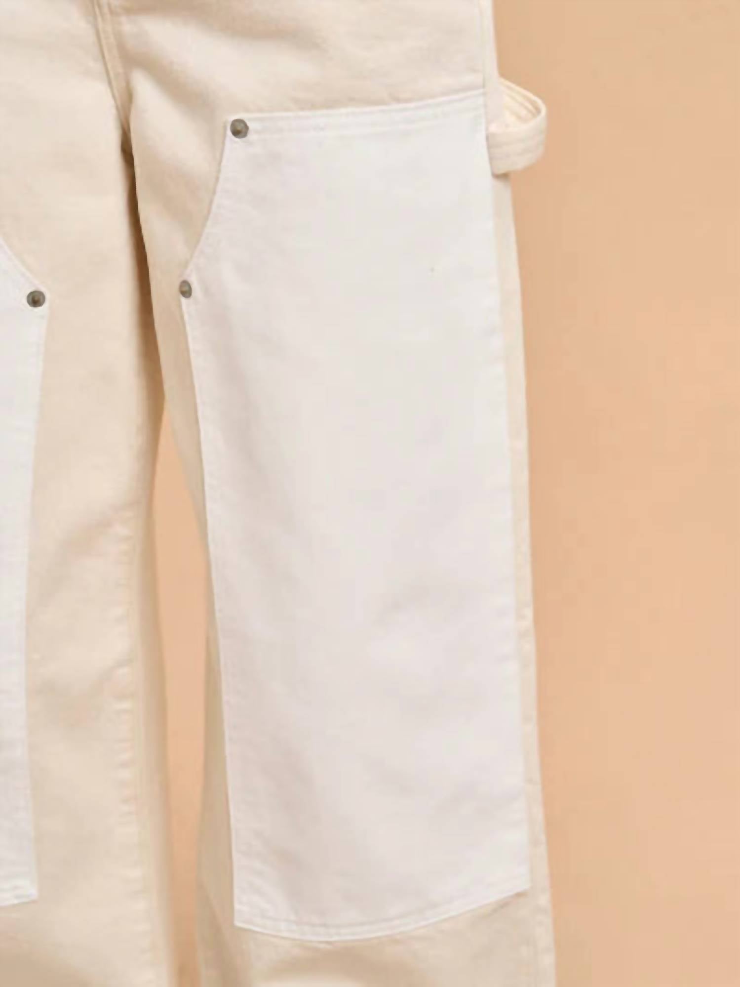 The trend report says boot-cut is in and that's exactly why we love this style. They are fit to perfection, flattering on any body type, and comfortable. They will be your go-to all season long. The Dunton Jean by La Ligne NYC is a must-have addition to your denim collection, offering a relaxed, high-rise fit with a wide-leg style, perfect for casual and holiday party settings. Crafted from 100% cotton in a solid Emerson/Wylder color, these jeans feature utilitarian pockets, a hammer loop, and tonal double knee patches, all accentuated by nickel rivets and studs. Design elements include a tan leather back patch, V-shaped yoke, and classic 5-pocket styling with front slash, coin, and back patch pockets. Closure: Button closure. Care: Machine wash.