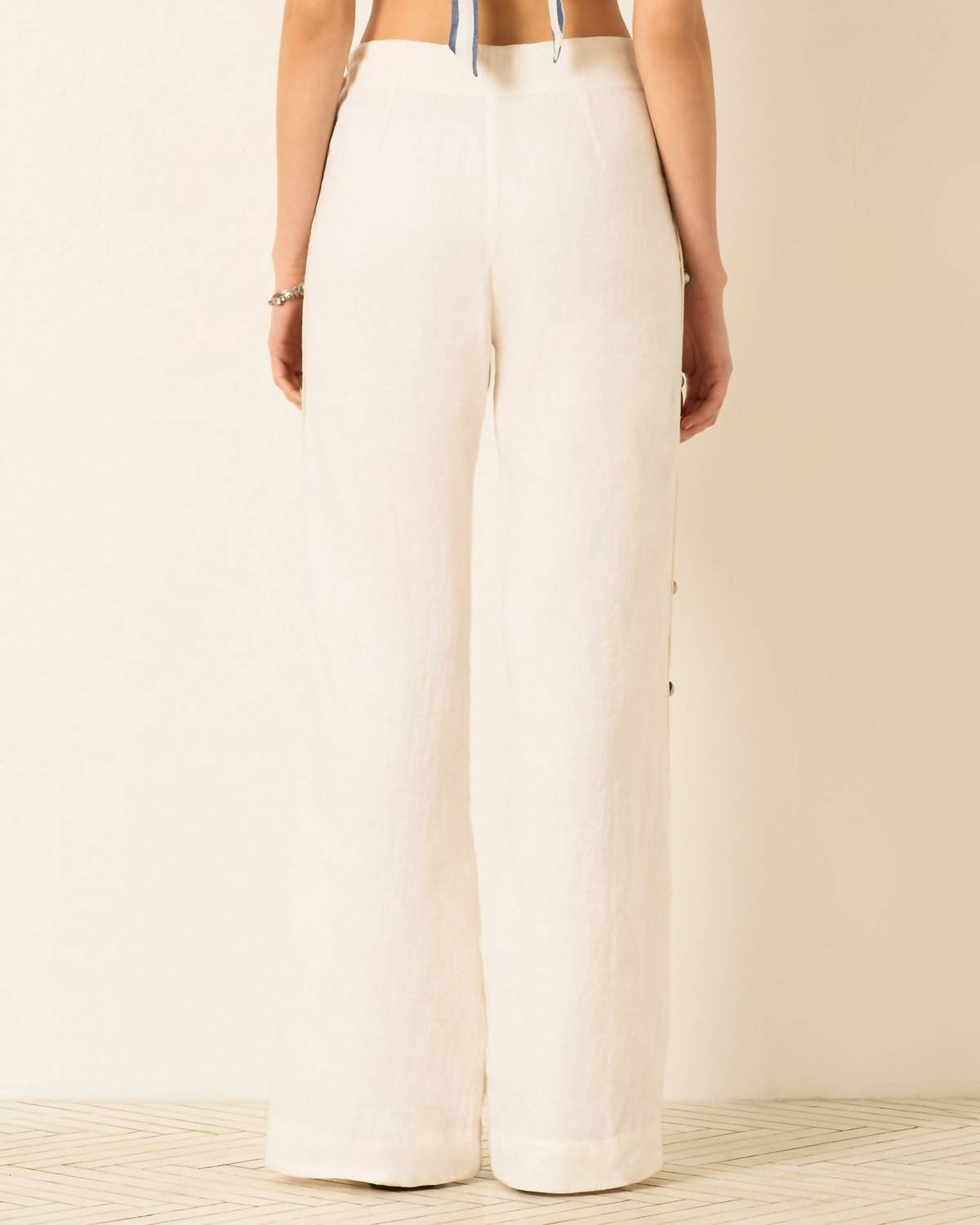 The trend report says boot-cut is in and that's exactly why we love this style. They are fit to perfection, flattering on any body type, and comfortable. They will be your go-to all season long. Introducing the Holland Linen Pant by ALIX OF BOHEMIA, a chic addition to your spring wardrobe in elegant pearl. These high-waisted, flared-leg pants are crafted from 100% linen and feature full-length metal beaded button closures. Made in India, they embody the quiet luxury trend and are a perfect choice for a beach day. Care instructions recommend dry cleaning to maintain their pristine condition.