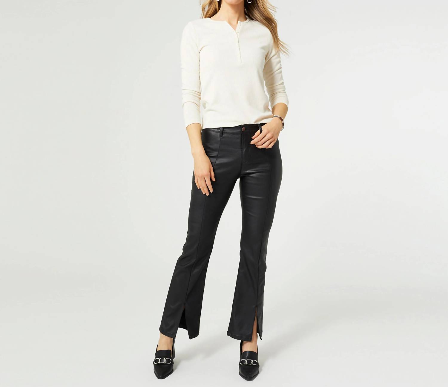 Slightly flared pants are all the rage right now and these are no exception. Pair these with your favorite tee for a more casual look, or with your favorite button-up blouse for an evening out. Discover the OMG Zoey Zip Bootcut Faux Leather Pant by COCO + CARMEN, a chic addition to your wardrobe in sleek black. These pants feature a flattering high-rise fit, flared leg style, and a sophisticated front slit with a functional zip closure. Made from a premium blend of cotton, viscose, and spandex, they offer comfort and a slimming effect with a built-in elastic waistband. The design includes real front pockets and belt loops, perfect for an evening event or a trendy minimalist look. Enjoy a comfortable and figure-enhancing fit with a 30" inseam.