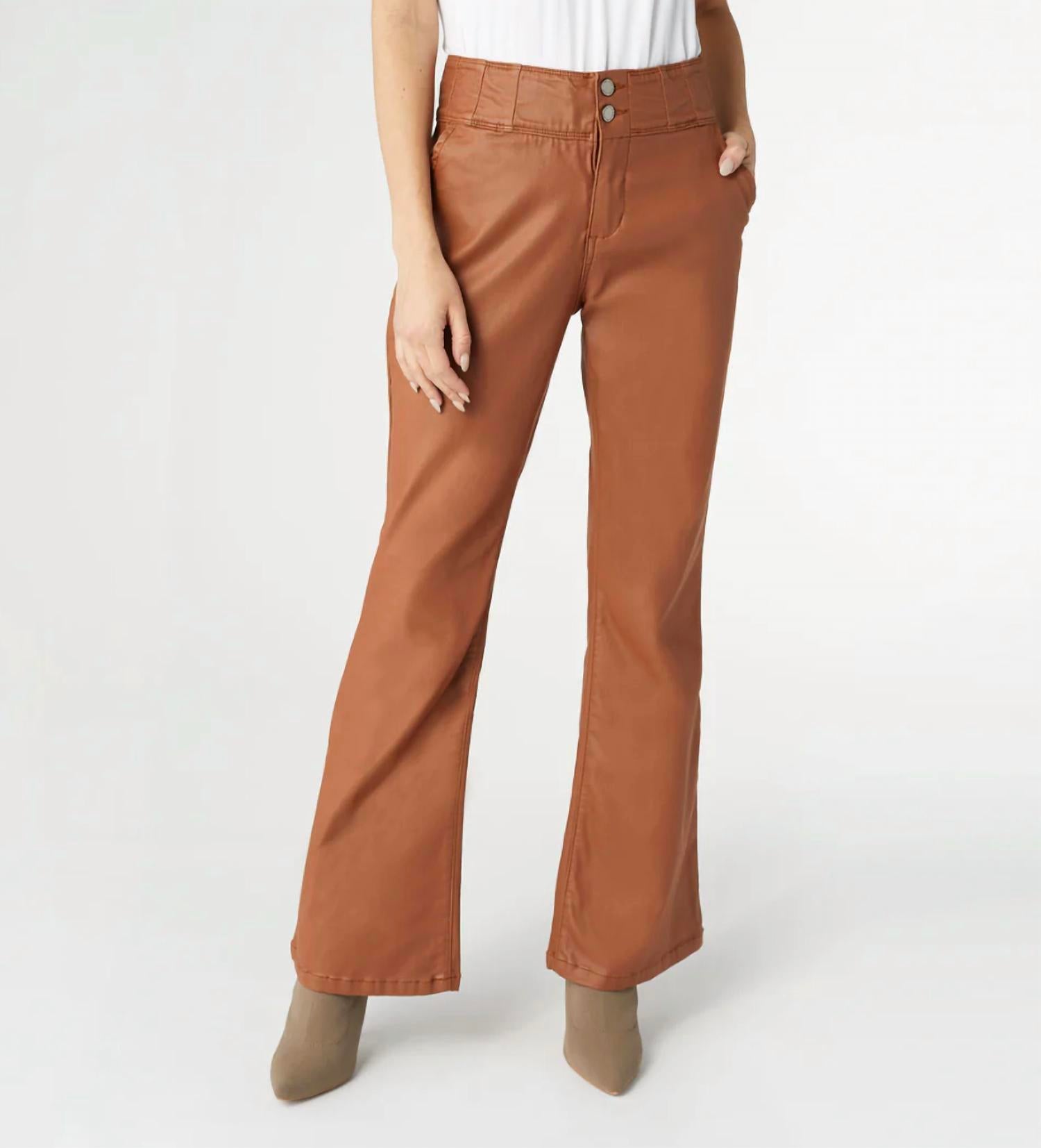 Stay on trend with these stylish boot cut pants that are fit to perfection. The perfect combination of comfort and fashion, you'll be grabbing for these all season long! Introducing the OMG ZoeyZip Faux Leather Flare by COCO + CARMEN, designed to flatter every silhouette with its regular fit and flared leg style. These jeans blend cotton, polyester, and spandex, offering premium stretch to smooth and shape, while the built-in tummy-slimming waistband provides all-day comfort. With a double button closure and working zipper, this cognac-colored piece features real front pockets and belt loops, complemented by a 30-inch inseam. Embrace style and comfort with these solid-patterned jeans that truly make a statement.