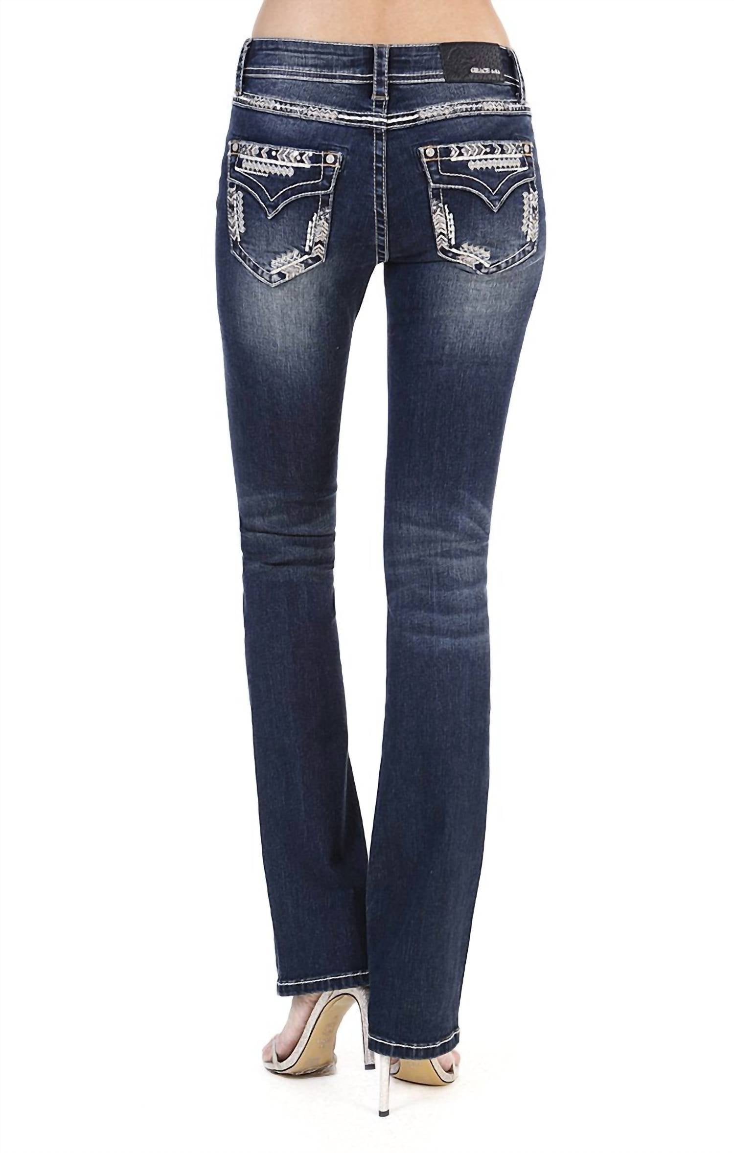 Stay on trend with these stylish boot cut pants that are fit to perfection. The perfect combination of comfort and fashion, you'll be grabbing for these all season long! Discover the Mid Rise Faux Flap Pocket Jeans by GRACE IN LA, crafted for women who prefer easy fit with a perfect amount of stretch. These patterned jeans in a classic blue feature a bootcut leg style and come with a 32" inseam. They boast a button closure and a practical pocket design for effortless functionality. These jeans embrace a mid-rise, dark wash look, ideal for regular fit enthusiasts. Care instructions: Machine wash and tumble dry.