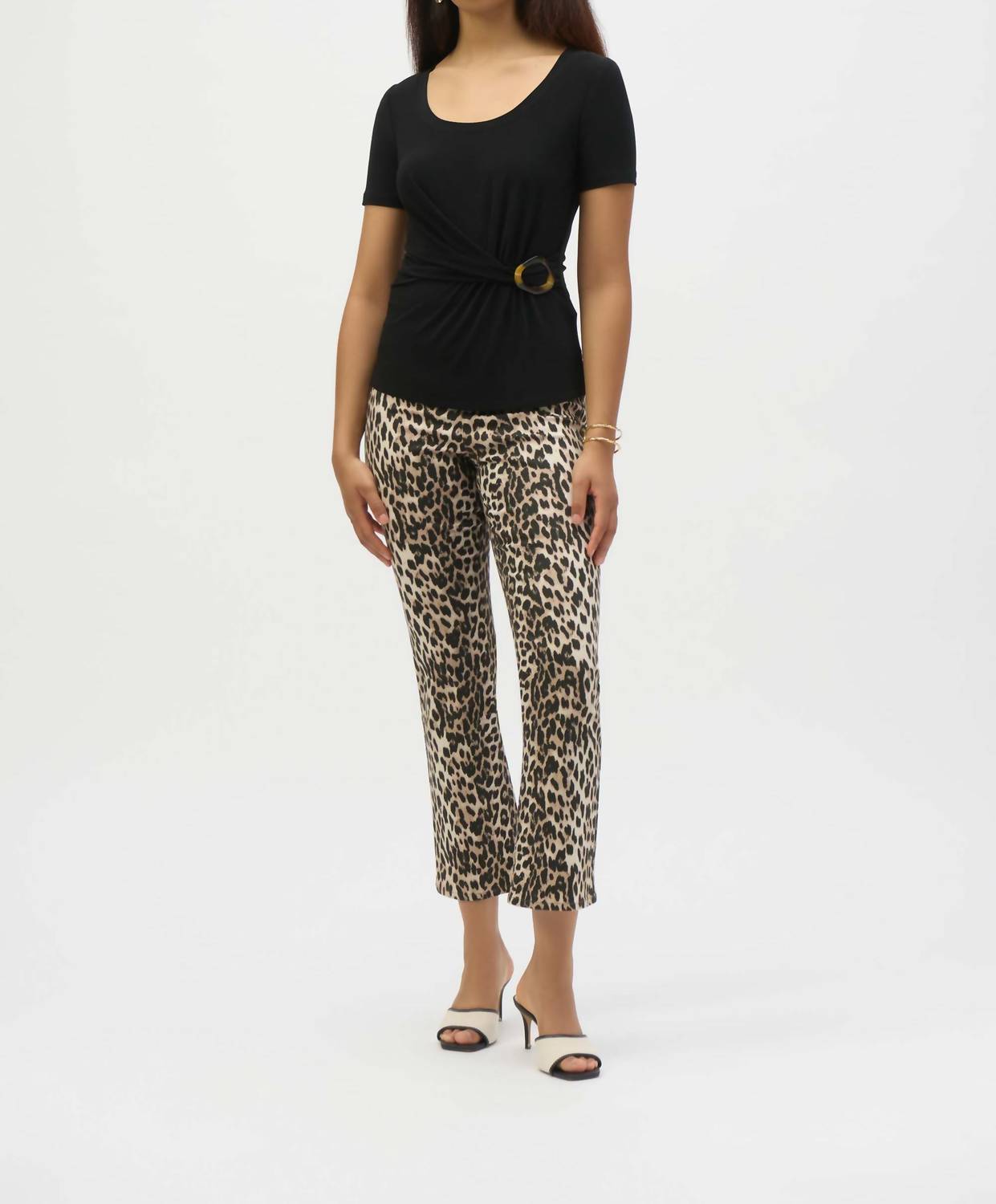 The trend report says boot-cut is in and that's exactly why we love this style. They are fit to perfection, flattering on any body type, and comfortable. They will be your go-to all season long. Introducing the Joseph Ribkoff Animal Print Flare Trousers, a chic addition to any wardrobe with a daring leopard pattern. These stylish trousers boast a full-length flared leg for a flattering silhouette, crafted from a comfortable blend of 95% Cotton and 5% Spandex. Designed with a relaxed fit, they feature a pull-on elastic waist, ensuring a seamless, pocket-free design. Perfect for spring evening events, these trousers are machine washable and suitable for tumble drying, making them both fashionable and easy to care for.