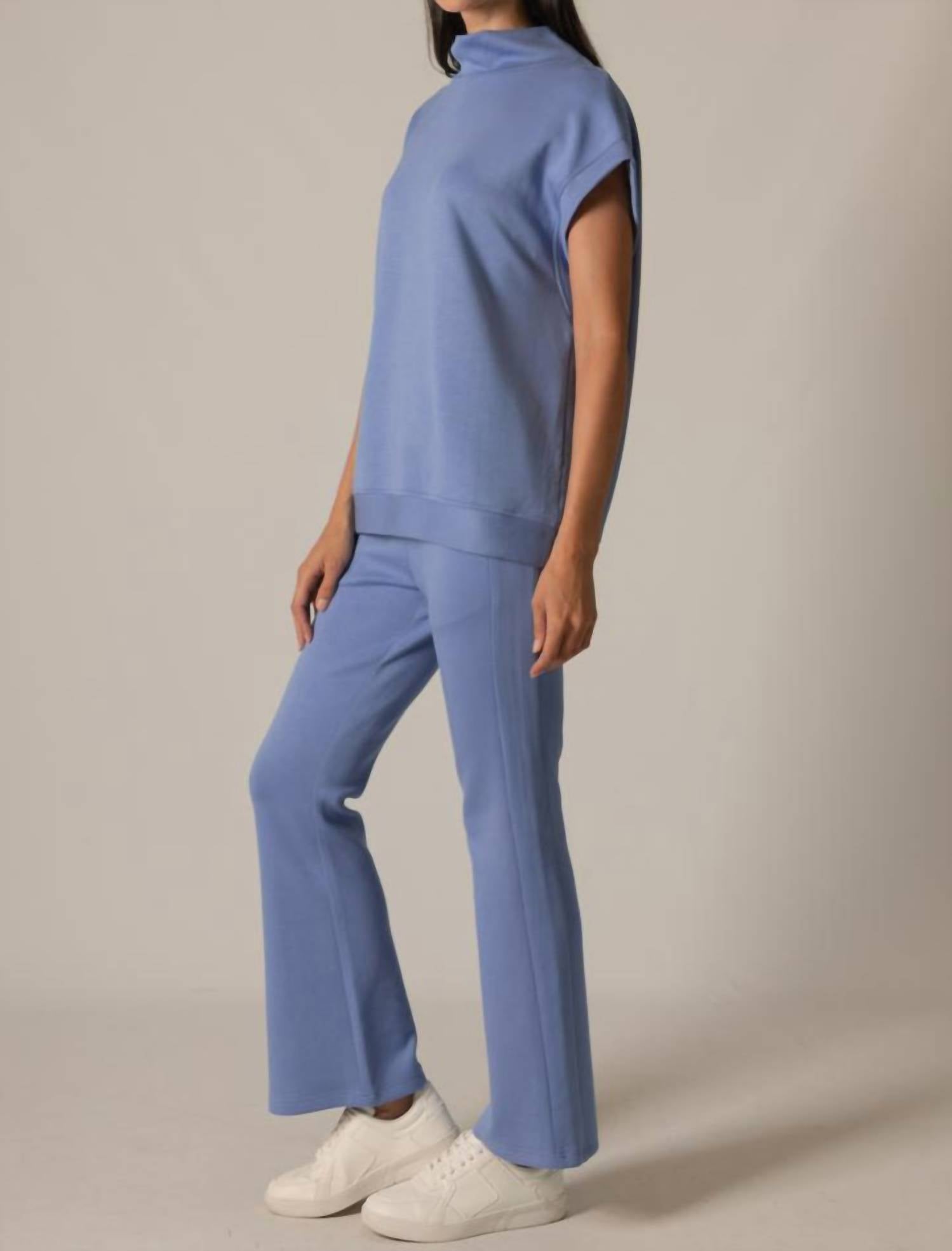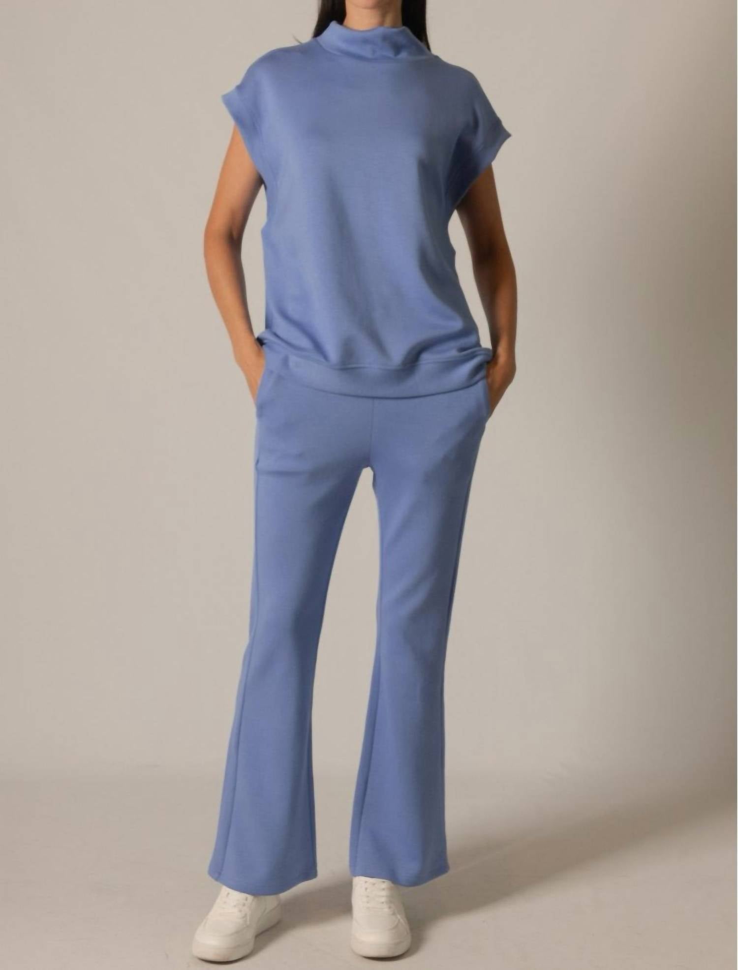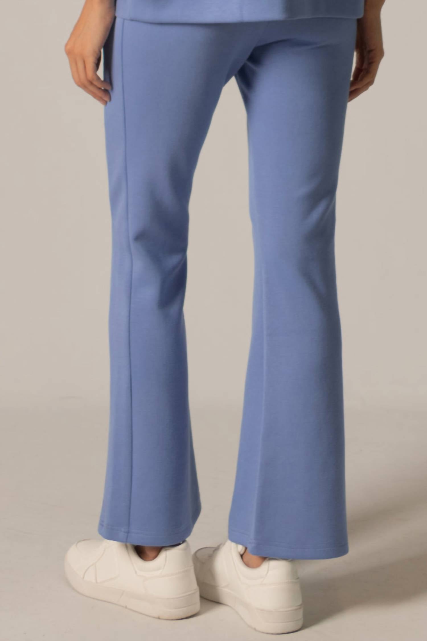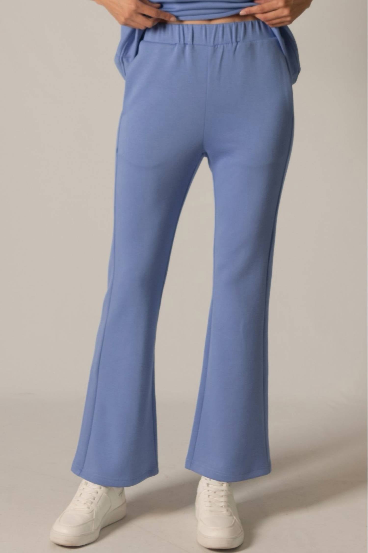 The trend report says boot-cut is in and that's exactly why we love this style. They are fit to perfection, flattering on any body type, and comfortable. They will be your go-to all season long. Experience elevated comfort with the Rumi Fitted Flare Pants by P.CILL, designed in a striking Cornflower Blue. These high-rise pants feature a slim fit with a flared leg, ensuring a flattering silhouette complemented by practical pockets. Crafted from a luxurious blend of 48% Modal, 48% Polyester, and 4% Spandex, they offer ultra-softness and breathability with a stretchy elastic waistband for ease. Closure: Pull-on style. Care: Machine wash or hand wash gently in cold or warm water, and line dry. Model is wearing a size small with a 28" inseam (Veda: 5'10" height, 24.5" waist, 36" hips, 32" bust).