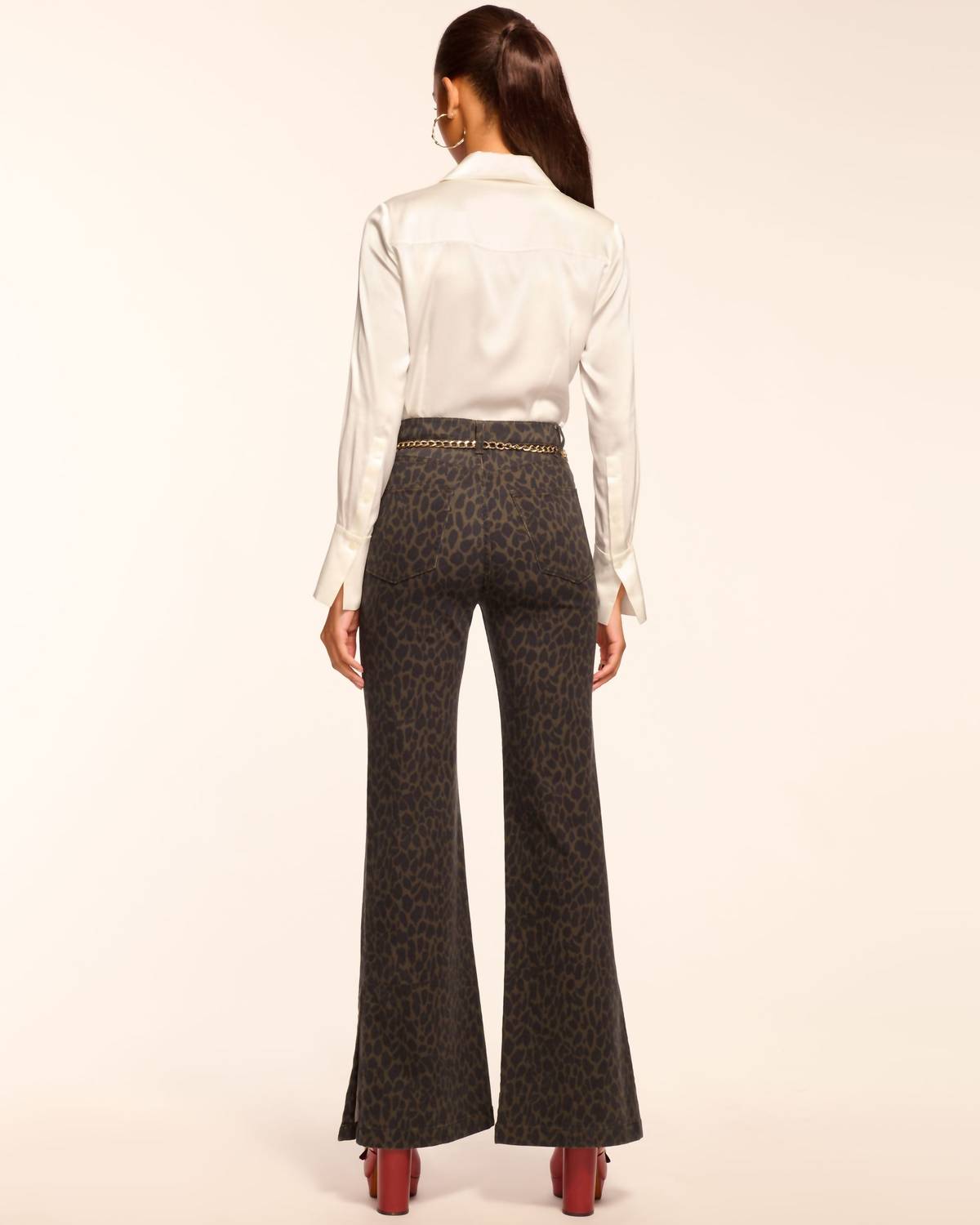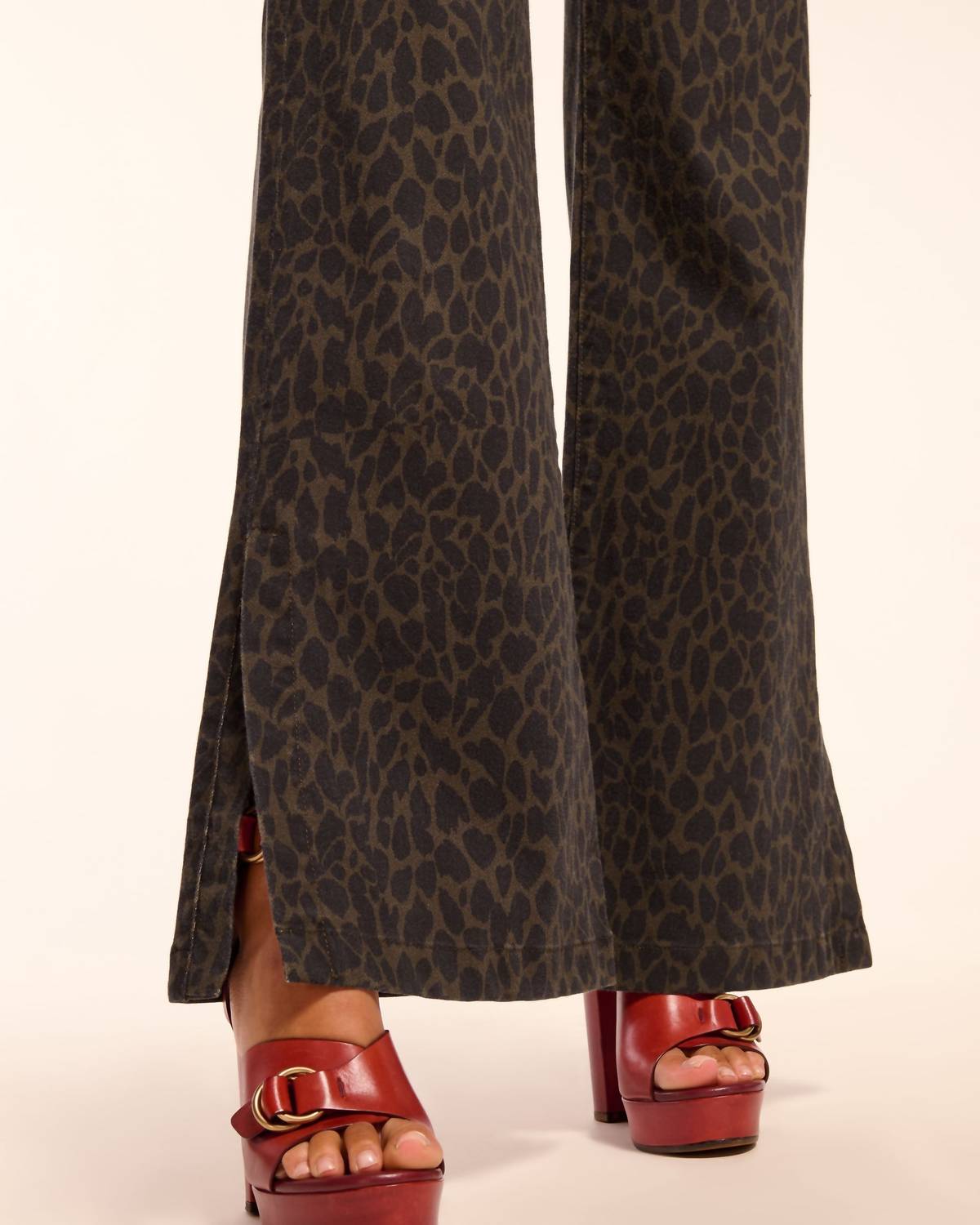 Stay on trend with these stylish boot cut pants that are fit to perfection. The perfect combination of comfort and fashion, you'll be grabbing for these all season long! Embrace fearless style with the Tyra Printed High-rise Flare Jean by Ramy Brook in Deep Olive. This women's jean features a high-rise waist with a relaxed, flared leg for a standout boho chic look, complemented by a striking cheetah print. Crafted from a cotton blend, it includes a button closure and is designed with functional pockets and belt loops. The inseam measures 34 inches, and the rise is 11.7 inches. Care instructions suggest dry cleaning or hand washing. 60% Cotton 37% Lyocell Tencel 3% Elastane.