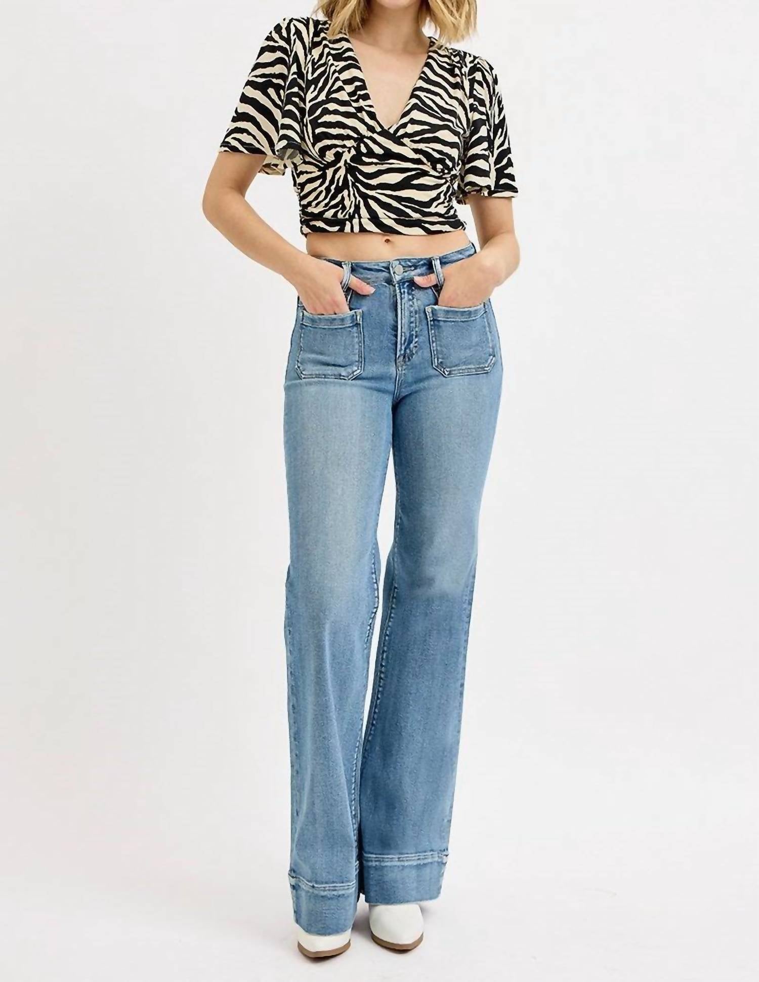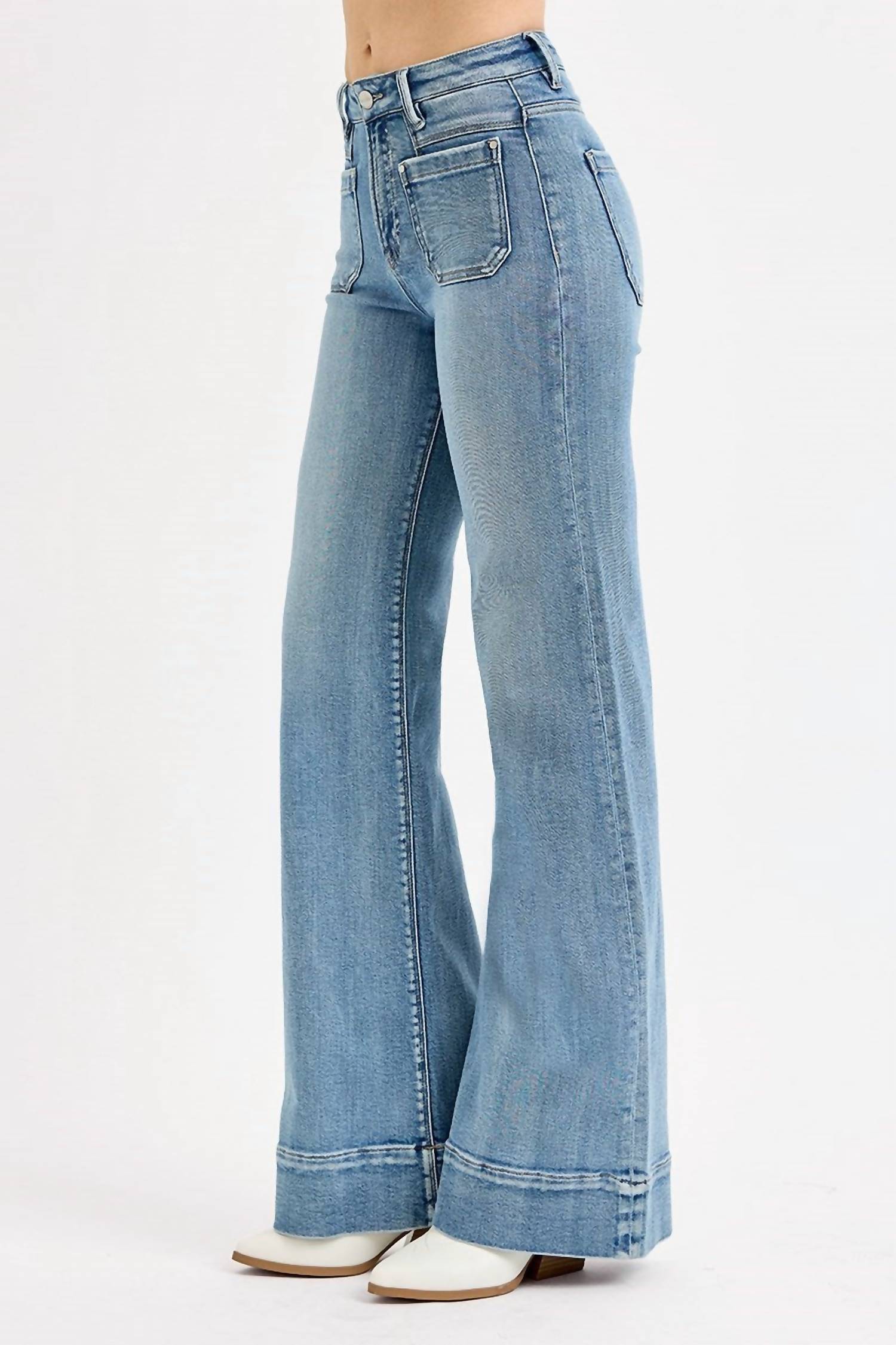 Slightly flared pants are all the rage right now and these are no exception. Pair these with your favorite tee for a more casual look, or with your favorite button-up blouse for an evening out. Experience the perfect blend of style and comfort with the High Rise Wide Flare Jeans by RISEN in light denim. Tailored from a cotton blend, these jeans feature a classic flared leg and a high-rise fit, with a rise of 10.5 inches and an inseam of 33 inches in size 3/26. They come complete with convenient patch pockets and a solid pattern, closed with a button closure for secure wear. For care, simply machine wash and tumble dry as needed. Model is wearing size 1 (5'9" height, 24" waist, 34" hips).