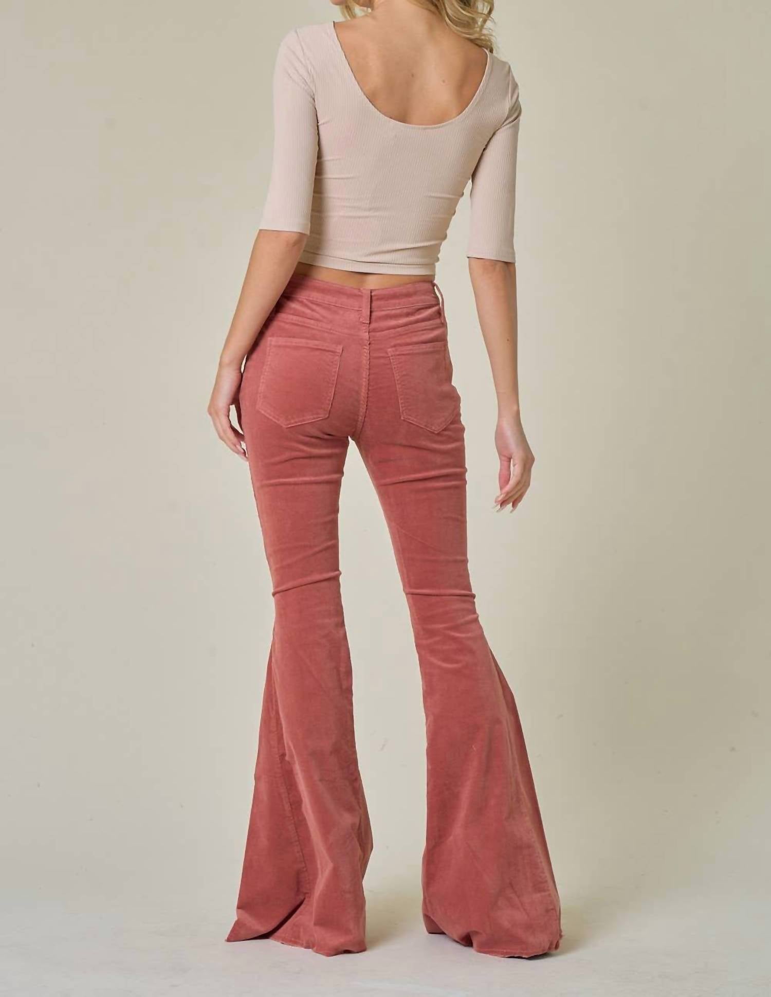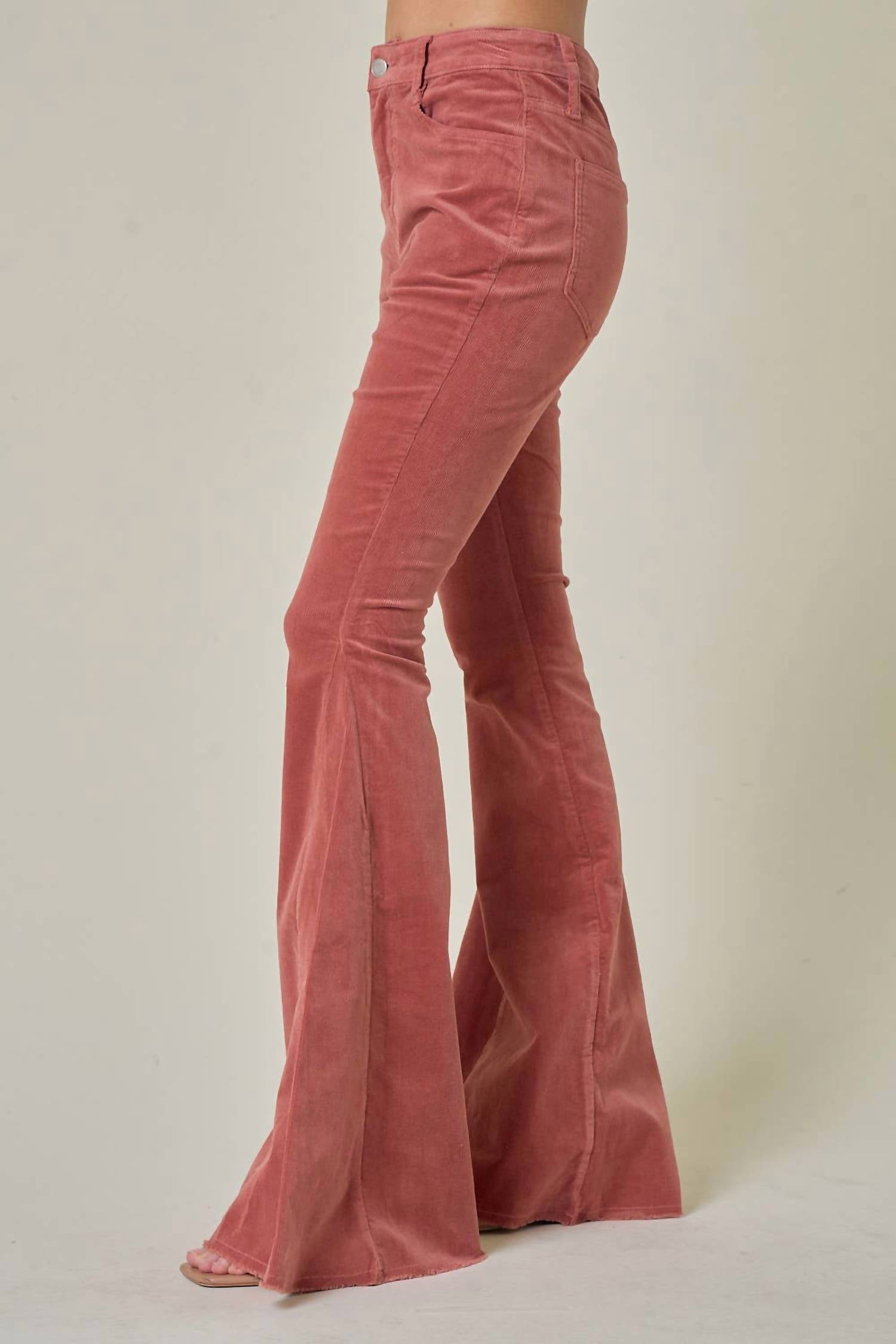 Slightly flared pants are all the rage right now and these are no exception. Pair these with your favorite tee for a more casual look, or with your favorite button-up blouse for an evening out. Step into style with the Corduroy Flares Pant by Saints & Hearts, featuring a bold Red Barn hue. Designed with a flared leg and ultra-stretchy corduroy material, these pants offer both comfort and chic holiday party appeal. Complete with a distressed hem and functional pockets, these pants are fastened with a zip closure. With a generous 35” inseam, this pair makes a statement for any occasion. Model is 5’8 and wears a size small.