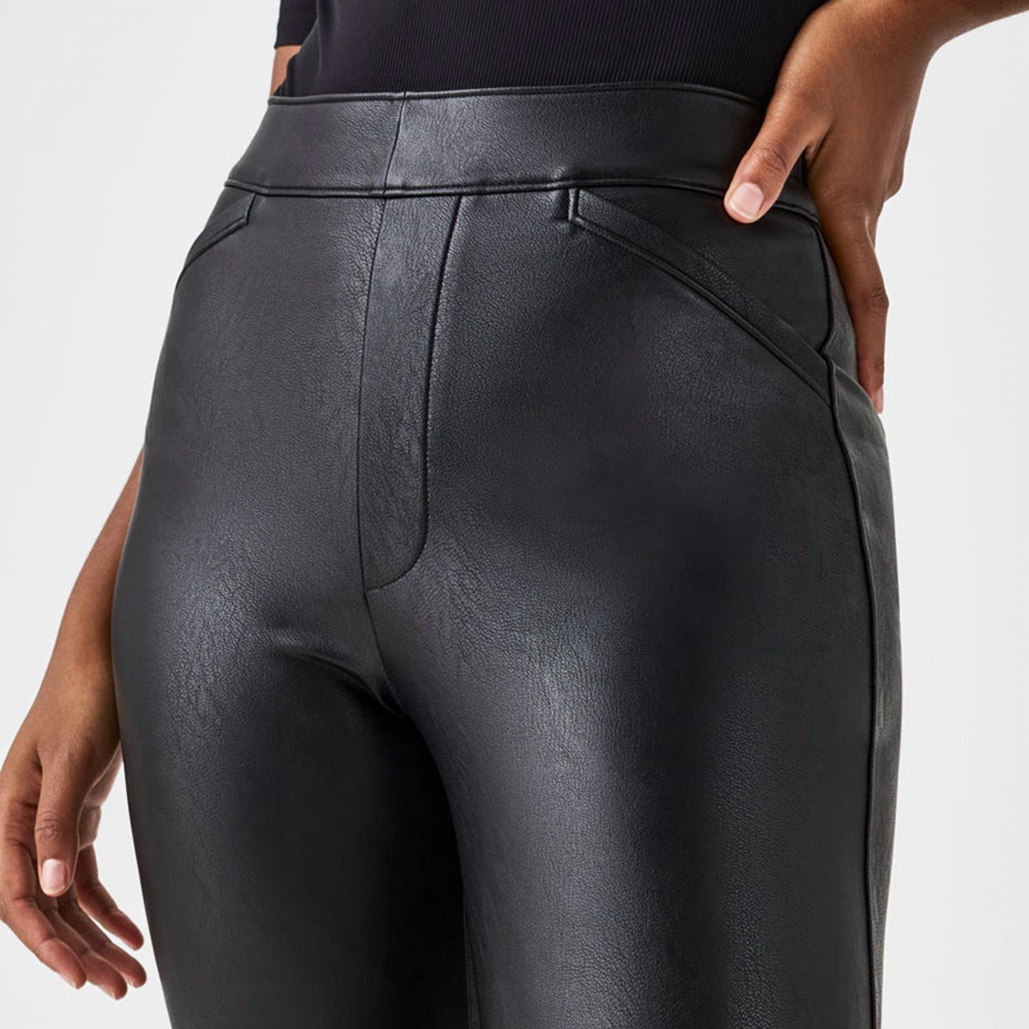 The trend report says boot-cut is in and that's exactly why we love this style. They are fit to perfection, flattering on any body type, and comfortable. They will be your go-to all season long. Introducing the Spanx Leather Like Flare Pant in classic black, a must-have for summer evening events with a grunge vibe. These pants are designed with a high-rise waist that hits at the natural waist, offering great coverage and comfort. Made from polyester, they feature a flexible fabric for easy movement without compromising the sleek leather-like appearance. With pull-on closure, these slim-fit pants include hidden core shaping technology, pockets, and a flattering flared leg style. Available in three inseam lengths: Petite 31.5”, Regular 34", and Tall 36". Easy to care for with machine wash instructions.