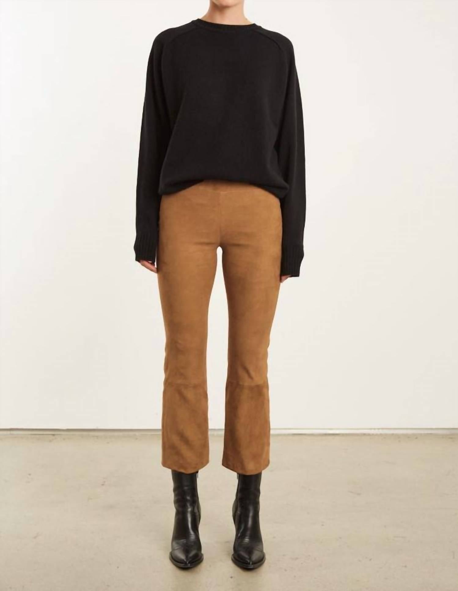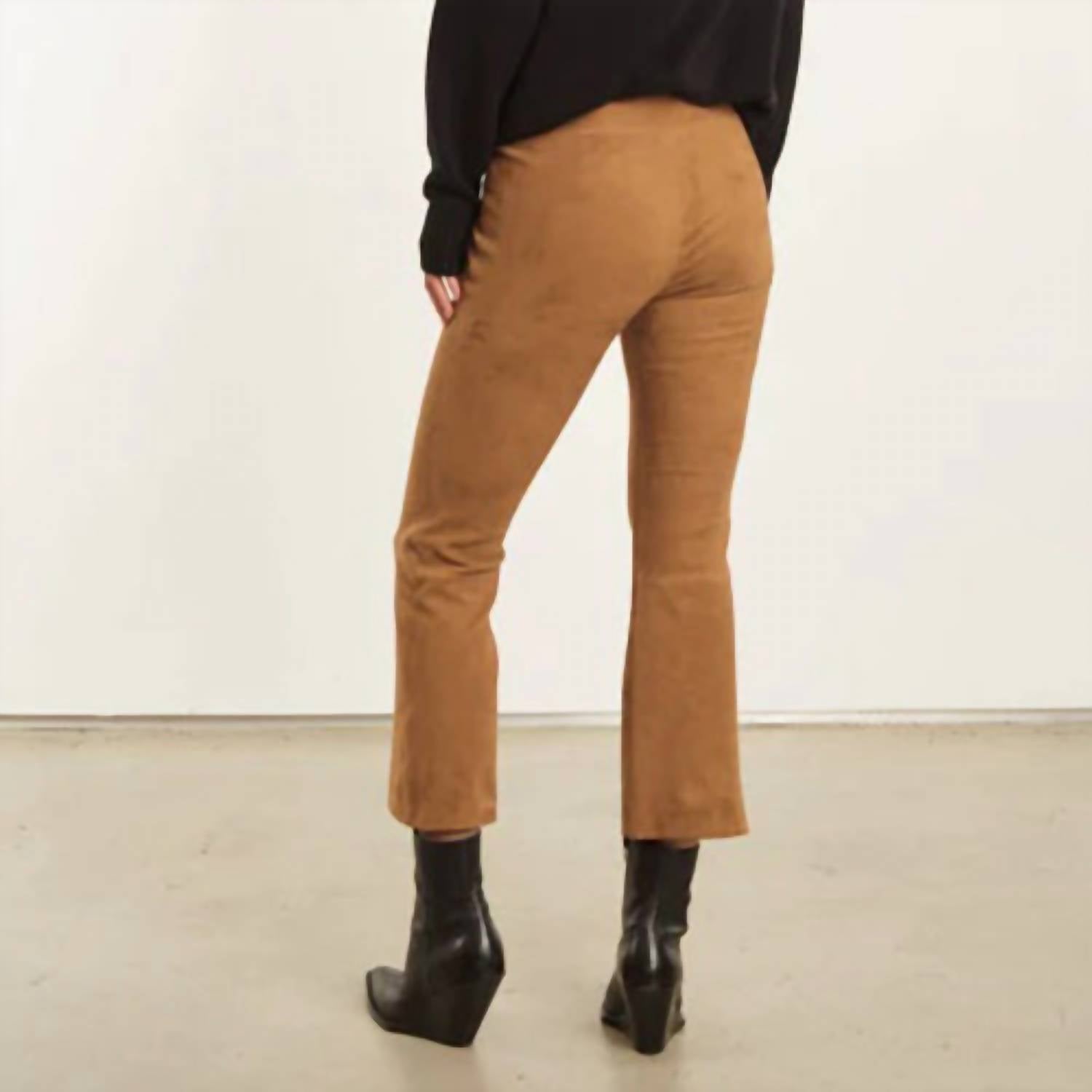 Slightly flared pants are all the rage right now and these are no exception. Pair these with your favorite tee for a more casual look, or with your favorite button-up blouse for an evening out. Introducing the Suede Crop Flare Pants by SPRWMN, a chic choice for minimalist style in a rich cognac hue. These high-rise pants feature a classic flared leg with a pull-on closure for easy wear, crafted from luxurious suede. Ideal for vacation-ready ensembles in the spring season, these pants keep it simple with a solid pattern and no pockets.