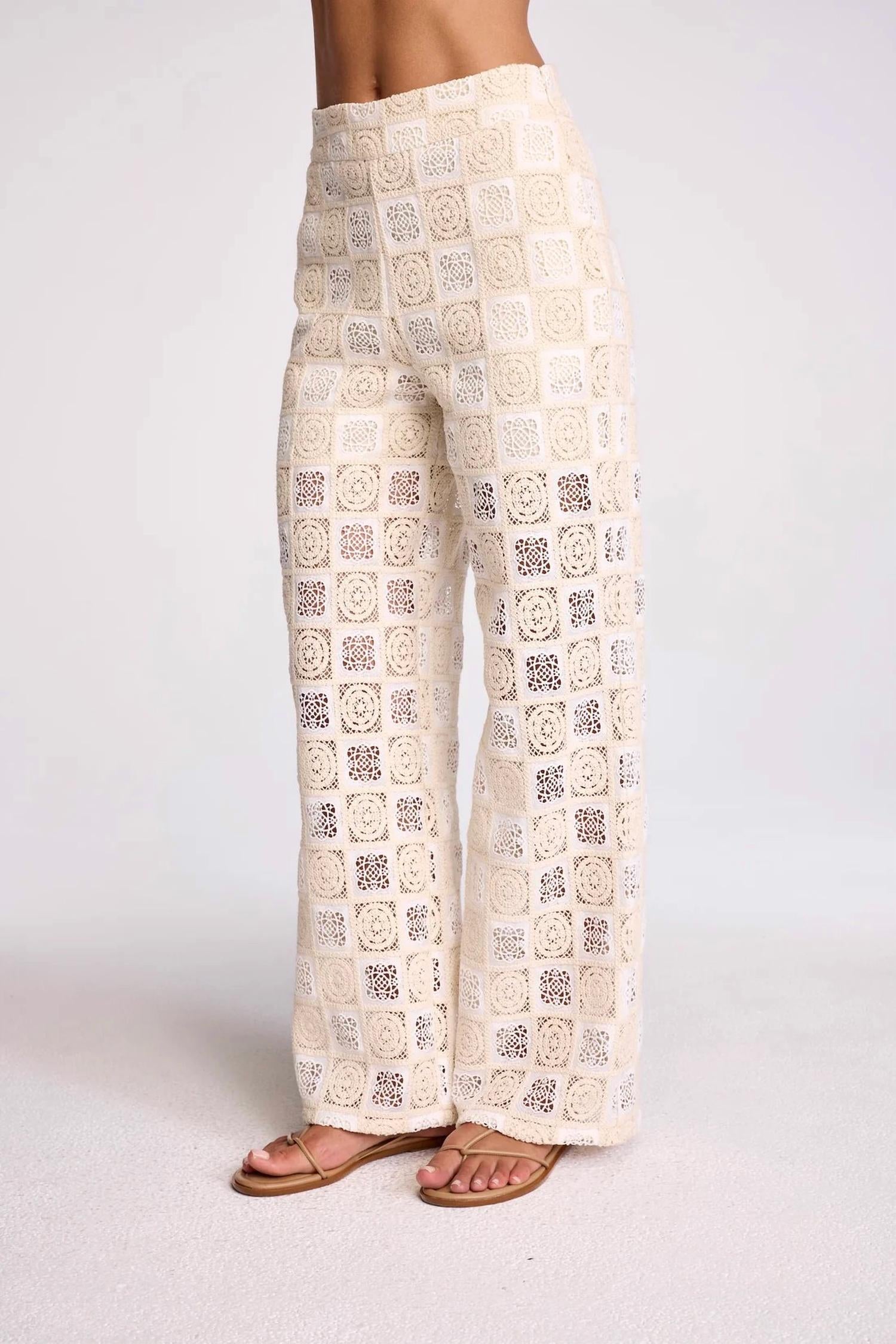 The trend report says boot-cut is in and that's exactly why we love this style. They are fit to perfection, flattering on any body type, and comfortable. They will be your go-to all season long. Perfect for a chic summer beach day. Cream, wide-leg pants feature a flared leg with a classic fit and a high-rise waist, adorned with a boho chic tan-and-white checker pattern. Crafted in an airy crochet knit, designed for warm weather with a lightweight mesh lining that offers mid-thigh coverage. Pull-on closure ensures ease and comfort, making them an ideal choice for any summer occasion.