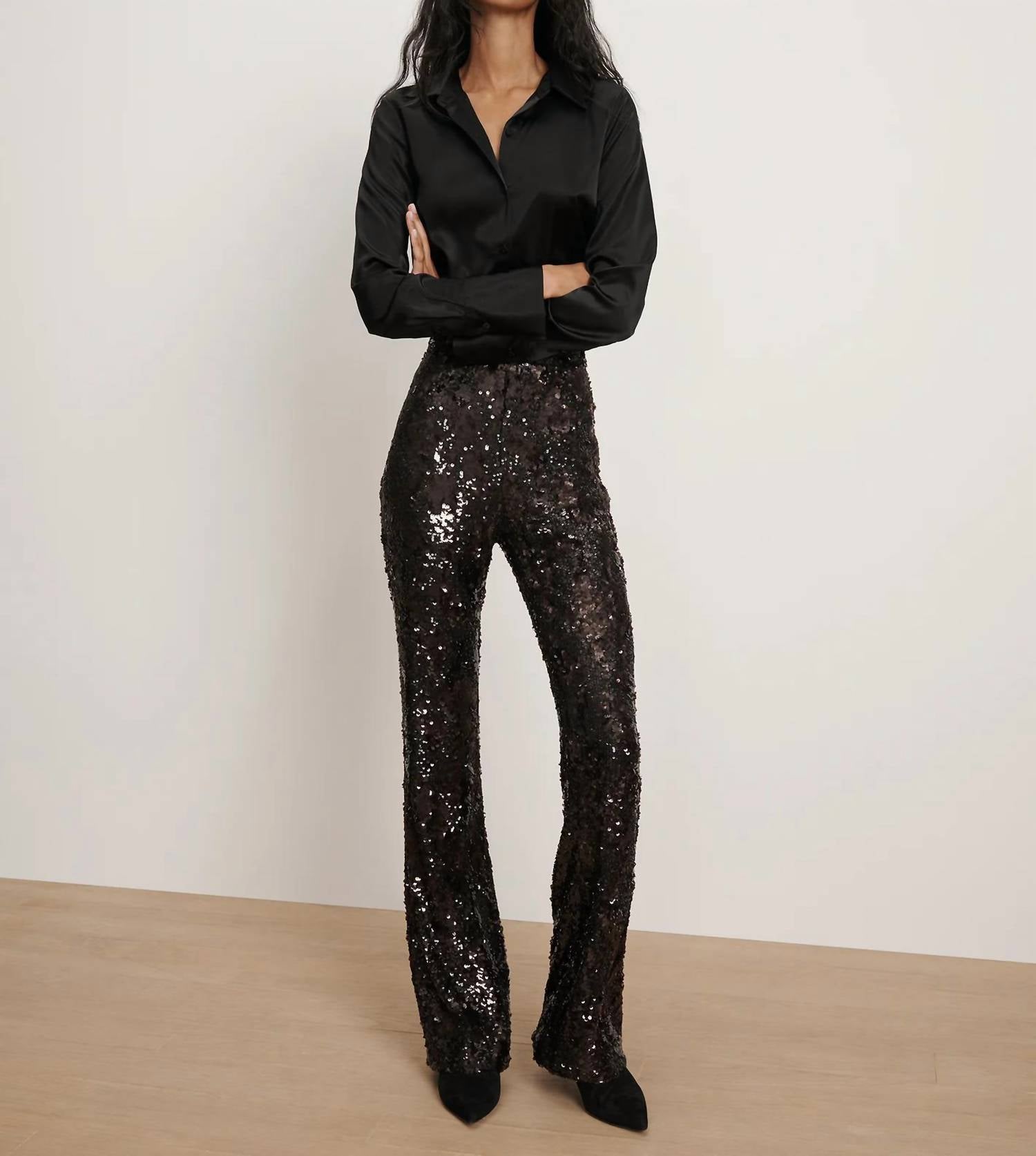 Stay on trend with these stylish boot cut pants that are fit to perfection. The perfect combination of comfort and fashion, you'll be grabbing for these all season long! A pant that leaves lasting impressions. Embellished with all-over maroon sequins, the Matty features a slim-fitting, skinny-flare silhouette with a flattering high-rise waist. A back zipper closure finishes the look. Pair with a plain T-shirt to let them really shine, or style with the matching Matty blouse for a striking set