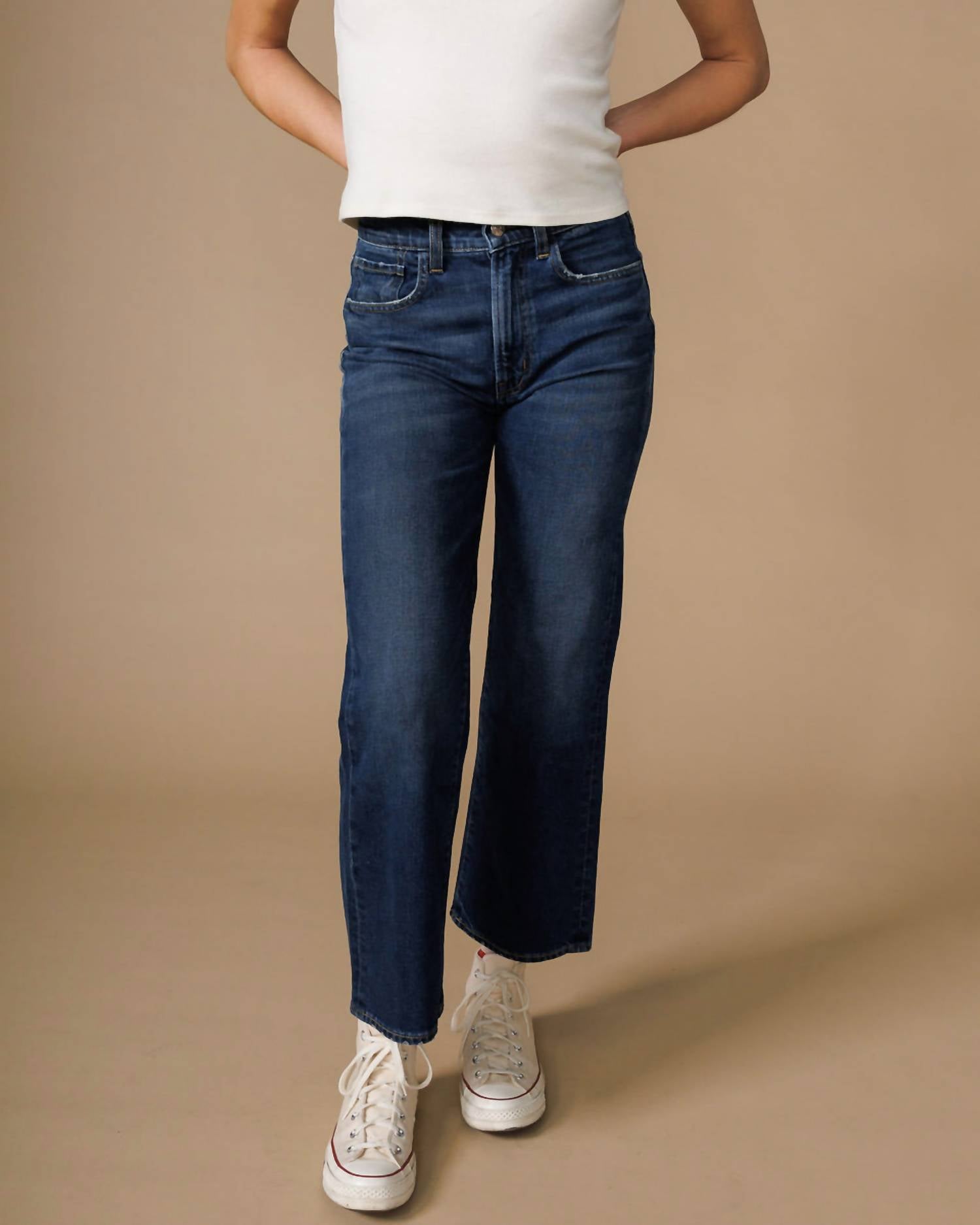 Pair these wide leg jeans with mules, slides or your favorite strappy sandals. Elevate your style with the EDWIN Marli Wide Leg Jeans in Penmar, a chic addition to your fall wardrobe. These high-rise jeans boast a wide-leg silhouette, sitting just above the ankle for a trendy streetwear appeal. Made from a Cotton Blend with 98% organic cotton and 2% spandex, they offer a comfortable, relaxed fit that hugs the waist and hips before flowing into a wider leg. Closure: Button closure. Care: Machine wash. Essential dimensions include a front rise of 10.25 inches, an inseam of 26 inches, and a leg opening of 17.75 inches.