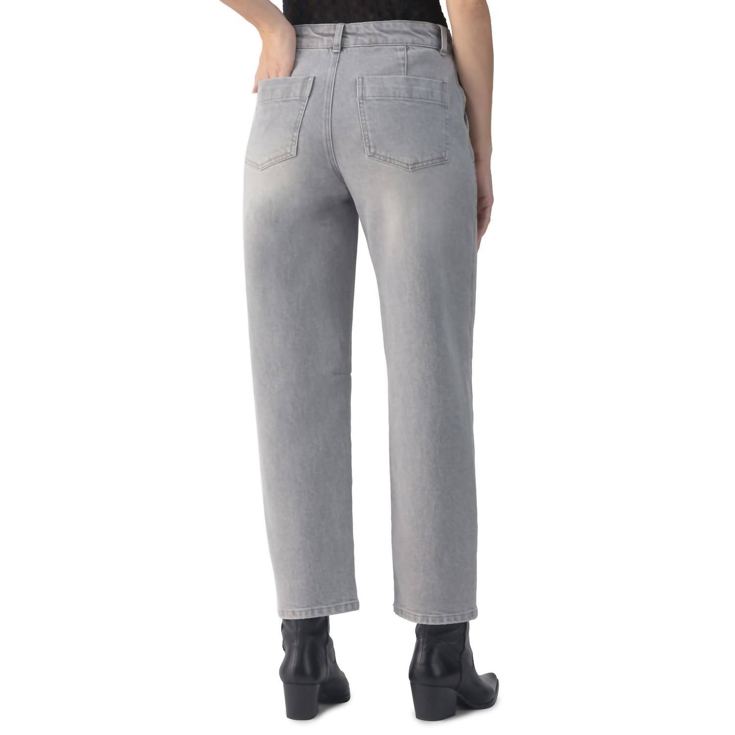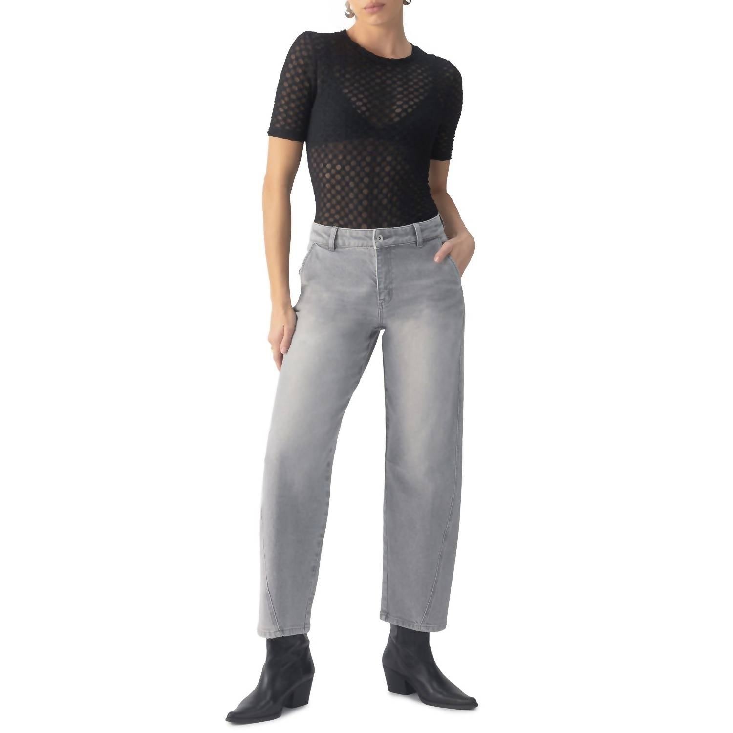 Pair these wide leg jeans with mules, slides or your favorite strappy sandals. Featuring a unique barrel-leg design in the understated Gray Mist hue. Crafted from 99% cotton and 1% spandex. Offer comfort with a relaxed fit and intriguing twisted seams for a fresh silhouette. Boast a high-waisted style with a zipper and button closure, complemented by front slant and back patch pockets. With an inseam of approximately 30 inches and a 10-3/4 inch rise. Provide a stylish twist to any streetwear-inspired fall travel ensemble. Care for them with a simple machine wash and tumble dry routine.