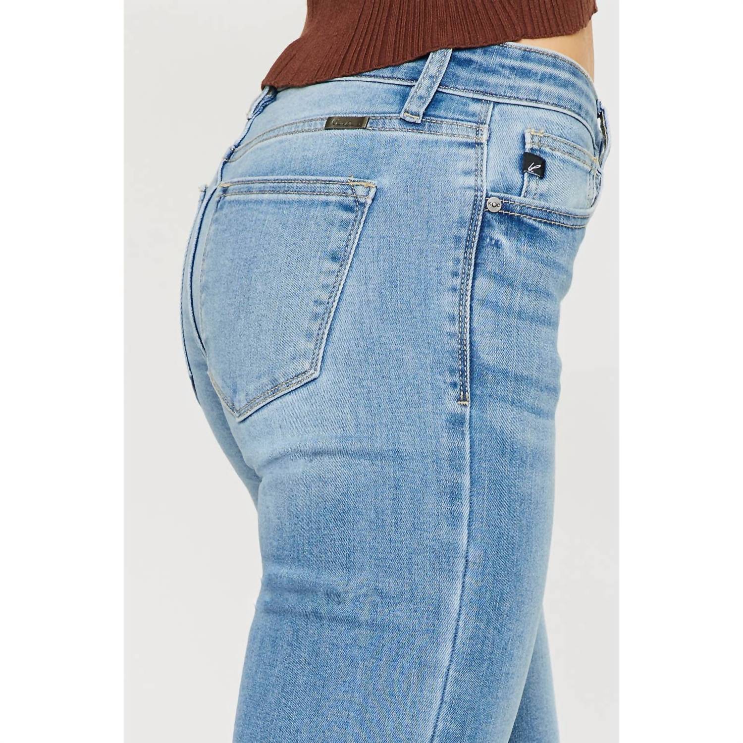 A flattering silhouette that's suprisingly versatile. Introducing the KanCan Mid Rise Flare Jeans, a perfect blend of style and comfort in a light stone wash. These stretch denim jeans showcase a flared denim design with a mid rise of 9.25 inches and an inseam of 33.75 inches in size 5/26. Crafted from a quality cotton blend (68% cotton, 30% polyester, 2% spandex) and weighing 11.5 oz, they promise a flattering regular fit. Closure is secured with a button, and they are easy to care for with machine wash and tumble dry instructions.