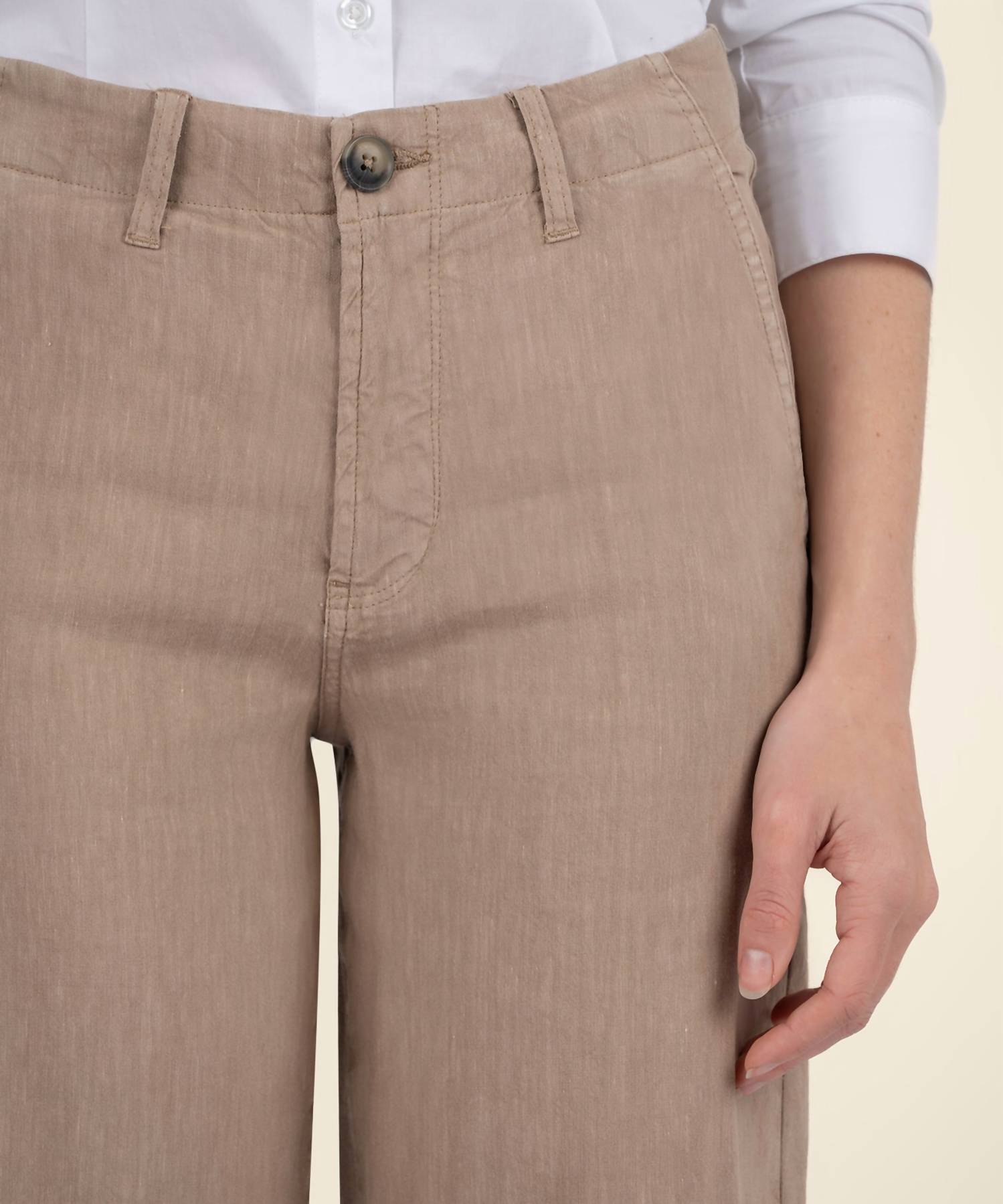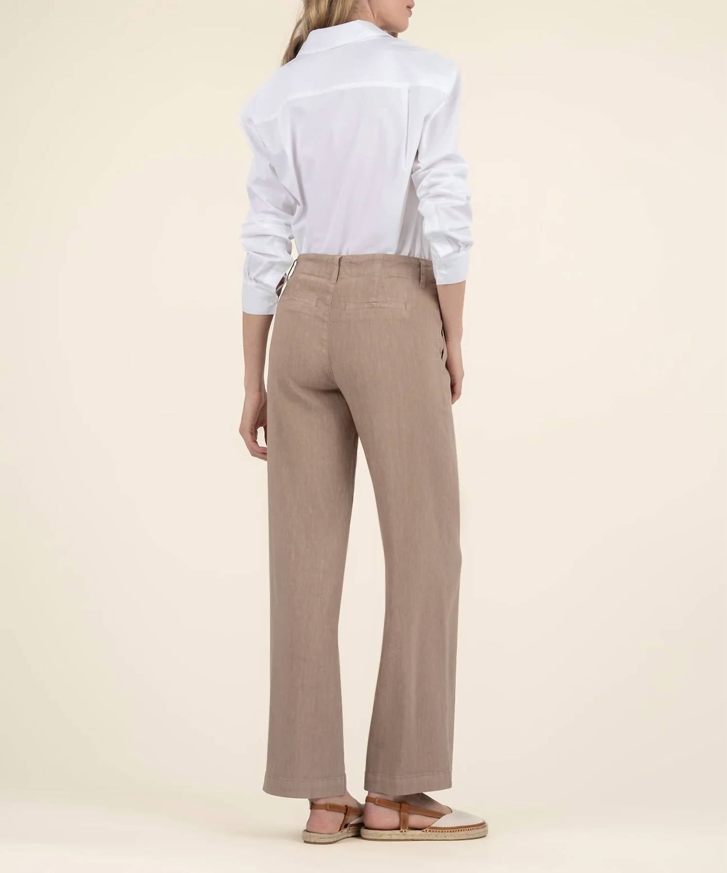 Pair these wide leg jeans with mules, slides or your favorite strappy sandals. Step into spring with the Meg Wide-leg Pant by KUT FROM THE KLOTH, the ideal blend of style and comfort in a chic khaki shade. Featuring a mid-rise and a regular fit, these pants offer a relaxed silhouette with a 30" inseam and 23" leg opening. Crafted from a lightweight linen blend of 50% Linen, 48% Rayon, and 2% Spandex, they ensure ease of movement while retaining their shape. Closure: Button closure. Care: Machine wash.