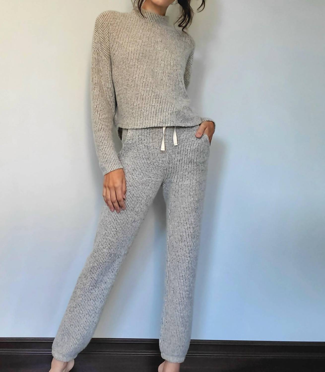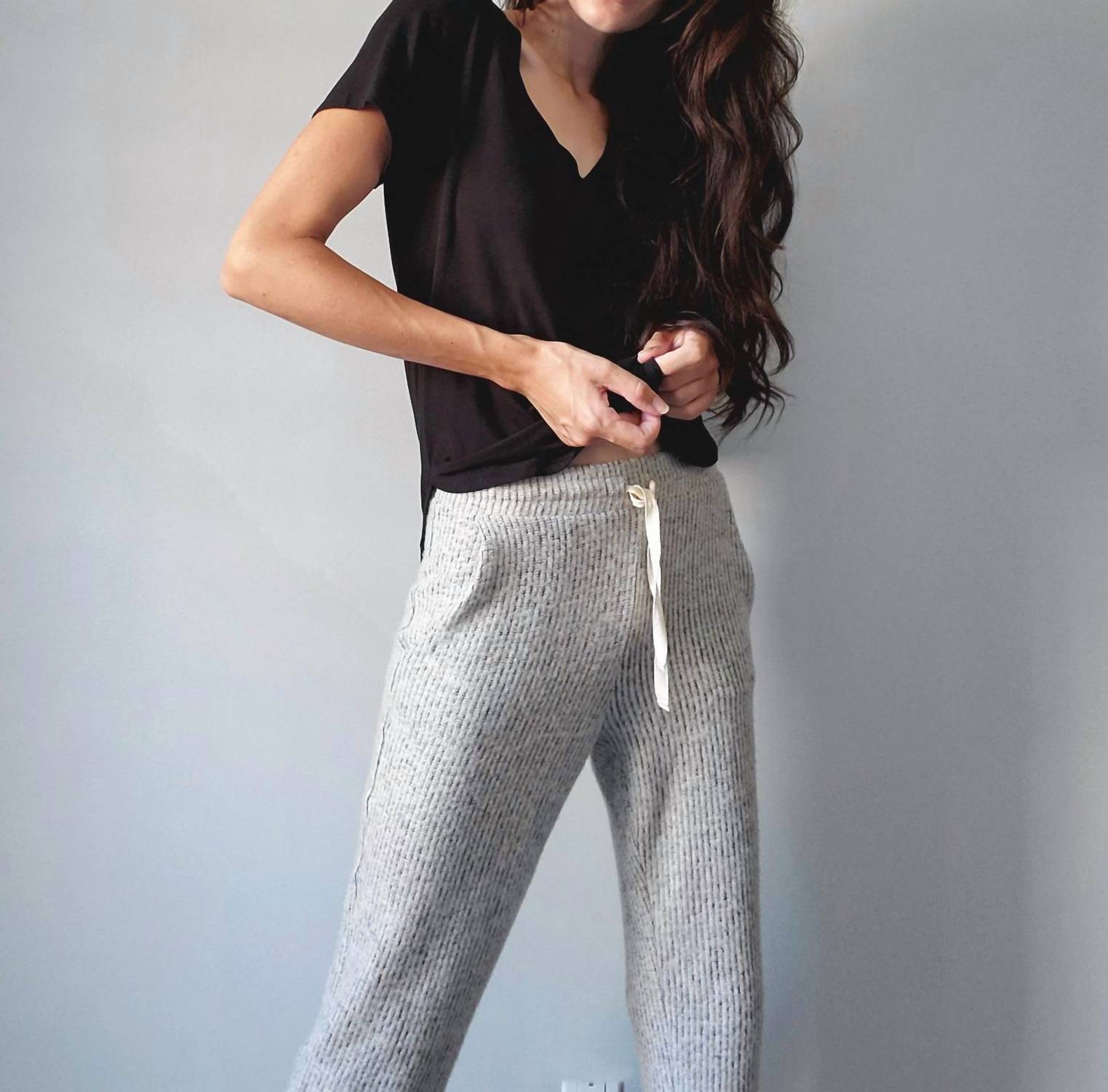 Pair these wide leg jeans with mules, slides or your favorite strappy sandals. Experience unparalleled comfort with the Mariella Cozy Pant by LBLC THE LABEL, available in sophisticated oatmeal and black. Designed with a relaxed, mid-rise fit and featuring a vegan, ribbed marled knit, these pants come with a tie closure and elasticized waistband for effortless wear. Fabricated from 97% polyester and 3% spandex, these wide-leg pants are perfect for adding a touch of streetwear chic to your wardrobe. Complete with functional side pockets and care instructions for easy maintenance: hand wash in cold water, line dry, and iron on low heat. Model is 5'11" and wearing a size small.