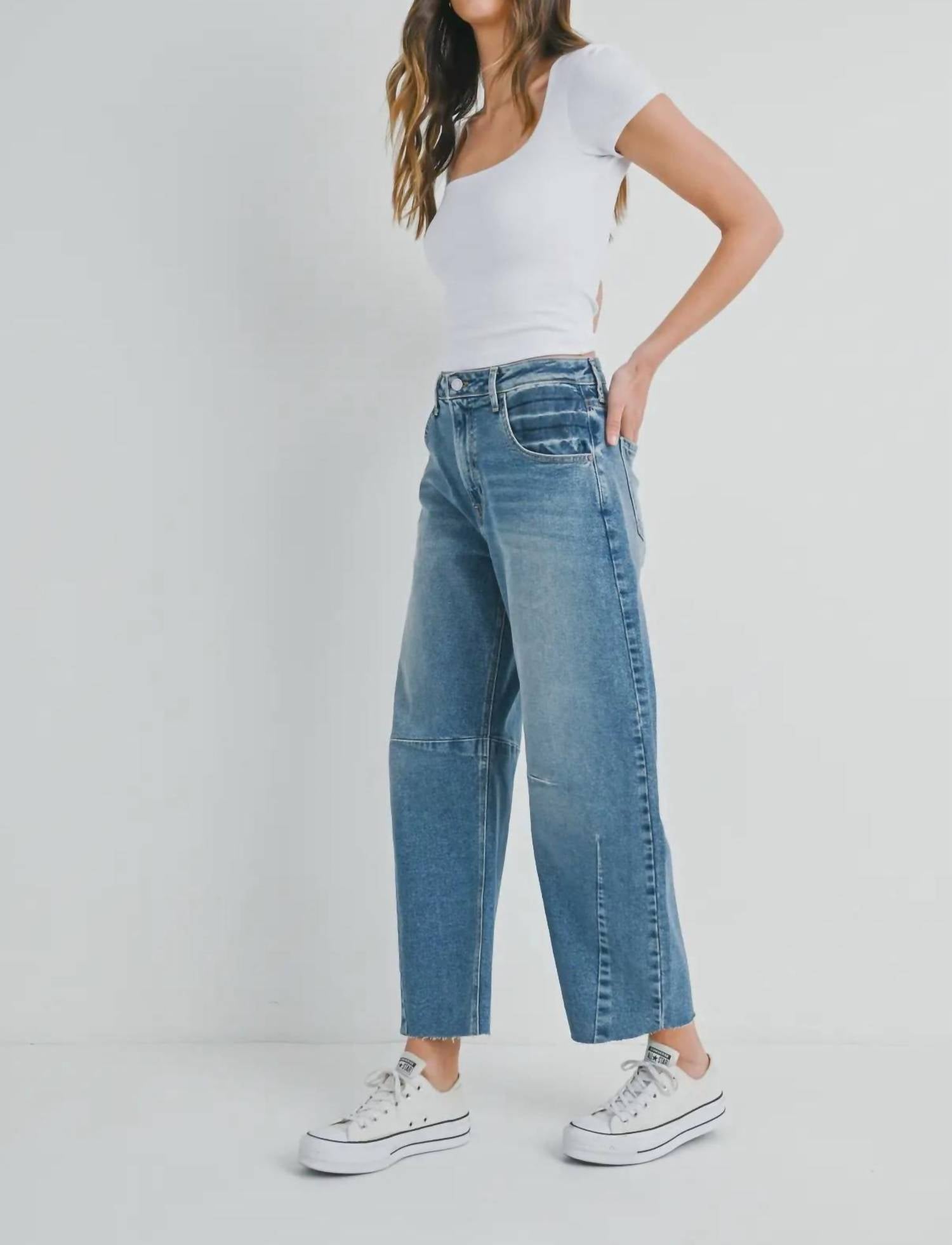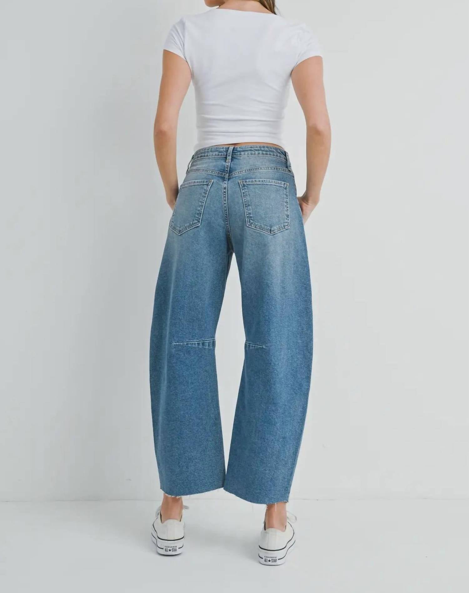 A flattering silhouette that's suprisingly versatile. Discover the Seam Barrel Leg Jeans by JUST BLACK DENIM, a chic addition to your Spring wardrobe. Crafted in the USA, these jeans flaunt a medium wash with a relaxed, wide-leg style and unique seam details at the knee. Designed for a comfortable fit with a 12” rise and 27” inseam, they feature a tie closure and pockets for practicality. Made from 96% Cotton, 3% Elasterell-P, and 1% Spandex, they are easy to care for with machine wash and tumble dry instructions.