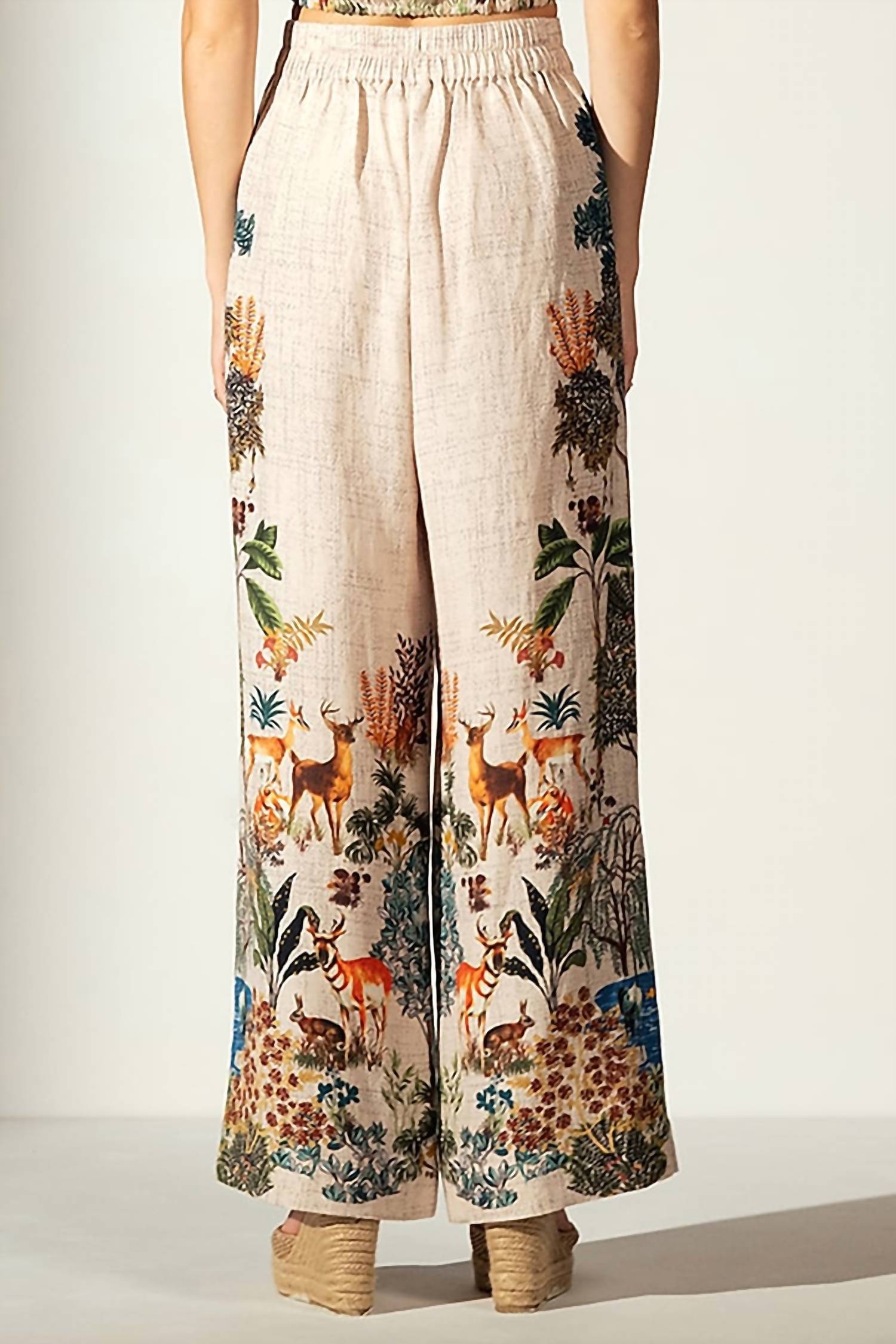 Pair these wide leg jeans with mules, slides or your favorite strappy sandals. Introducing the Skyla Pants by Ranna Gill, a perfect blend of style and comfort in a multi-color floral pattern. These wide-leg pants are crafted from a luxurious linen blend and feature a high-rise, relaxed fit, complete with convenient pockets. With a flat front and elastic back for a flattering silhouette, these pull-on pants are ideal for a beach day or any summer occasion. Care Instructions: Dry clean only.