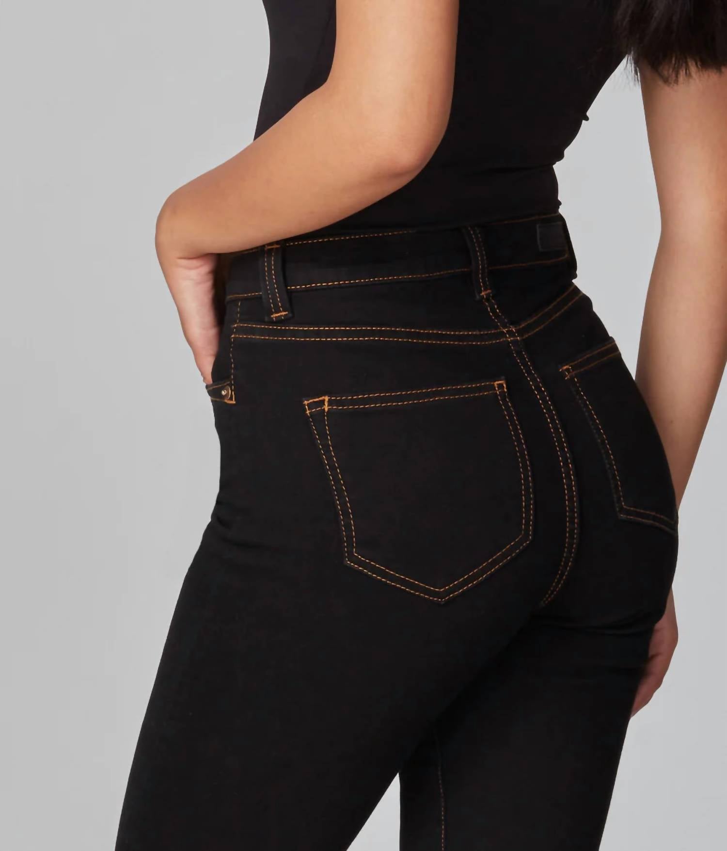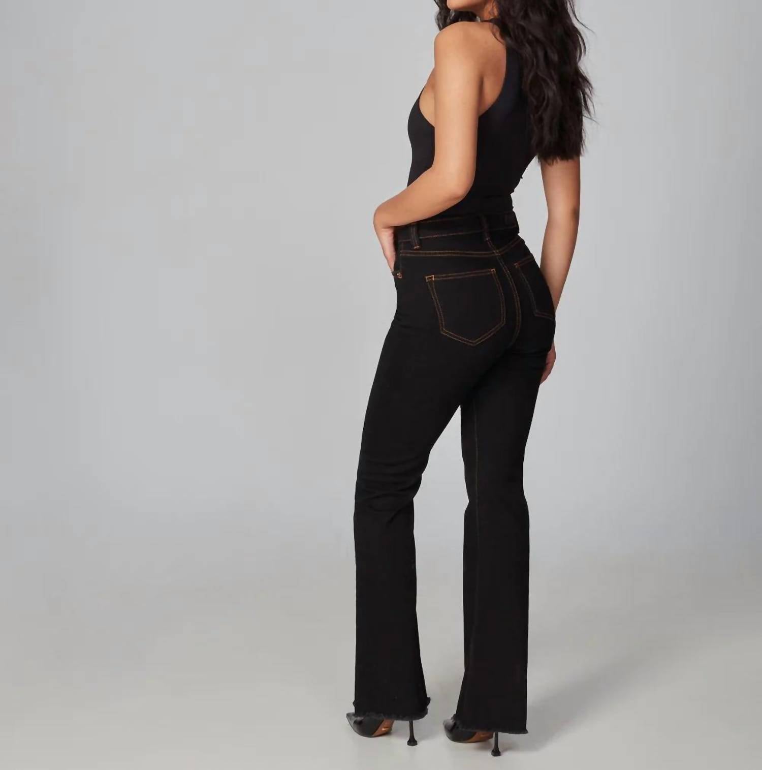 High-Rise Flare Jeans. Stretch Premium Denim. Inseam: 32". Raw Hem. 92% Cotton 6% Polyester 2% Lycra. Machine wash. Tumble dry low. True to Size.