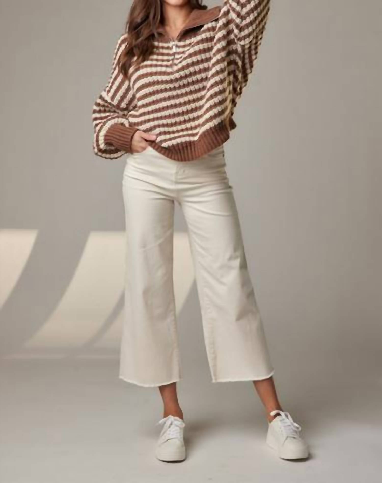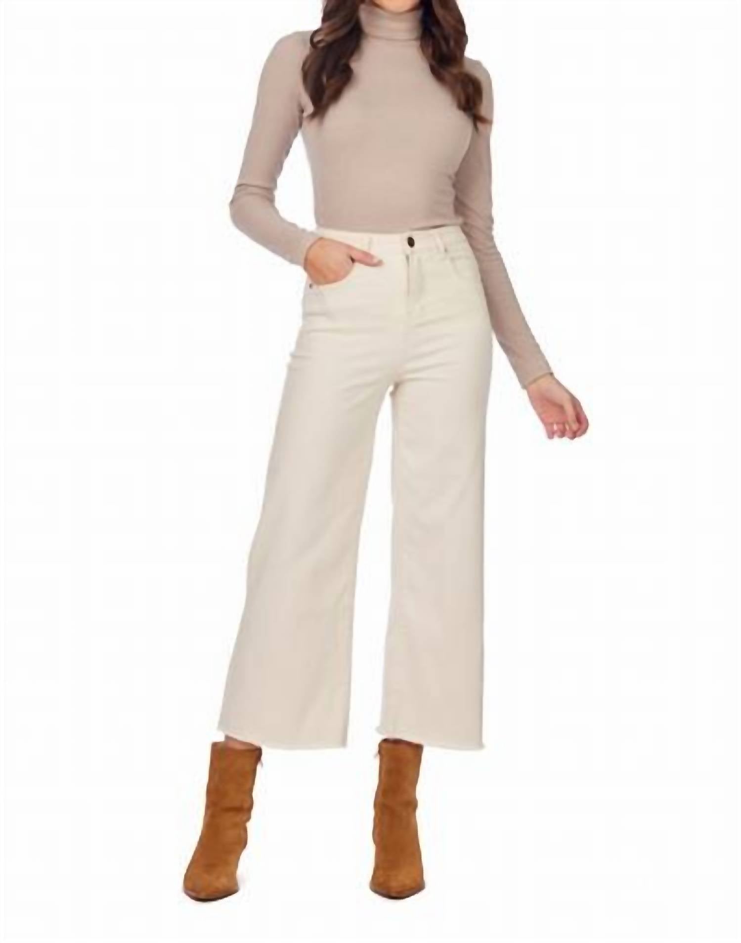 A flattering silhouette that's suprisingly versatile. Experience the Crawford Wide Leg Jeans by Mud Pie in chic beige, tailored for a trendy look with their wide leg silhouette and raw hem edge. These jeans are meticulously crafted from stretch denim, promising comfort while embracing a classic five-pocket style paired with a secure zip closure. Designed with a high-rise fit, these jeans feature a light wash and fit true to size—ideal for any holiday party. Inseam measures approximately 25 1/2" on size small; for a tighter fit, consider sizing down.