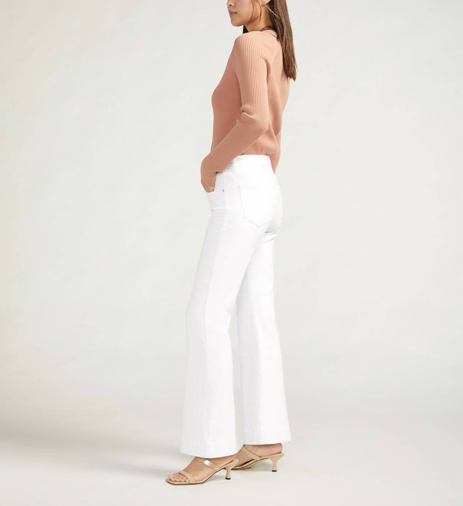 Pair these wide leg jeans with mules, slides or your favorite strappy sandals. Introducing the Kait Mid Rise Flare Leg Jeans by JAG, your go-to piece for versatile, everyday wear. Featuring a medium indigo wash, these jeans offer a flattering 10" mid rise with a classic flare leg and a 22.5" leg opening, perfect for any occasion from music festivals to casual outings. Made from 100% durable cotton, they come with traditional 5-pocket styling, a zip closure, and a standard waistband for a timeless fit. Care is simple with machine wash and tumble dry, ensuring easy maintenance. Modeled in a size 4 with a 32" inseam.