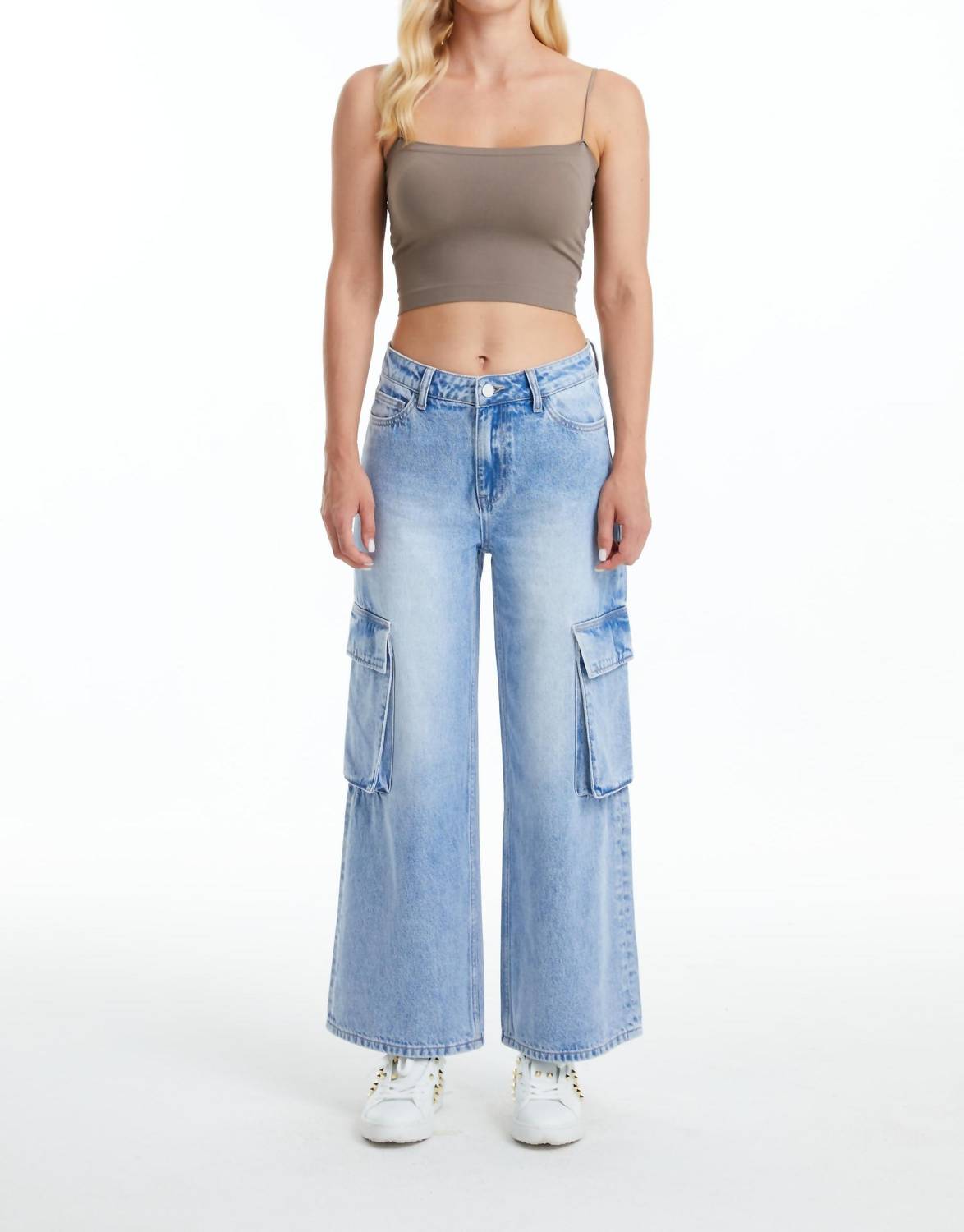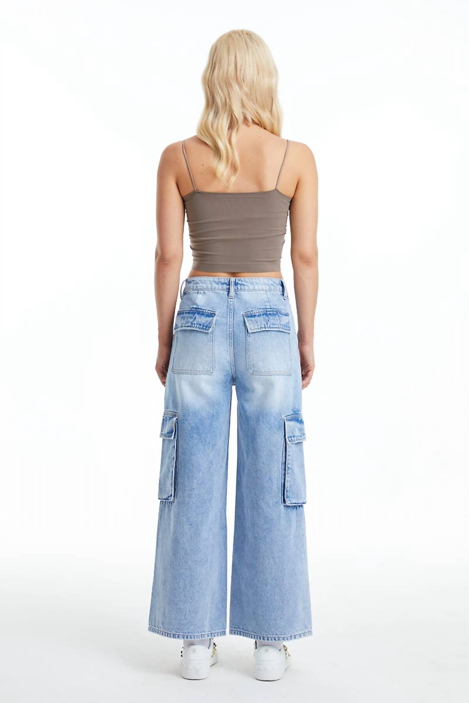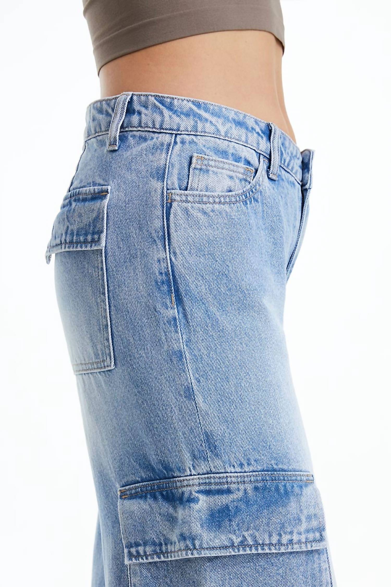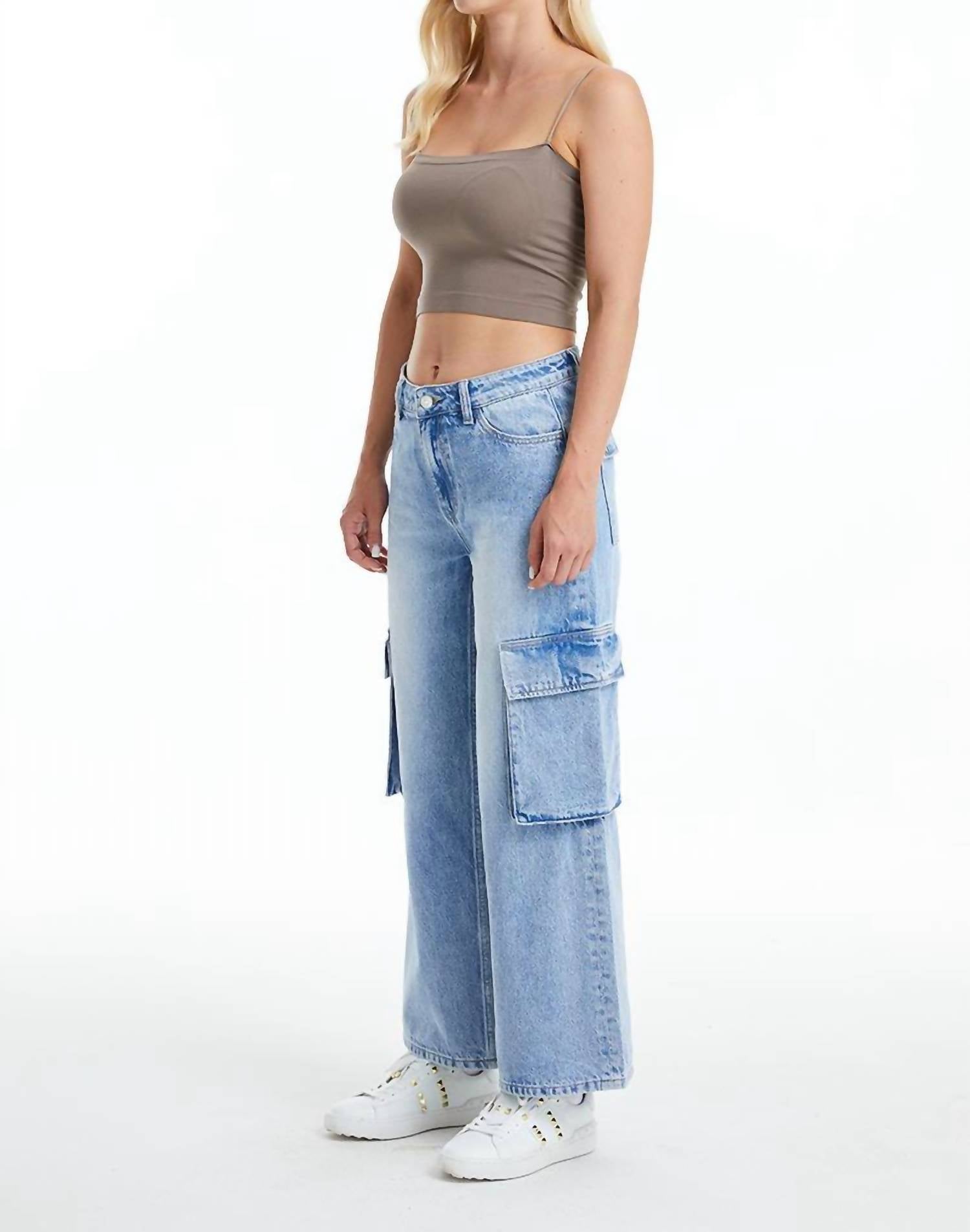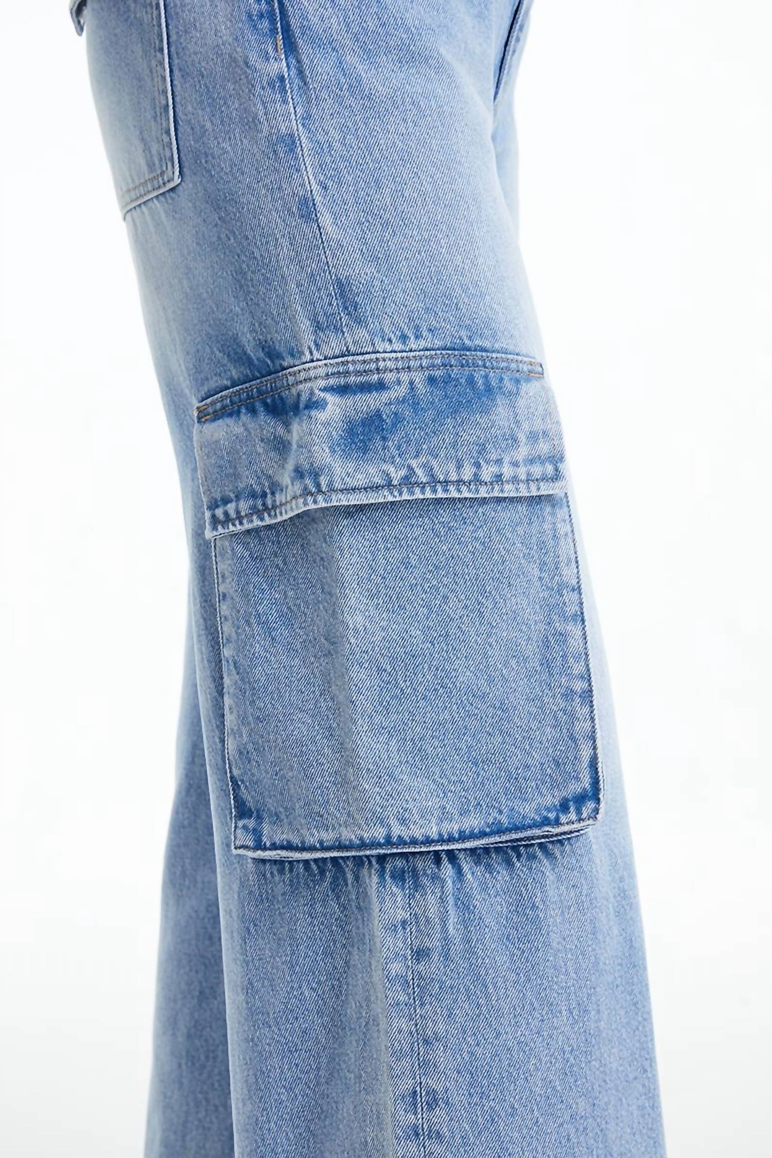 Just as cute as they are comfortable. Step out in style with the Tommi High Rise Wide Leg Flare Jeans by Bayeas, featuring a flattering retro-inspired look perfect for the fall season. This solid light blue piece is crafted from 100% cotton with a relaxed fit through the high-rise waist, complete with wide flare legs and practical cargo pockets. Made with a focus on both comfort and trend, these jeans feature a button closure for secure wear and boast a versatile ankle-length inseam. Care for this vintage-inspired essential by machine washing and tumble drying as needed.