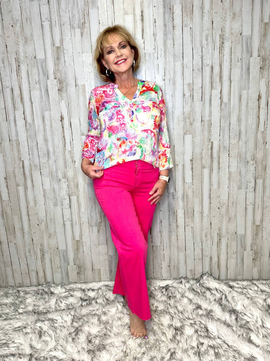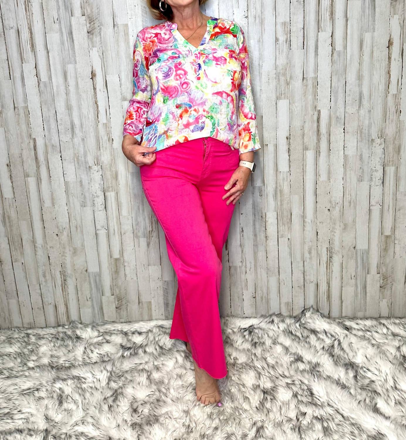 Pair these wide leg jeans with mules, slides or your favorite strappy sandals. Step into summer with the Time to Fiesta Flared Jean by Charlie B, perfect for adding a pop of color to your look. These twill jeans in vibrant pink offer a trendy raw edge and a classic flared leg design. Crafted from 98% cotton and 2% spandex, they provide just the right stretch for all-day comfort. Closure is a convenient zip style, and care is effortless with machine washing on a cold delicate cycle, hang drying, and low ironing recommended.