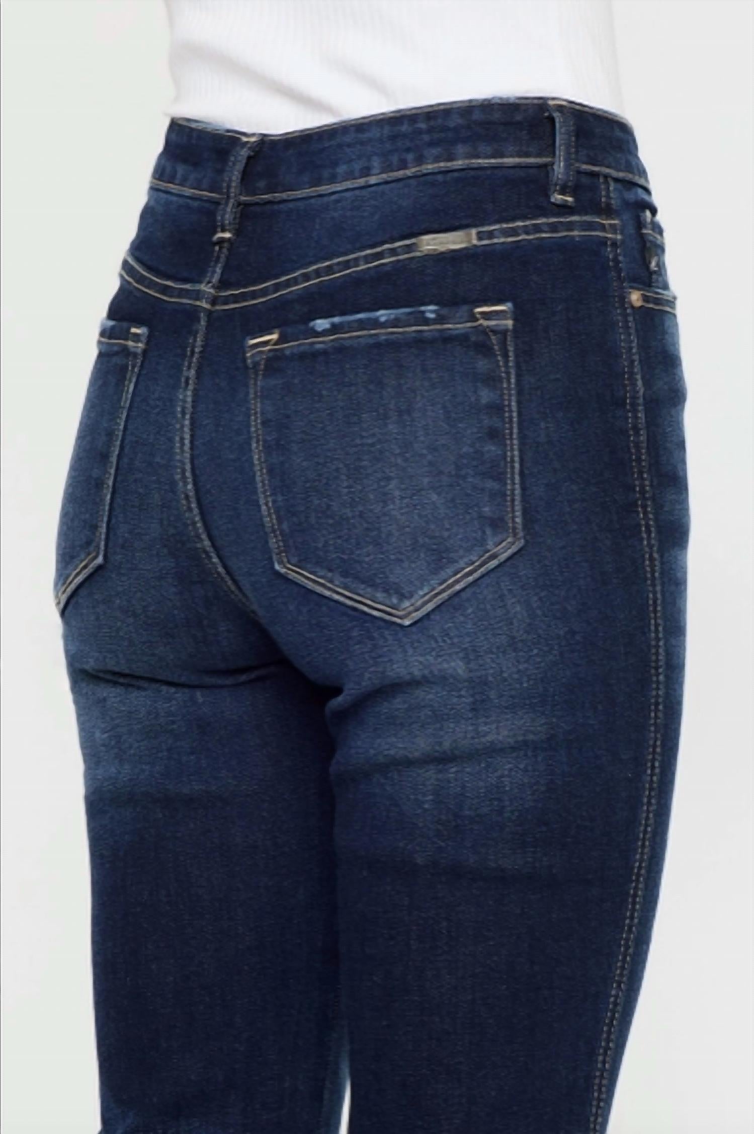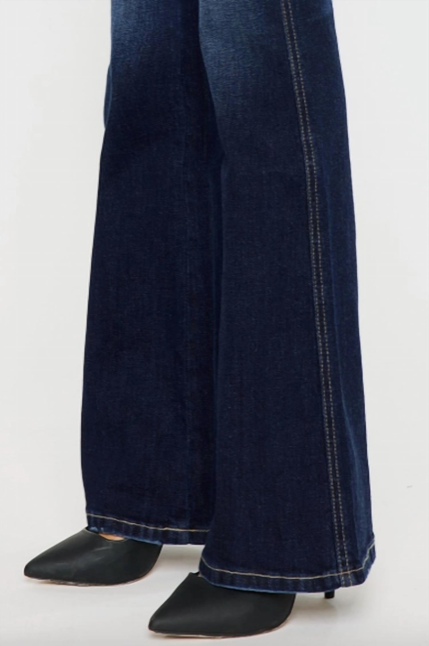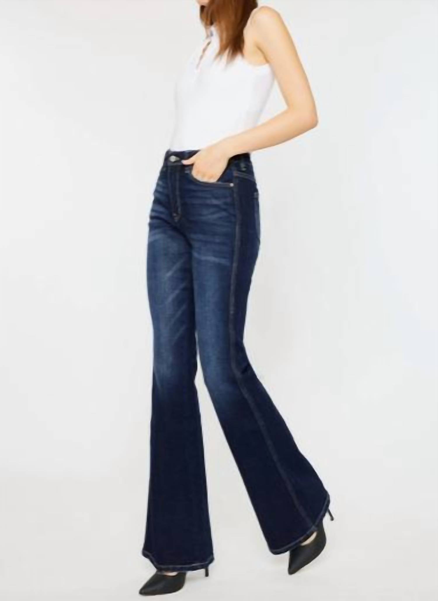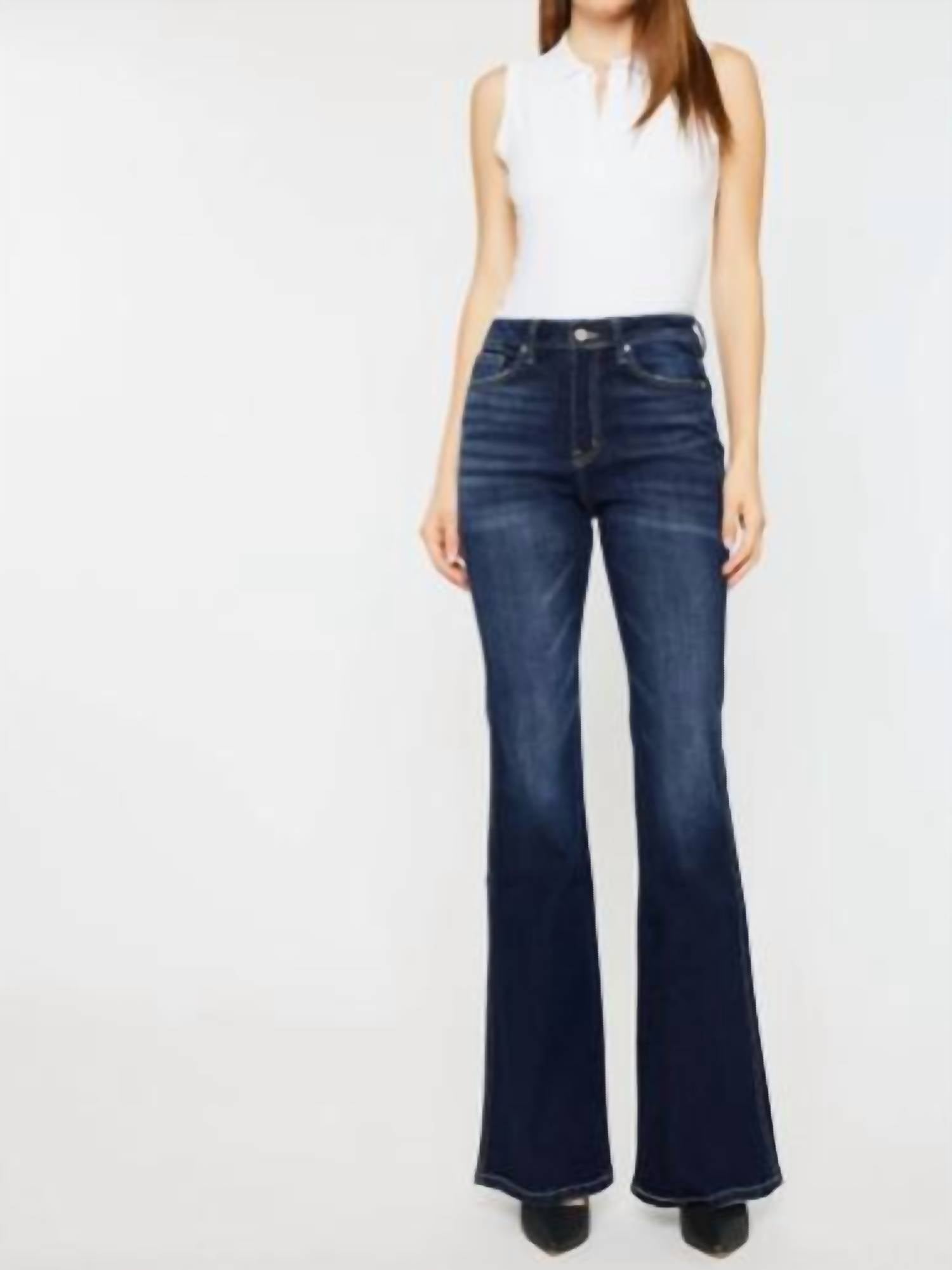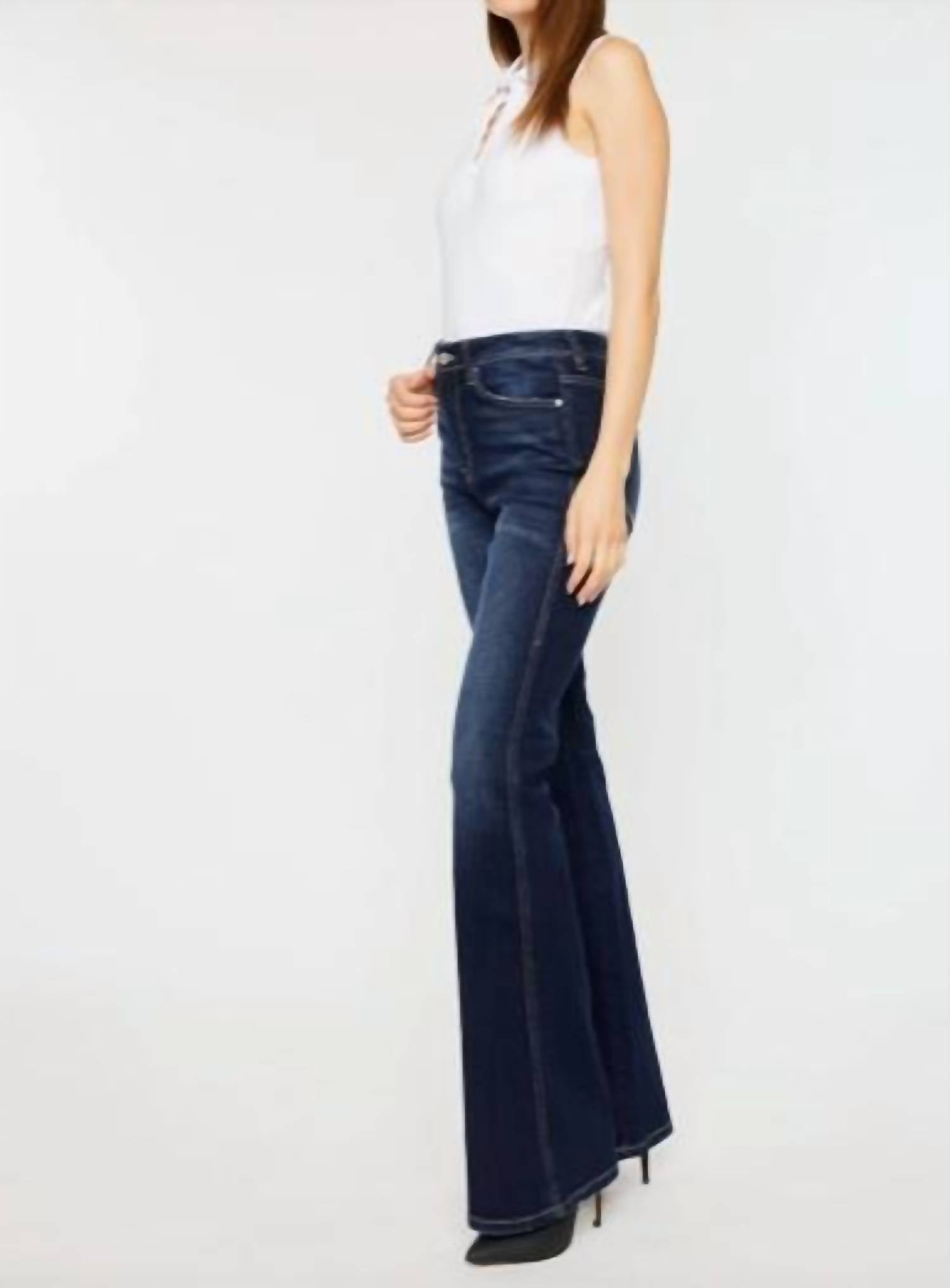 A flattering silhouette that's suprisingly versatile. Introducing the High Rise Flare Jeans by KanCan, a perfect addition to your streetwear collection, designed for style and comfort. These women's jeans feature a solid pattern with a regular fit and flared leg style, perfect for making a statement. Crafted from a cotton blend, they offer a high-rise design with a front rise of 10.5 inches and an inseam of 34 inches in size 3/25. Closure: Zip closure. Denim finish: Dark wash. Care: Machine wash, tumble dry.